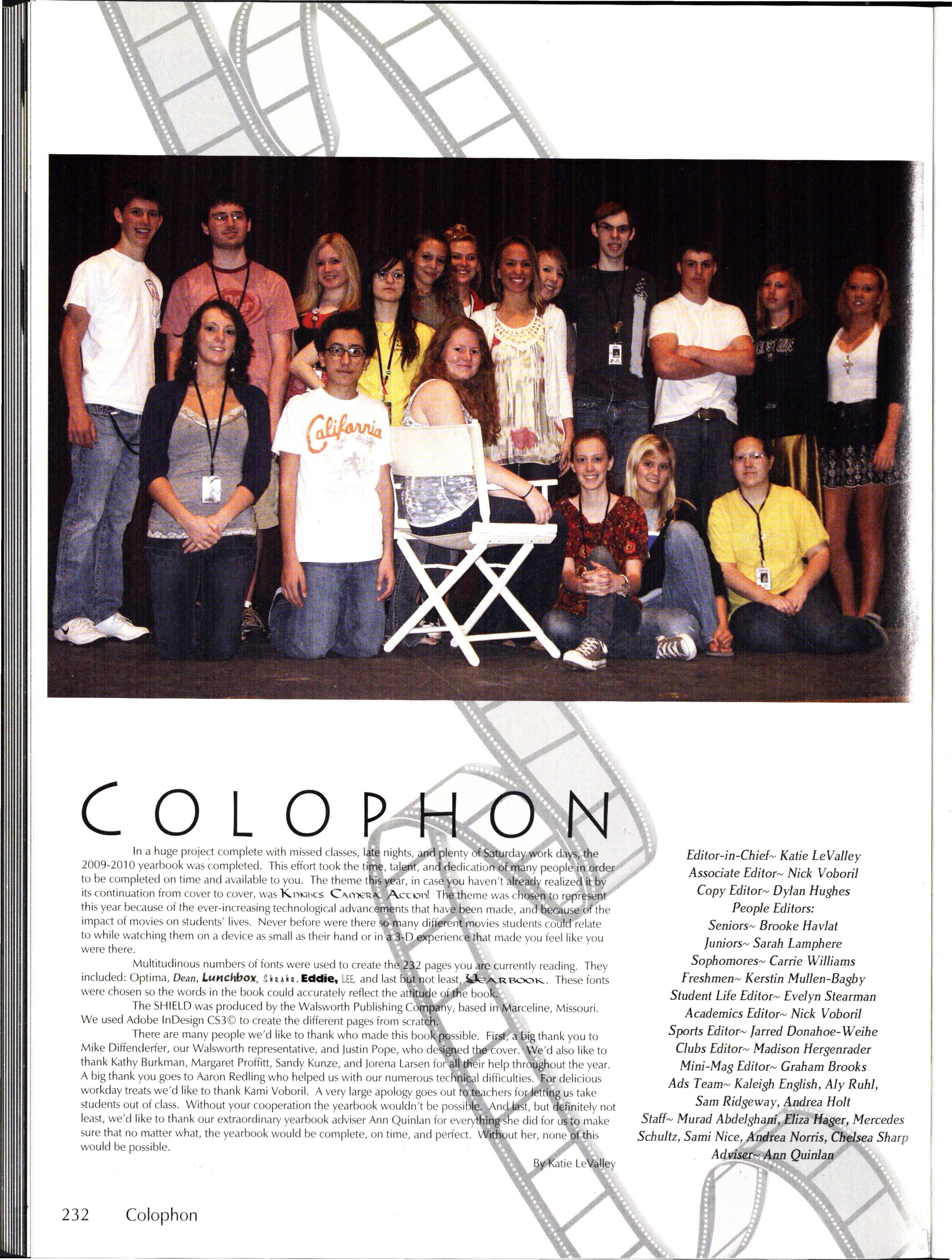 Th ere are many p eo p le w e' d li ke t o t hank w ho m ad e t h is boo p ss ib le. Fi rst, a bi g t hank yo u t o Mik e Di ffend erfe r, o u r Wal sw o rt h repr ese ntat ive, and Justin Po pe, w ho d e ign ed the cove r W e ' d also l ik e t o t han k Kat hy Bu rkm an, M argaret Pro ff itt, Sa nd y Kunz e, and Jo rena Larse n fo all t heir h elp thr ugho ut t he yea r A bi g t hank yo u go es t o Aa ro n Red li ng w ho hel ped us w ith o ur nu me ro us t e h nical d iff ic u lt i es For d e li c io us wo r kd ay t rea ts w e' d li ke t o t hank Kami Vobo ril. A ve ry large apo logy goes o ut teac h e rs fo r letttng us take stud ents o ut o f cl ass. W it ho ut yo u r coo perat io n t he yea rb oo k w o u ld n ' t be poss i e nd last , bu t efin it e ly no t leas t, we ' d lik e to t hank o ur ext raordin ary yea rboo k ad vise r Ann Qu i nlan for eve r in g s e did fo r us to make sure t hat no m atte r w hat, th e yea rboo k wo uld be co mp lete , o n t im e, and perfe ct. it hou t her, no ne of t h is wo uld be poss i bl e.