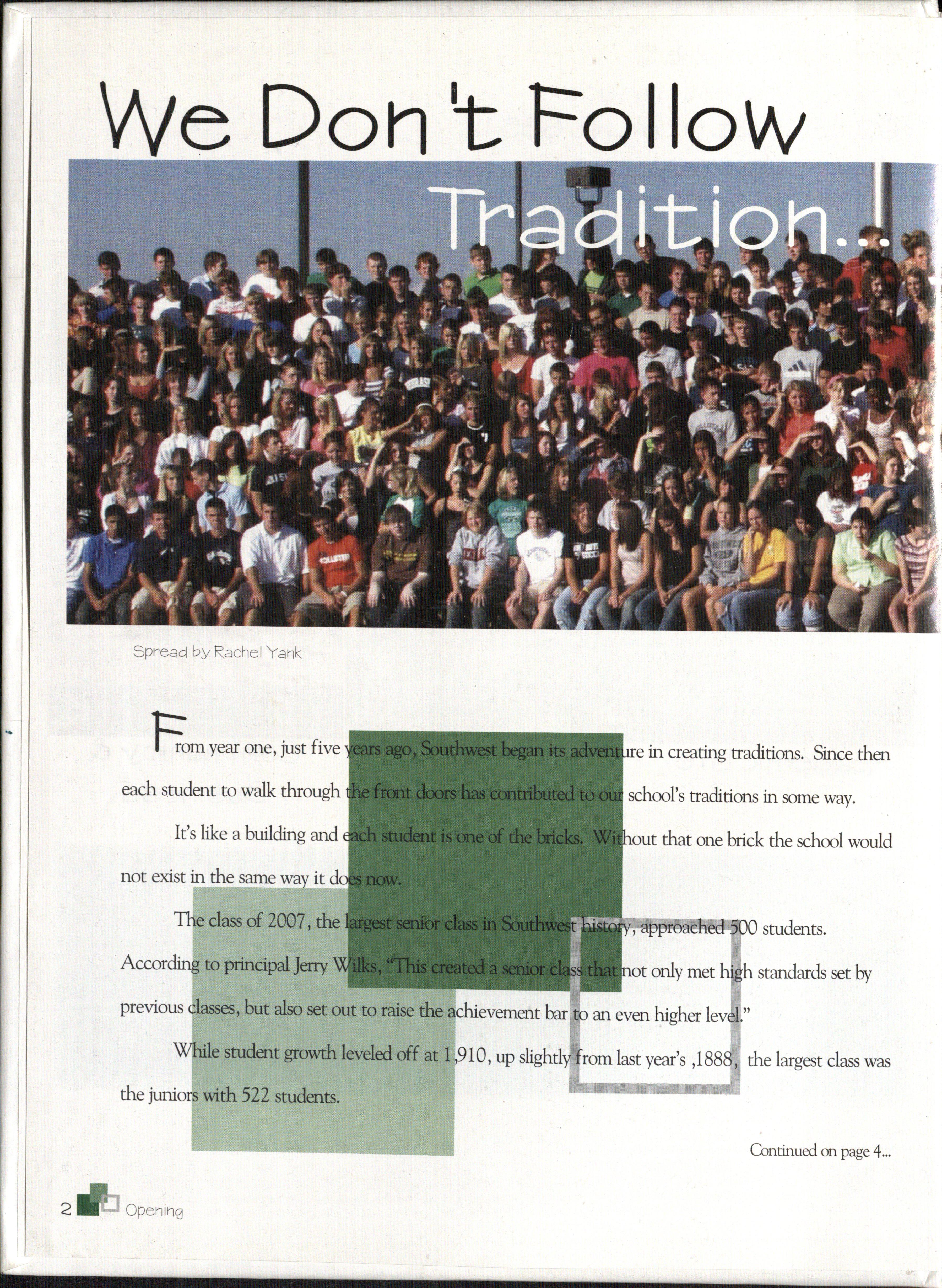 The year began Aug. 28 with the welcoming have homework again." She wasn't alone. of freshmen. With the school all to themselves, the While some classes were just beginning their class of 2010 learned where their classes were and high school experience, others were coming to an prepared themselves for high school life without end. With three years under their belt, the class of the upperclassmen. 2007 began their senior year.
