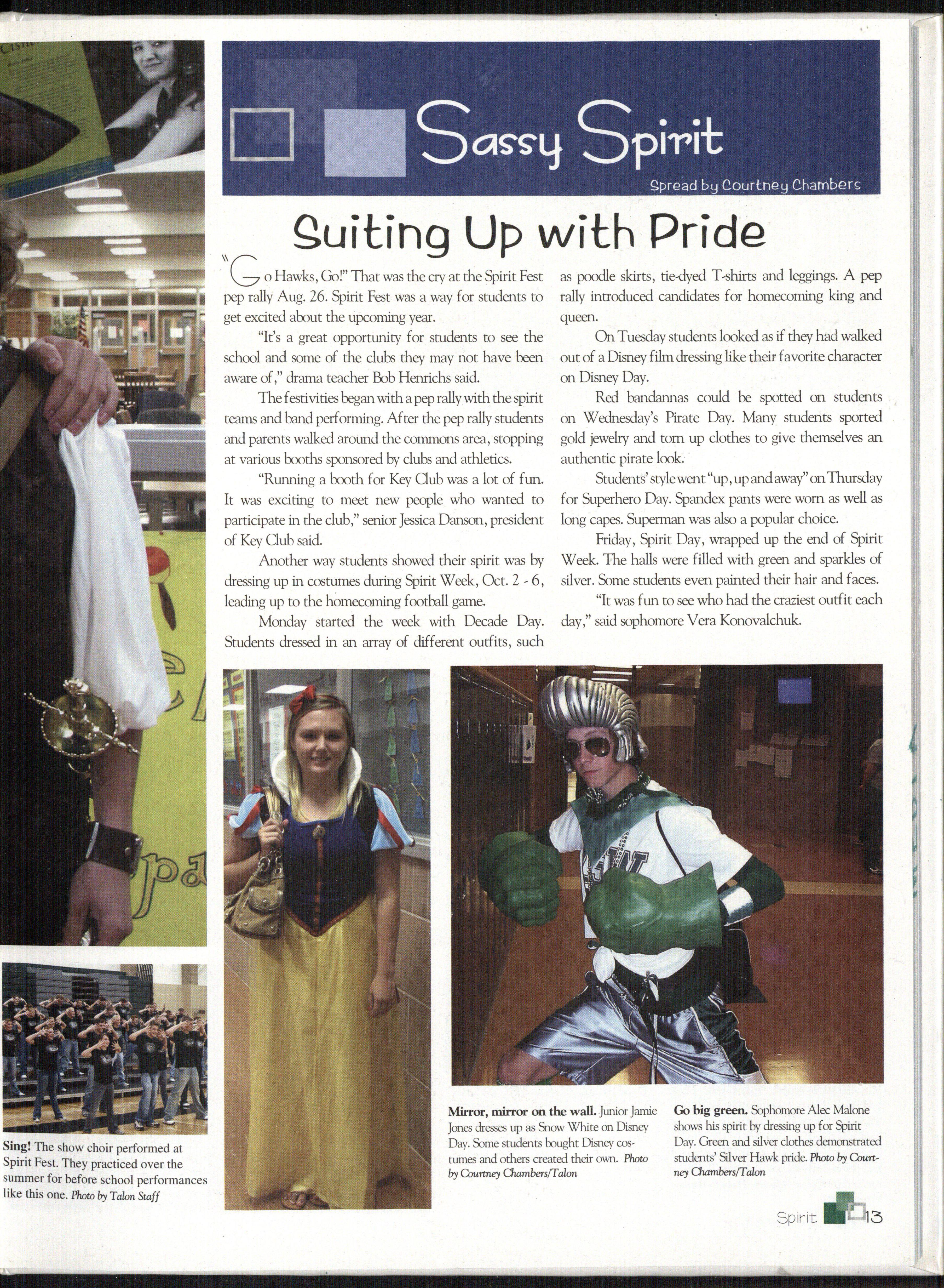 Sing! The show choir performed at Spirit Fest. They practiced over the summer for before school performances like this one. Photo by Talon Staff Mirror, mirror on the wall. Junior Jamie Jones dresses up as Snow White on Disney Day. Some students bought Disney costumes and others created their own. Photo by Onotney Oiambers/falonThe immense stream of brightness from the search light streaked across the sky, pointing the way to the big event. With high hopes and dance fever, students anticipated the big night. People filed in and walked the "green carpet."