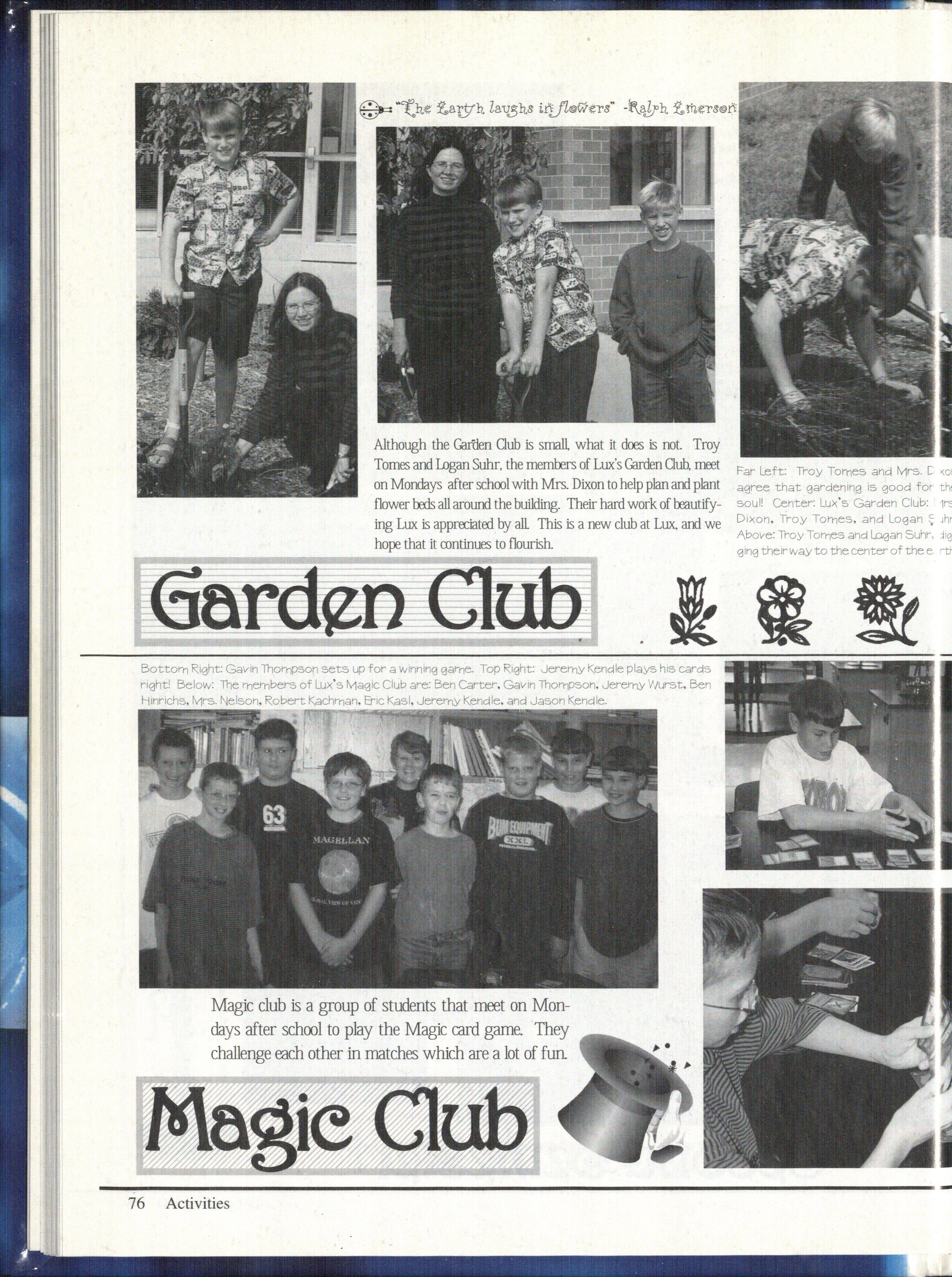 Although the Ga.men Oub is small what it dre; is not Troy Tomes and Logan Suhr, the memrers of Lux's Garden Oub, meet on Mondays after school with Mrs. Dixon to help plan and plant flower IB:ls all around the building. Their hard work of rei.utifying Lux is appm:iatro by all This is a new club at Lux, and we hope that it continues to flourish