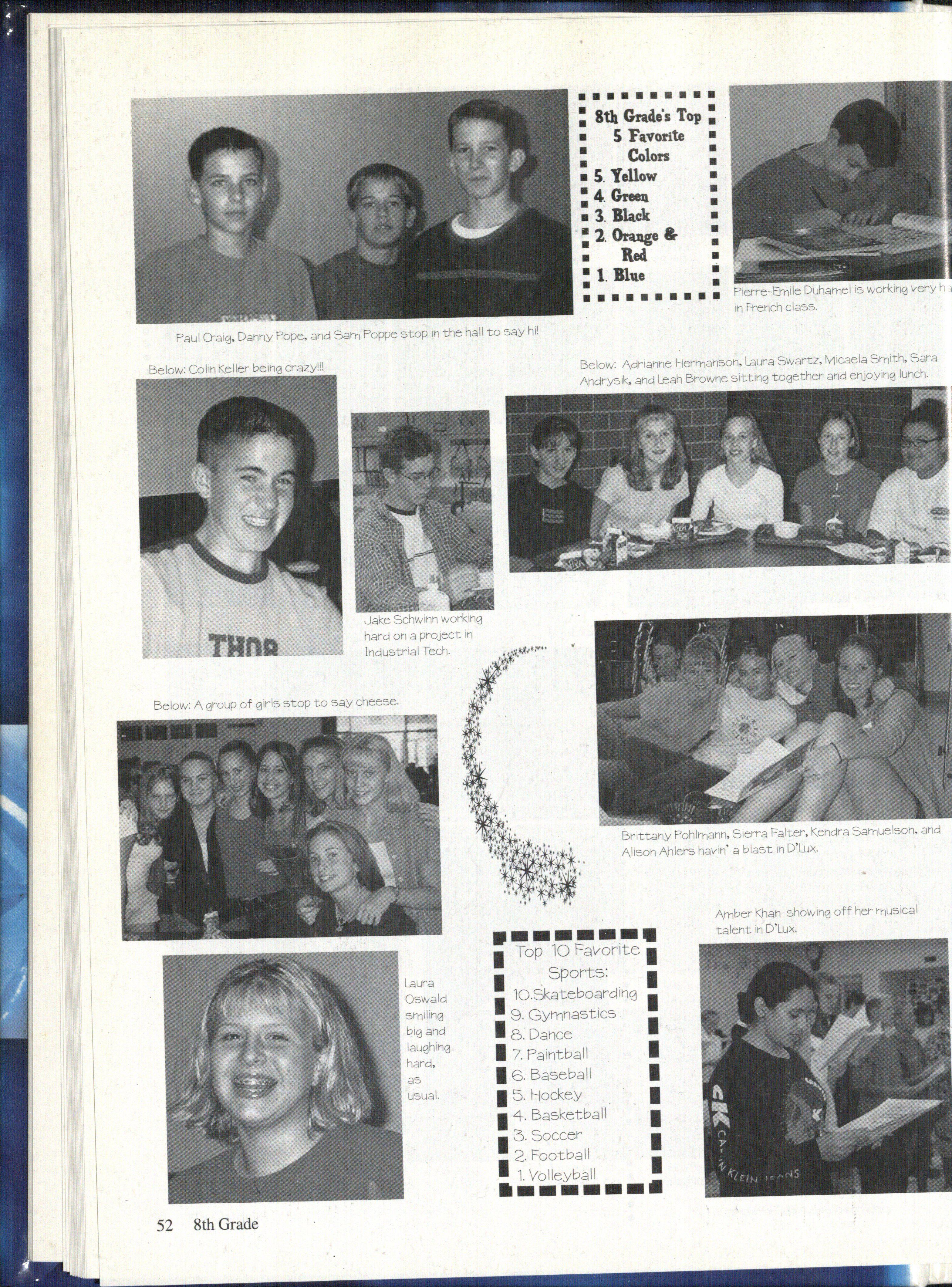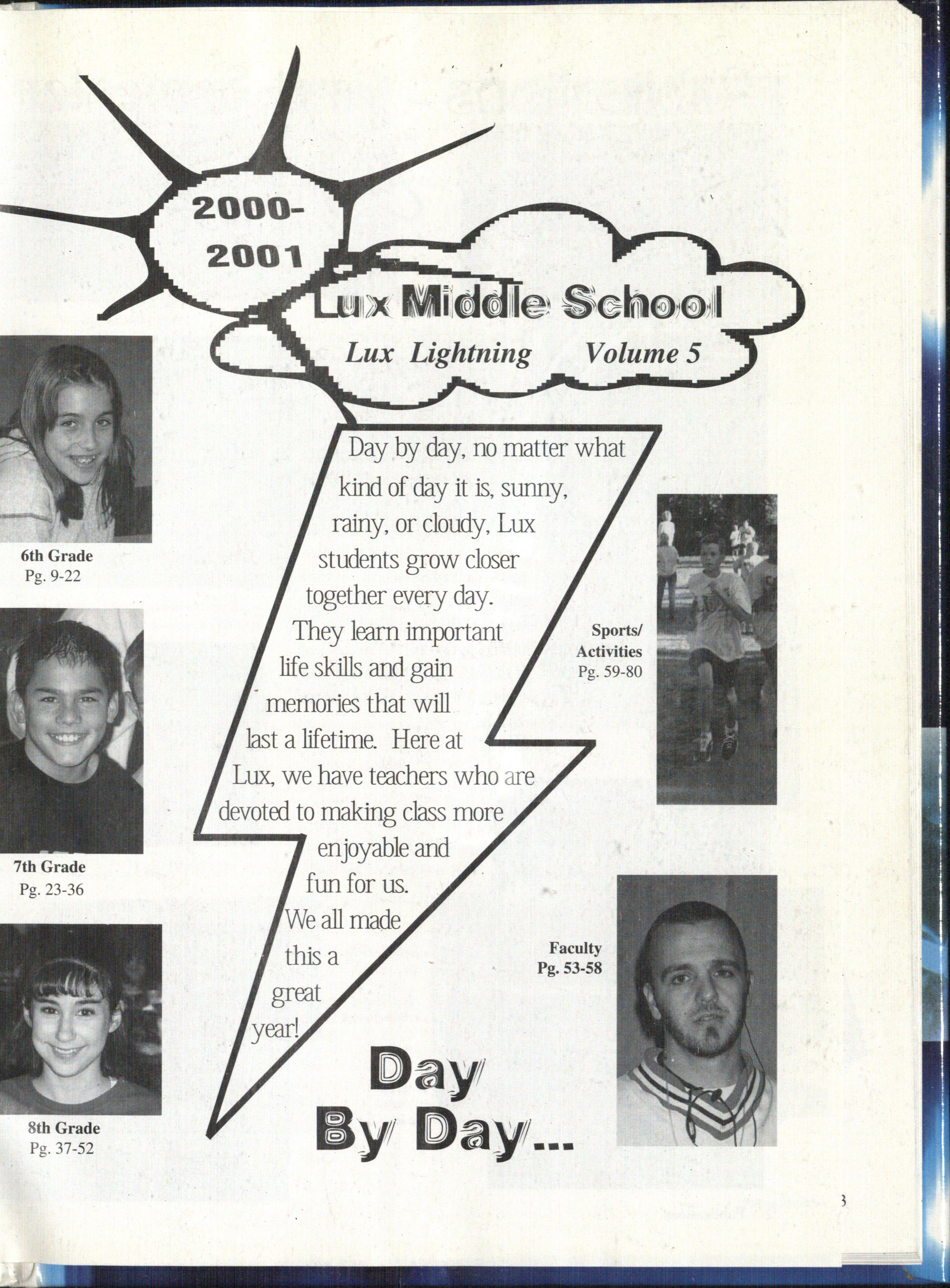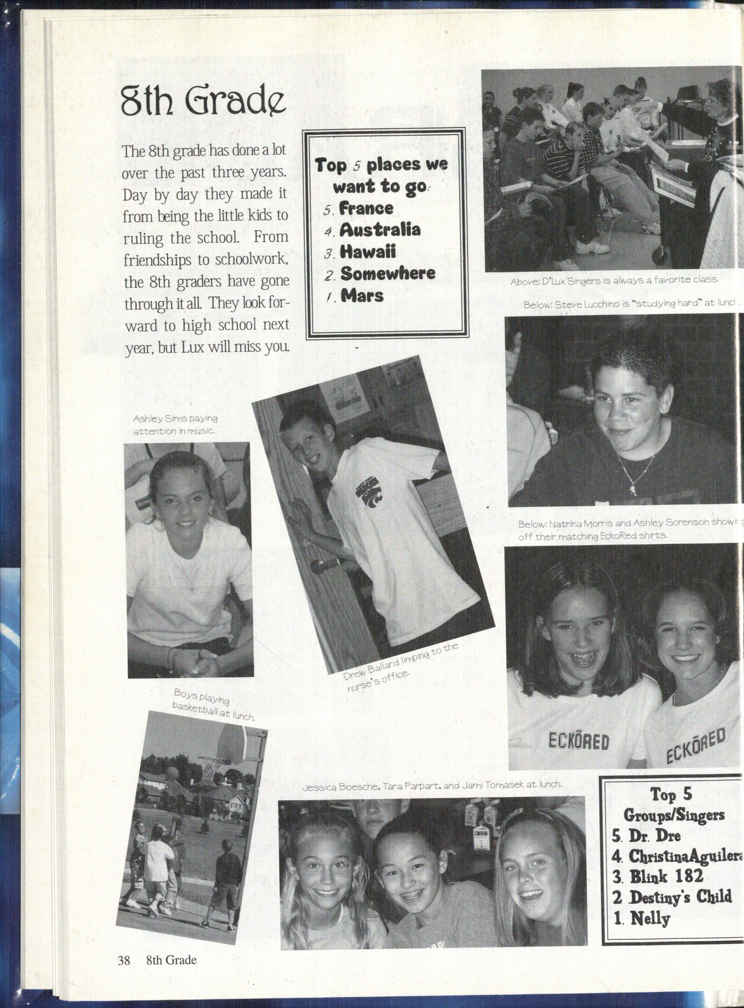 The 8th grade has done a lot over the past three years. Day by day they made it from reing the little kids to ruling the school. From friendships to schoolwork, the 8th graders have gone through it all They look forward to high school next year, but Lux will miss you