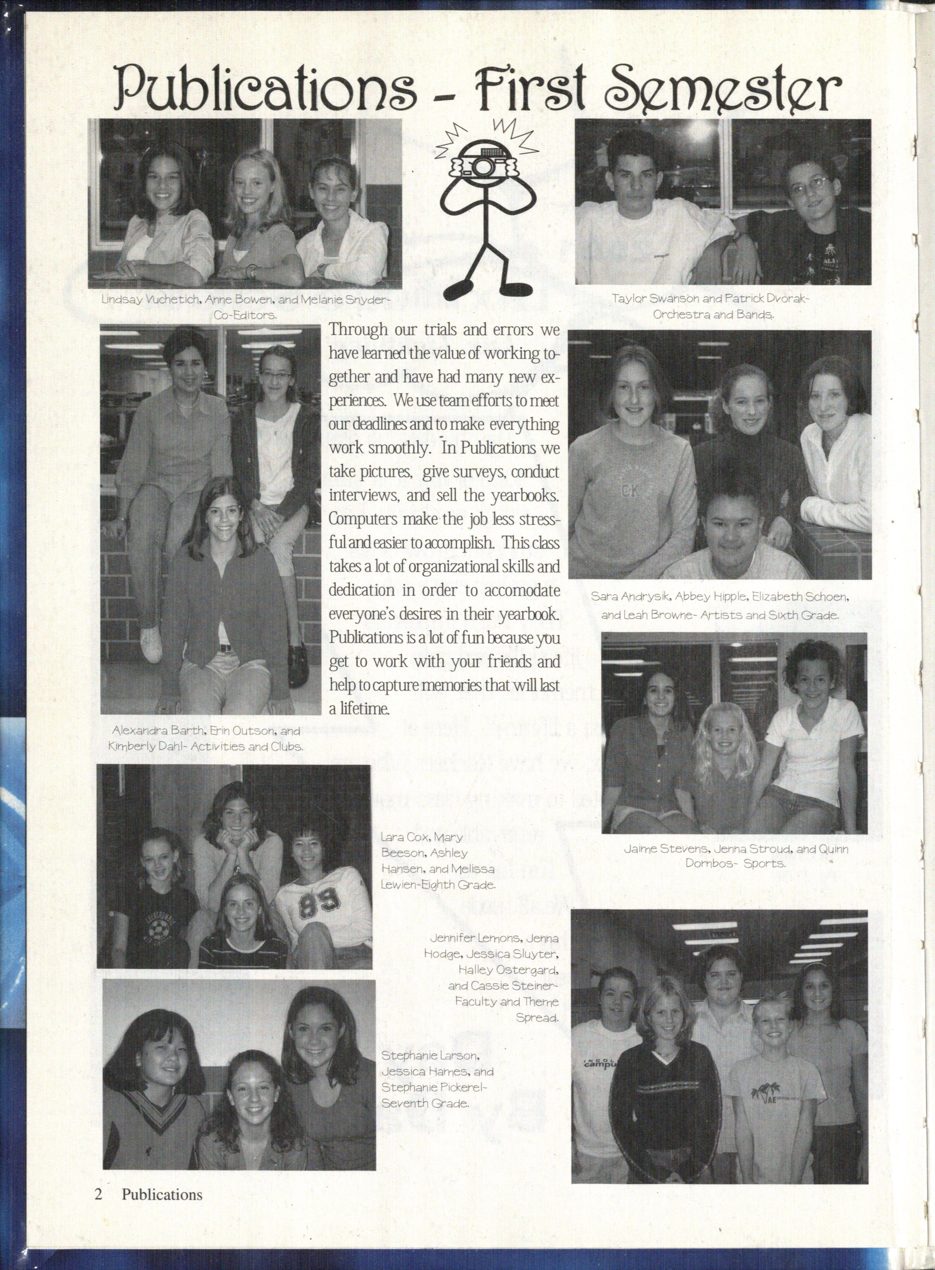 In second semester publications, class memlffs workErl hard to create interesting and unique news:µipers for the students of Lux Middle &hool They strivro to make the news:µipers fun and something people would want to read They also helped to finish up yearl:mk :µiges and organizoo the yearl:mks for distribution at the errl of the year. Oass memlffs are listErl by the sections for which they were in charge.