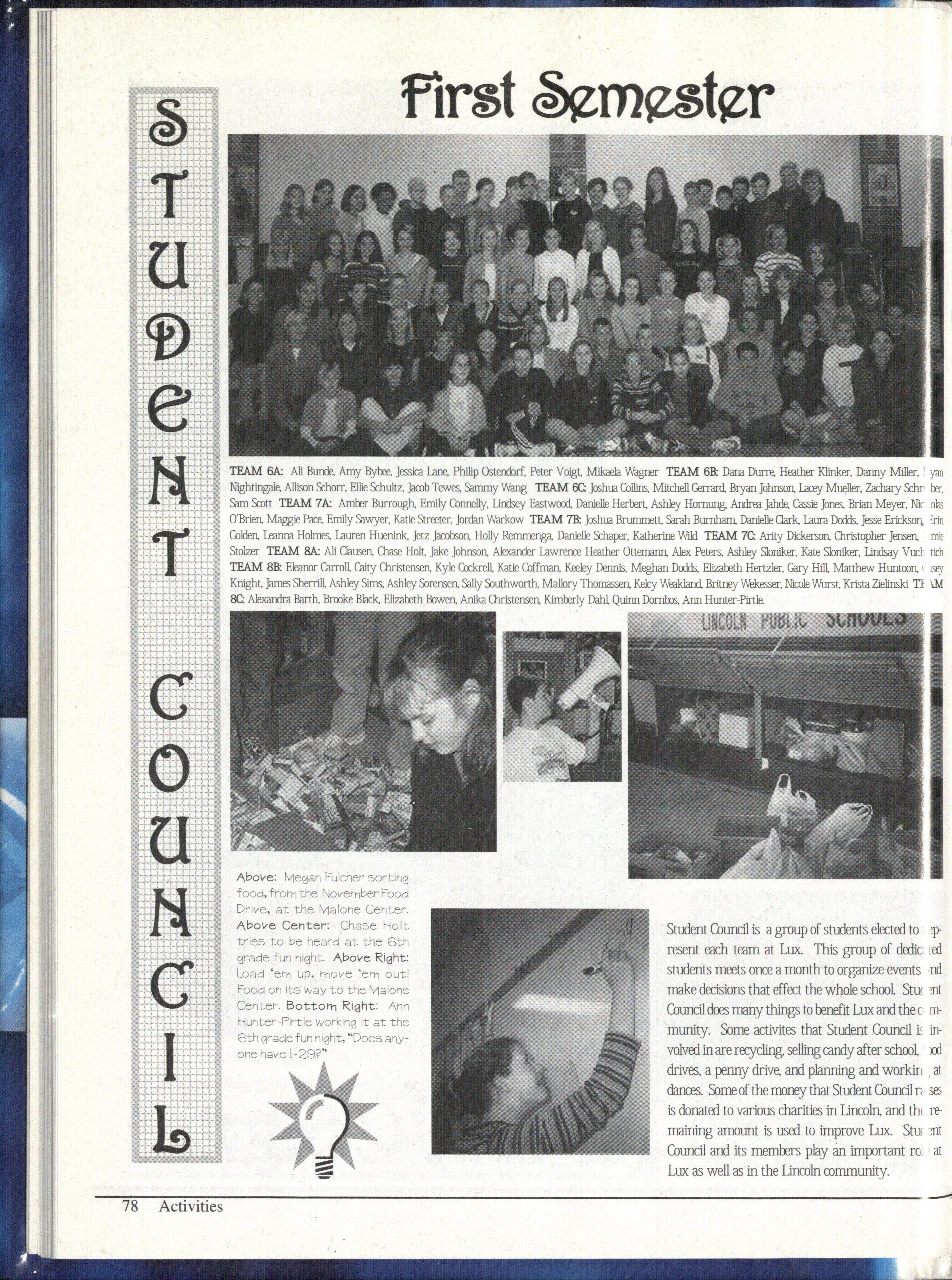 Student Council is a group of students electro to present each te.am at Lux. Trus group of dErlic [OO students mrets once a month to organize events nd make drosions that effo:t the whole school Stlli nt Council does many things to ~nefit Lux and the c mmunity. Some activites that Student Council r. involvErl in are rn:ycling, selling candy after school xxi chives, a penny chive., and planning and work.in , at dances. Some of the money that Student Council rc ses is donatErl to various charities in Lincoln. and th t remaining amount is usErl to improve Lux. Stu nt Council and its memrers play an important ro. at Lux as well as in the Lincoln community