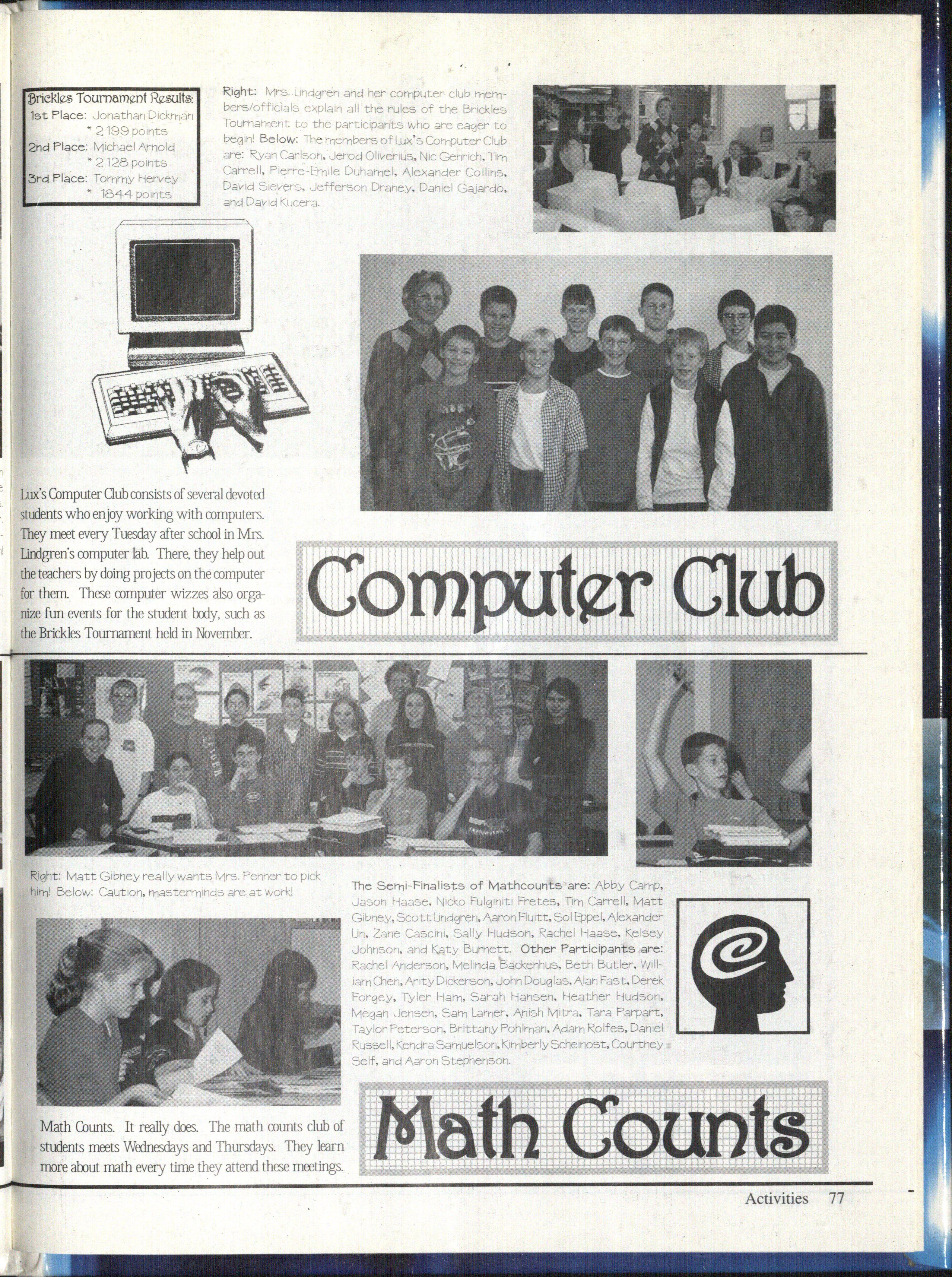 Lux's Computer Oub consists of several devotro students who enjoy working with computers. They meet every Tuesday after school in Mrs. Lindgren's computer lab. There, they help out the teachers by doing projects on the computer for them These computer wizzes also organize fun events for the student body, such as the Brickles Tournament held in November.