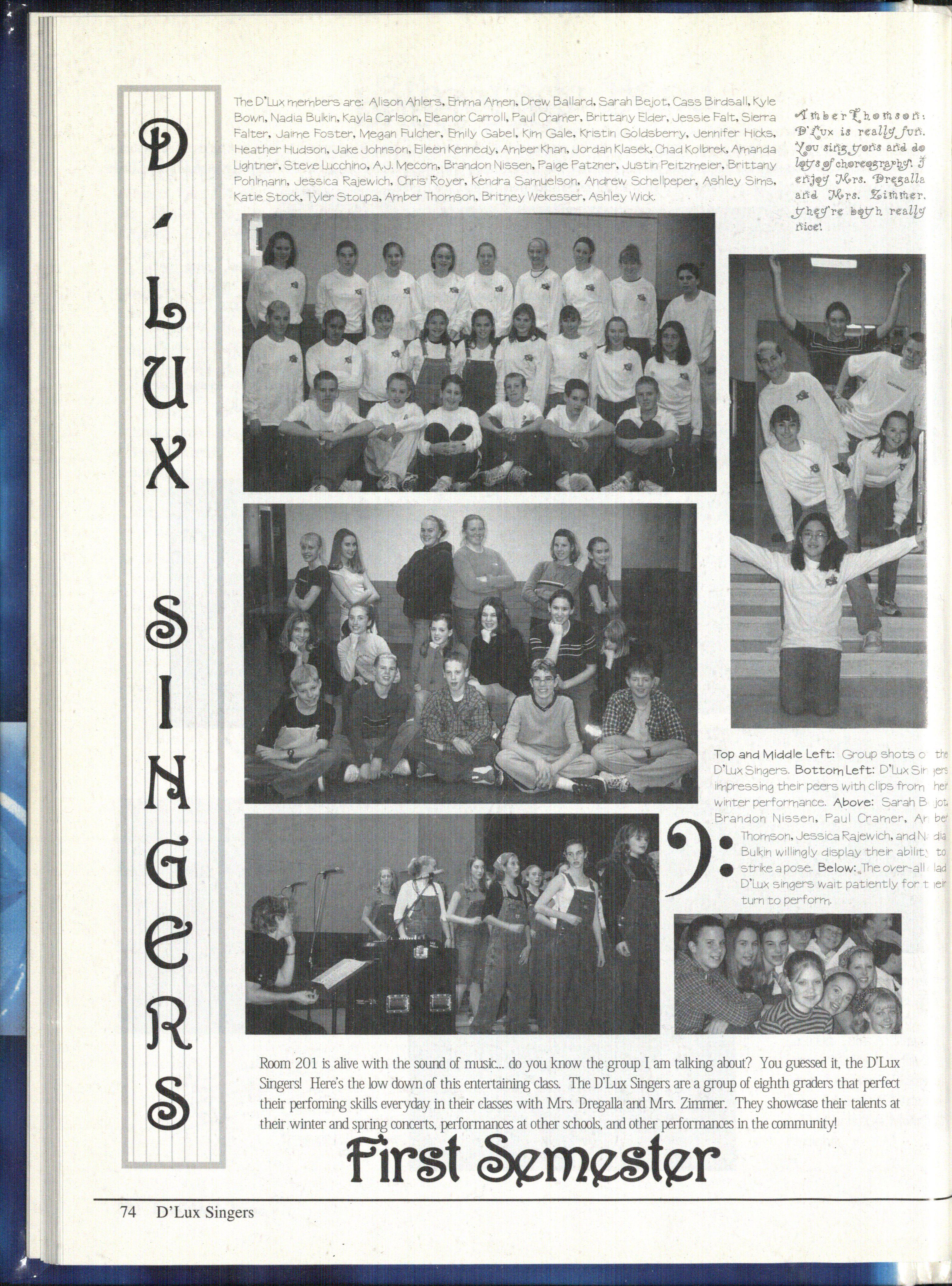 Room 201 is alive with the sound of music. do you know the group I am talking aoout? You guessed it the D'Lux Singers! Here's the low down of this entertaining class. The D'Lux Singers are a group of eighth graders that perfect their perfoming skills everyday in their classes with Mrs. Dregalla and Mrs Zimmer. They showcase their talents at their winter and spring concerts. performances at other schools. and other performances in the community!