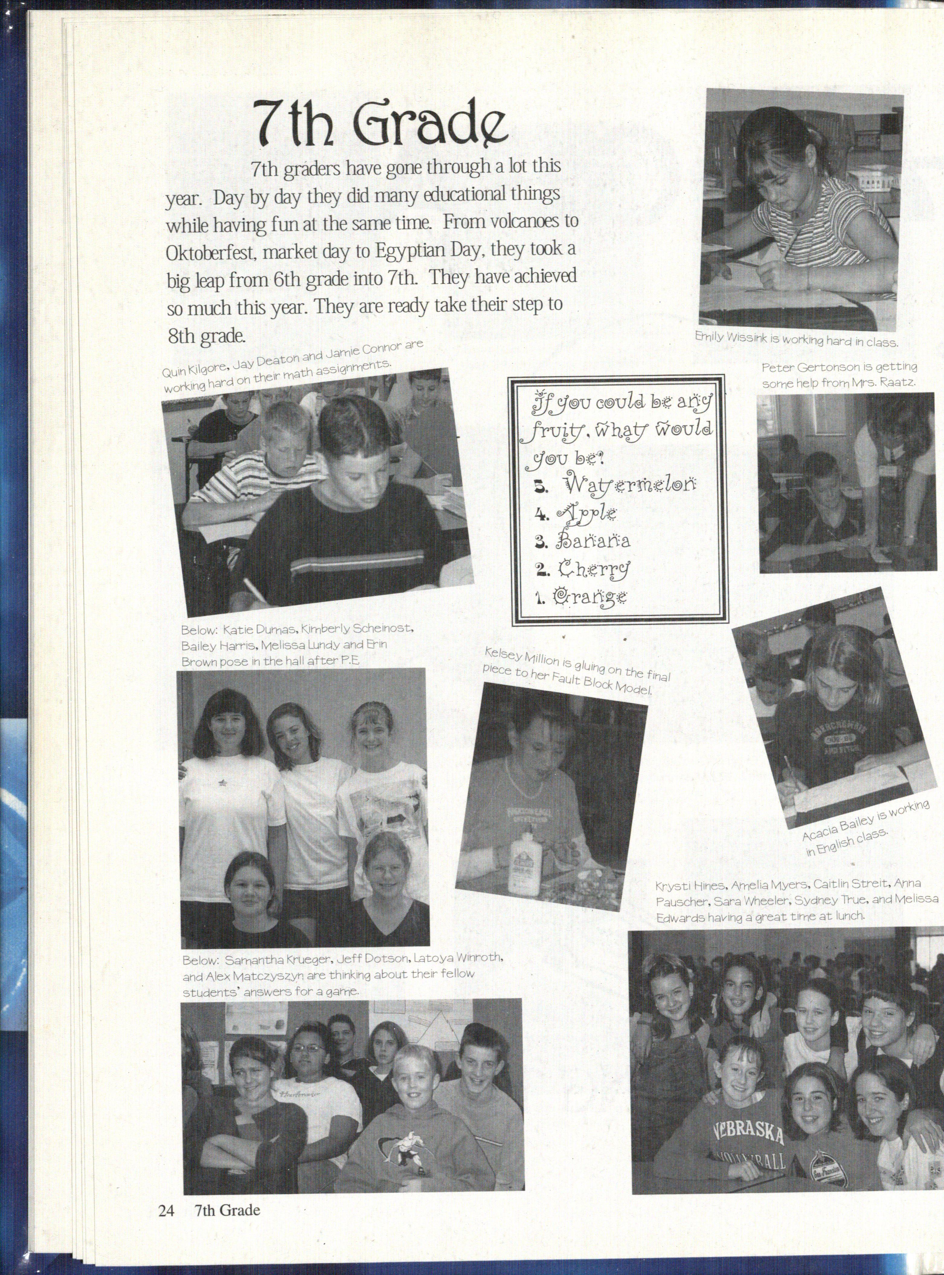 7th graders have gone through a lot this year. Day by day they did many educational things while having fun at the same time. From volcanoes to Okto~rfest, market day to Egyptian Day. they took a big leap from 6th grade into 7th. They have achieved so much this year. They are ready take their step to 8th grade.