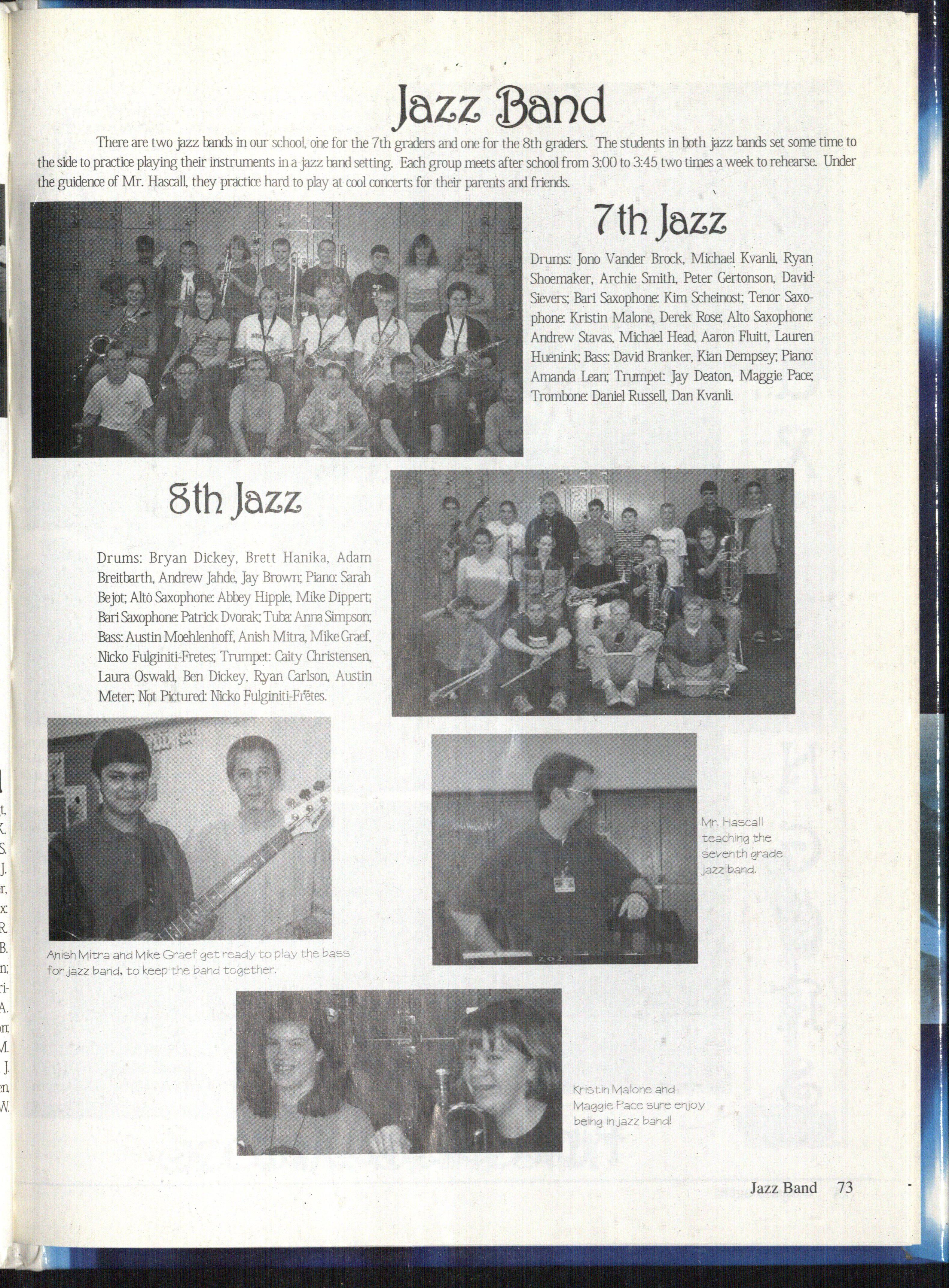 There are two jazz rands in our school one for the 7th graders and one for the 8th graders. The students in ooth jazz oonds set some time to the side to practice playing their instruments in a jazz rand set ting. Each group rnrets after school from 3:00 to 3: 45 two times a wrek to rehearse. Under the guidence of Mr. Hascall they practice ha_r:d to play at cool concerts for their µirents and friends.