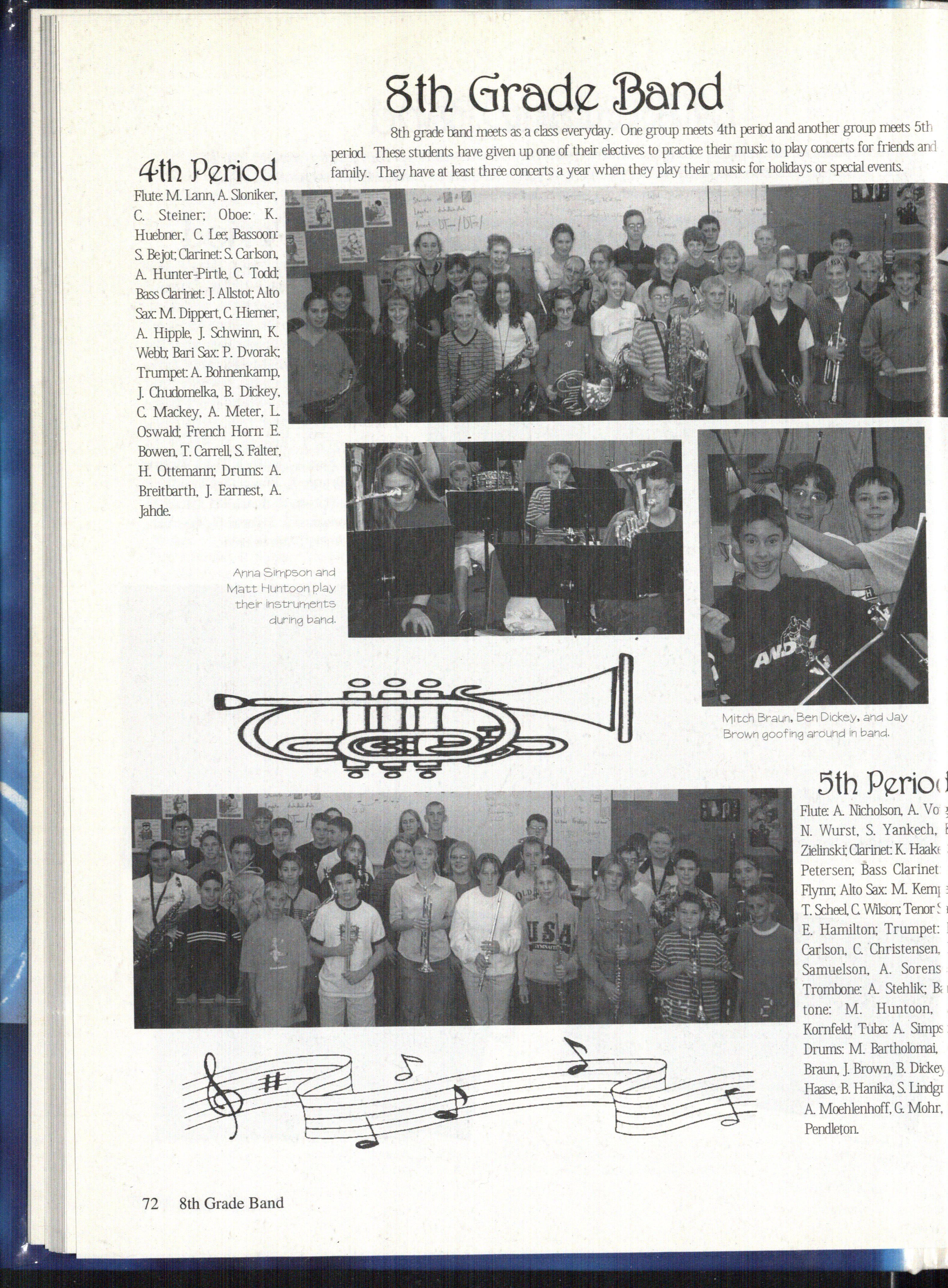 8th grade rnnd meets as a class everyday One group meets 4th period and another group meets 5th pericrl These students have given up one of their electives to practice their music to play concerts for friends and family. They have at least three concerts a year when they play their music for holidays or special events.