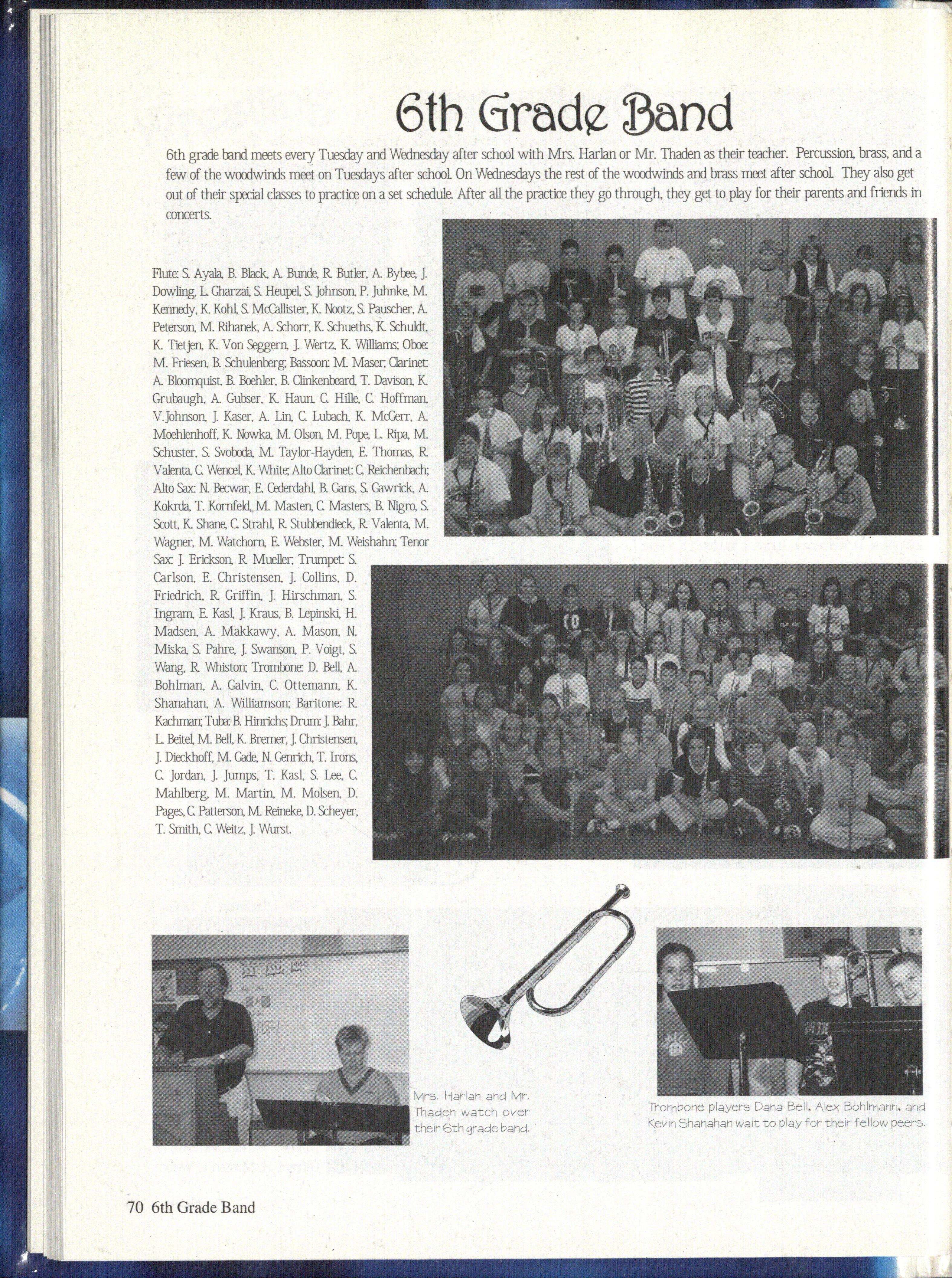 6th grade rand meets every Tuesday and Woonesday after school with Mrs. Harlan or Mr. Thaden as their teacher. Percussion brass, arid a few of the woodwinds meet on Tuesdays after school On Woonesdays the rest of the woodwinds and brass meet after school They also get out of their sp;rnl classes to practice on a set schoo.ule. After all the practice they go through, they get to play for their r,erents and friends in concerts.