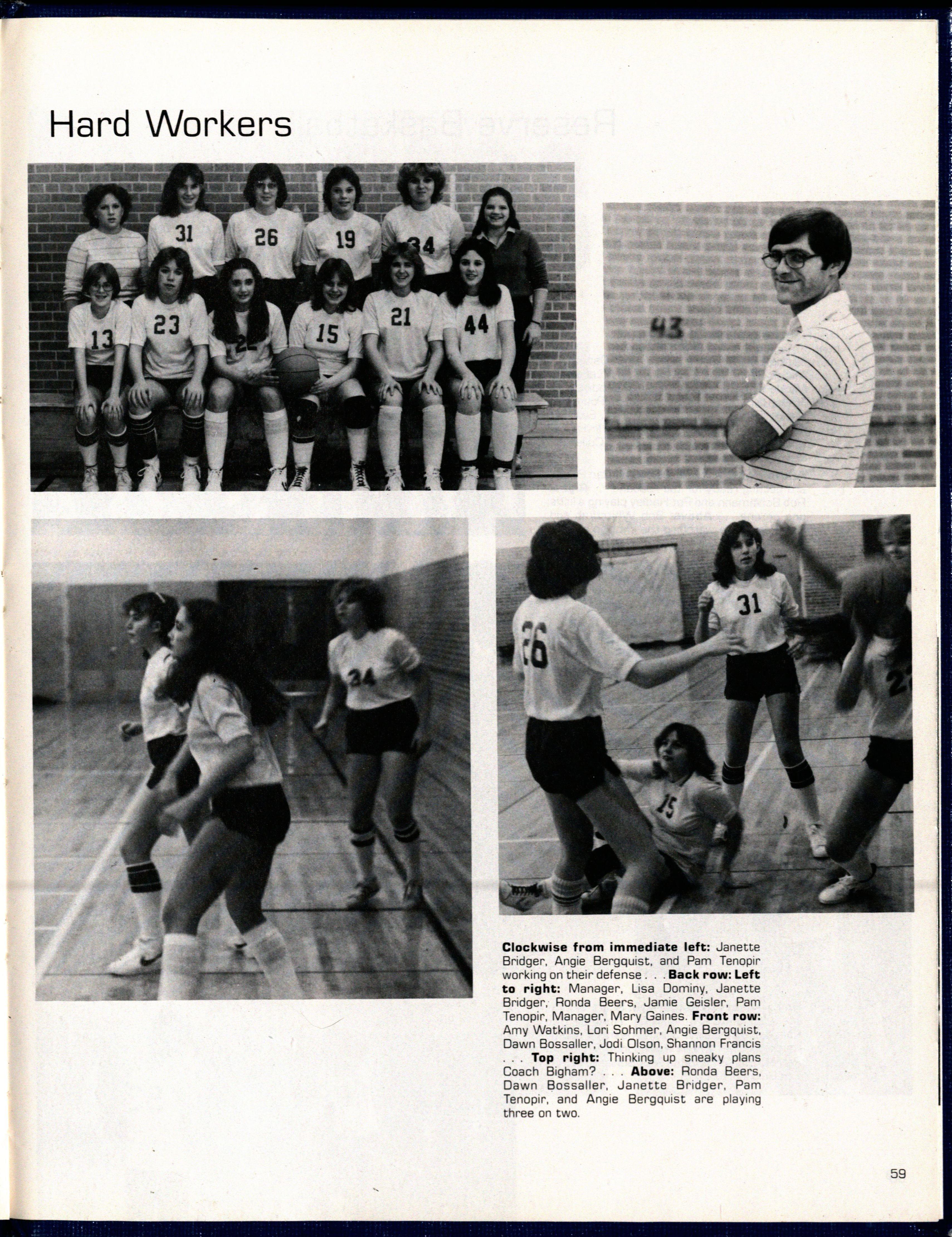 Clockwise from immediate above: Ronda Beers is always ready for the ball ... Back Row: Coach, Mrs Motz, Pam Tenopir, Joyce Grant, Janette Bridger, Kristi Walek, Student managers Jill Russell and Robin Huffman