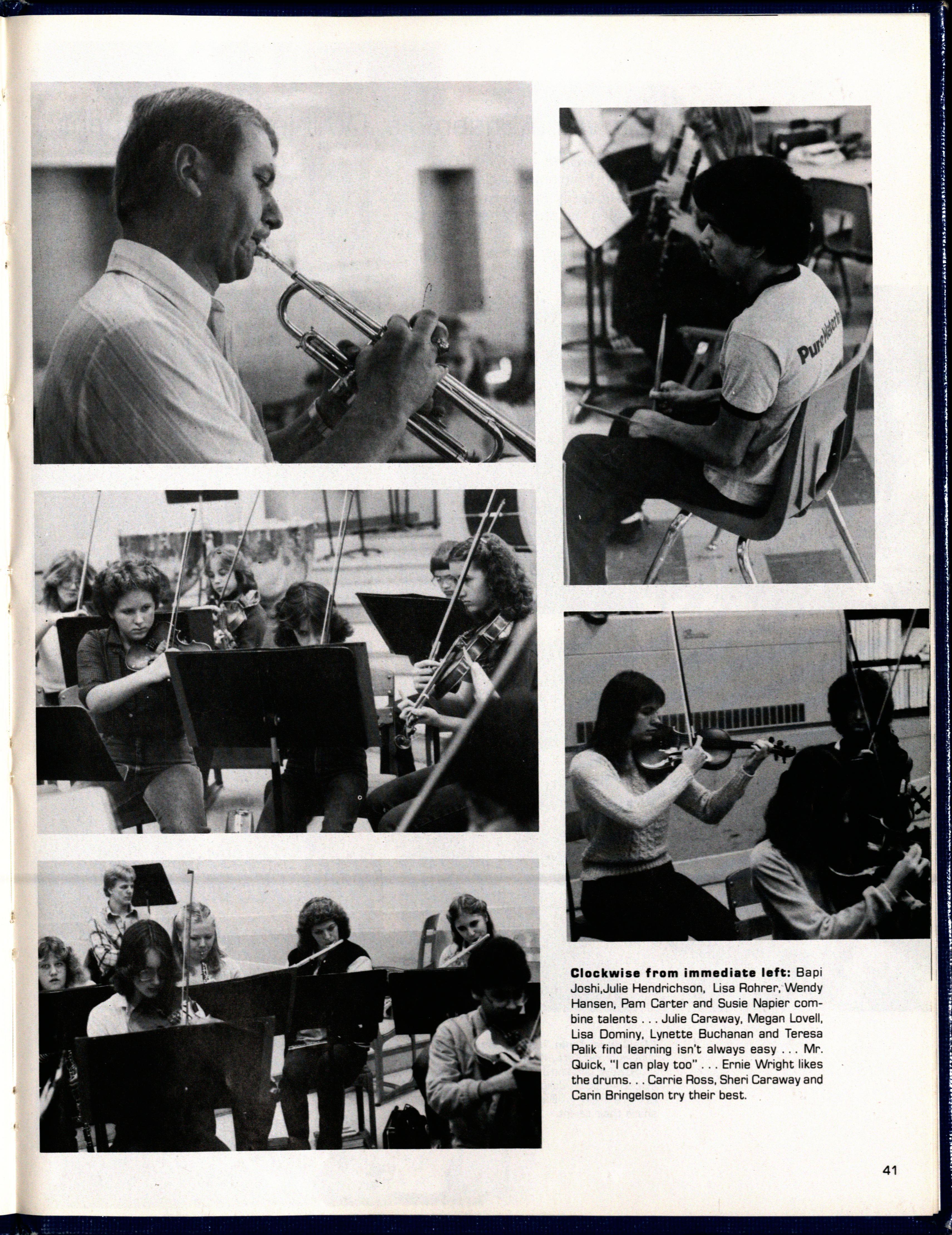 Clockwise from immediate left: Bapi Joshi.Julie Hendrichson, Lisa Rohrer, Wendy Hansen, Pam Carter and Sus ie Napier combine talents Julie Caraway , Megan Lovell, Lisa Dominy, Lynette Buchanan and Teresa Palik find learning isn't always easy Mr. Quick, " I can play too" Ern i e Wright likes the drums Carrie Ross, Sher i Caraway and Carin Bringelson try their best