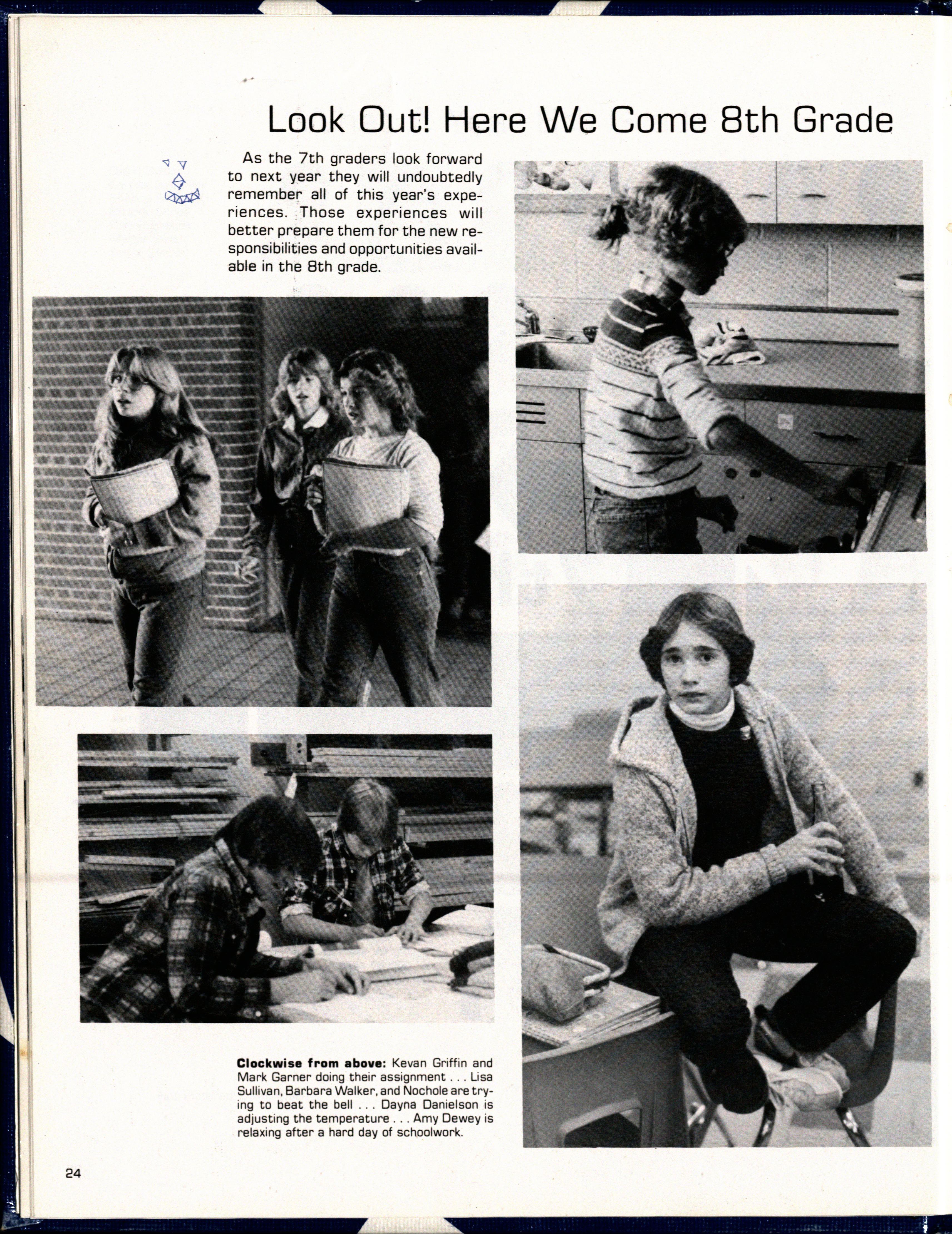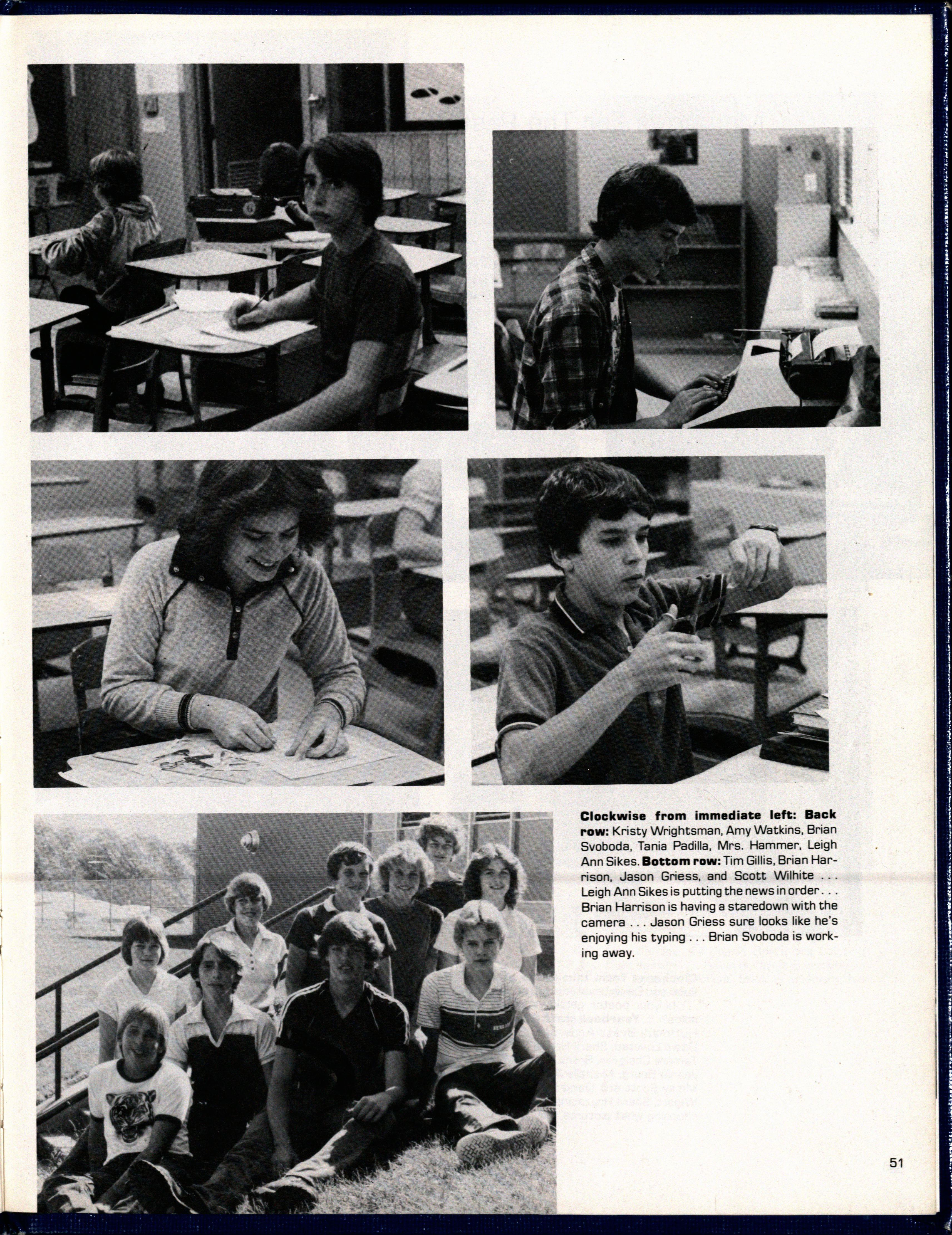 Clockwise from immediate above: Brian Svoboda ' s f lying fingers Amy Watk ins i s typ ing the news and Kr i sty Wr i ghtsman i s wr it ing the news Mrs Hammer i s rereadi ng Tan ia Pad illa ' s work Amy Watk ins and Le igh Ann Sikes l ook li ke they are enjoy i ng fo ldi ng the paper Tim Gilli s , Scott Wi lhi te and Jason Gr iess are tak ing the ir work ser iously.