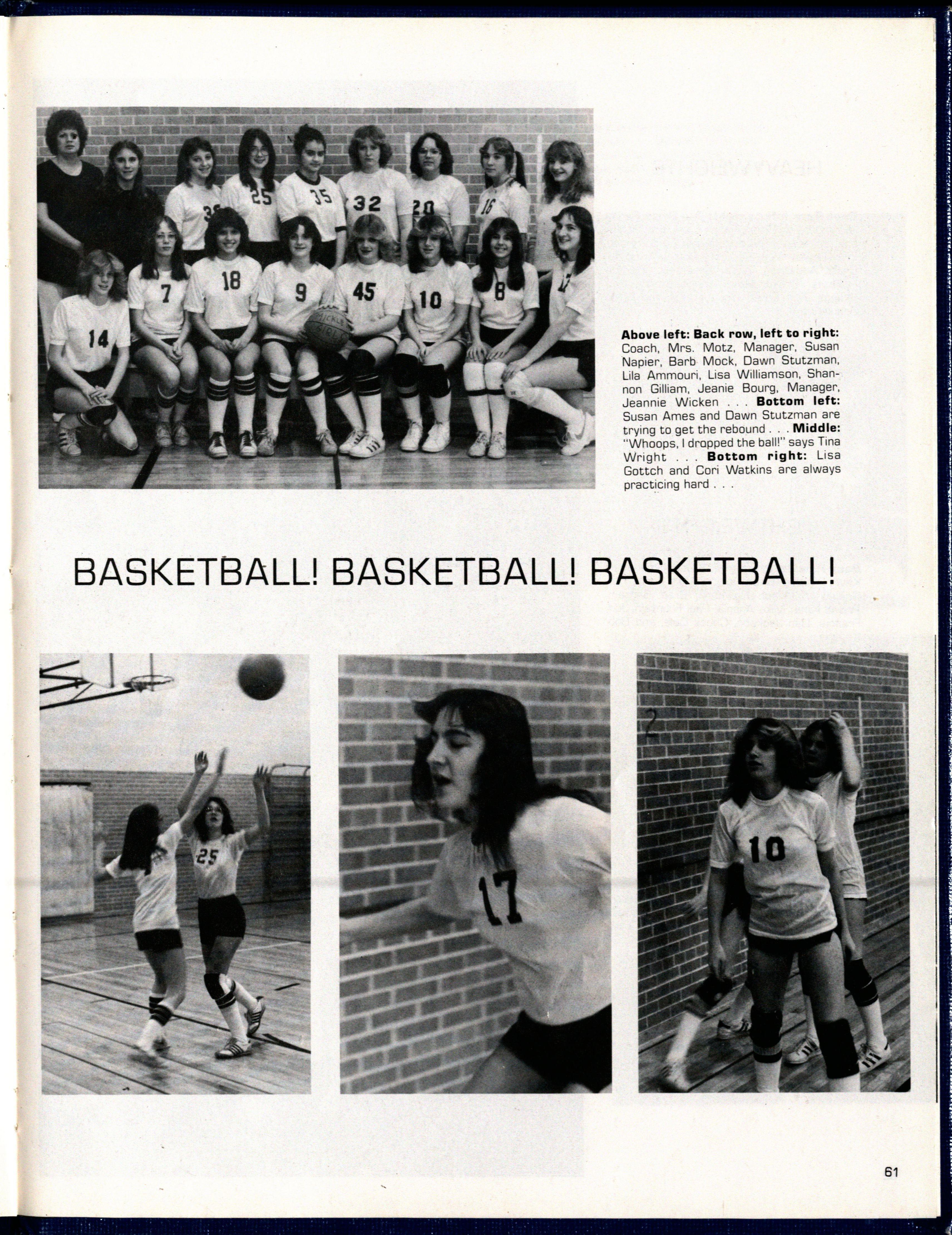 Above left: Back row , left to right: Coach , Mrs Motz , Manager, Susa n Nap i er , B arb Mock , Dawn S tutzman , Lila Ammour i, Lisa W illi amson, Shannon Gilli am , Jeanie Bourg , Manager, Jeannie W ick en Bottom left: Susan Ames and Dawn Stutzman are trying to get the rebound Middle: " Whoops , I dropped the ball! " says Tina Wright Bottom right: L i sa Gottch and Cor i Watk in s are a lw ays pract! c in g hard