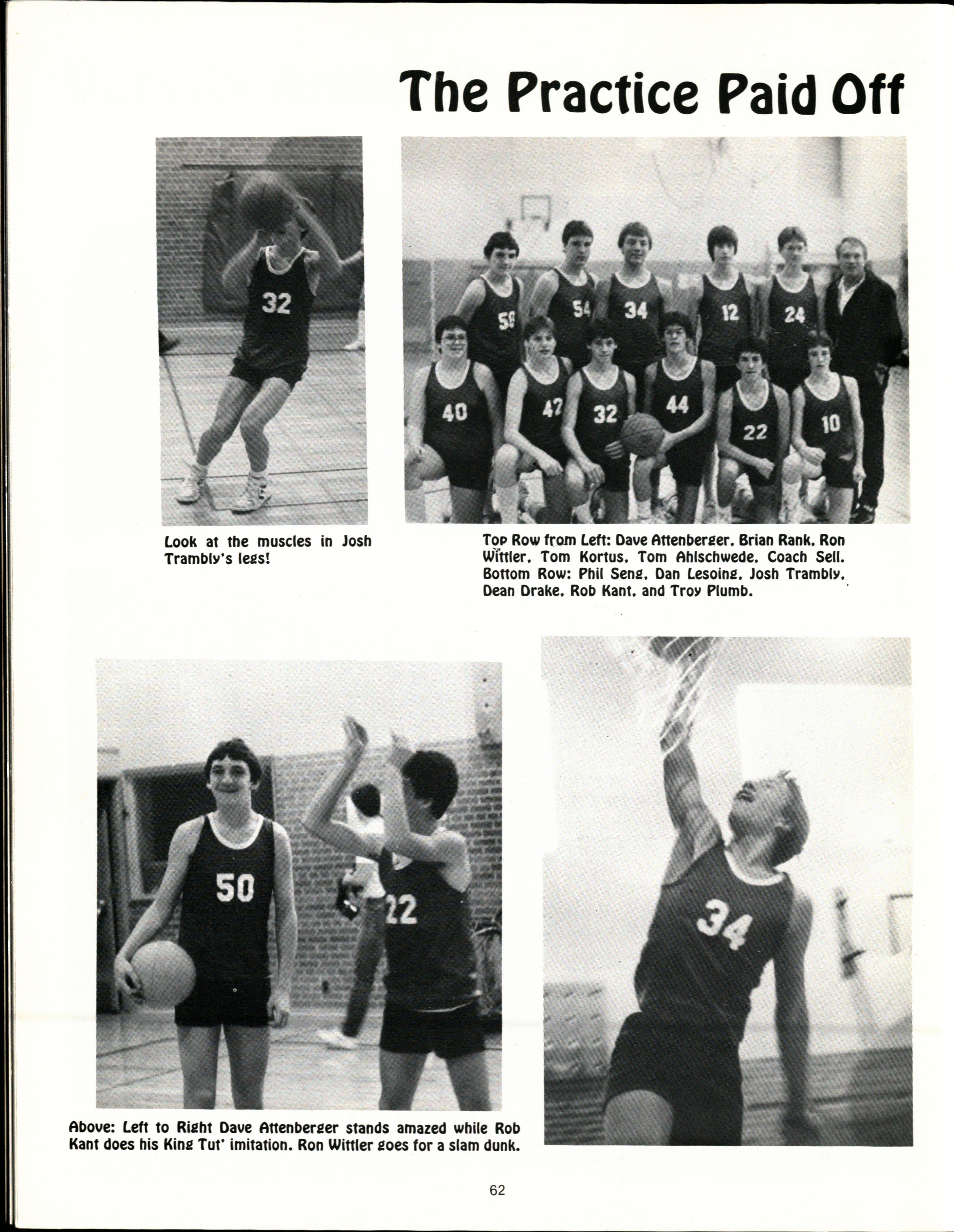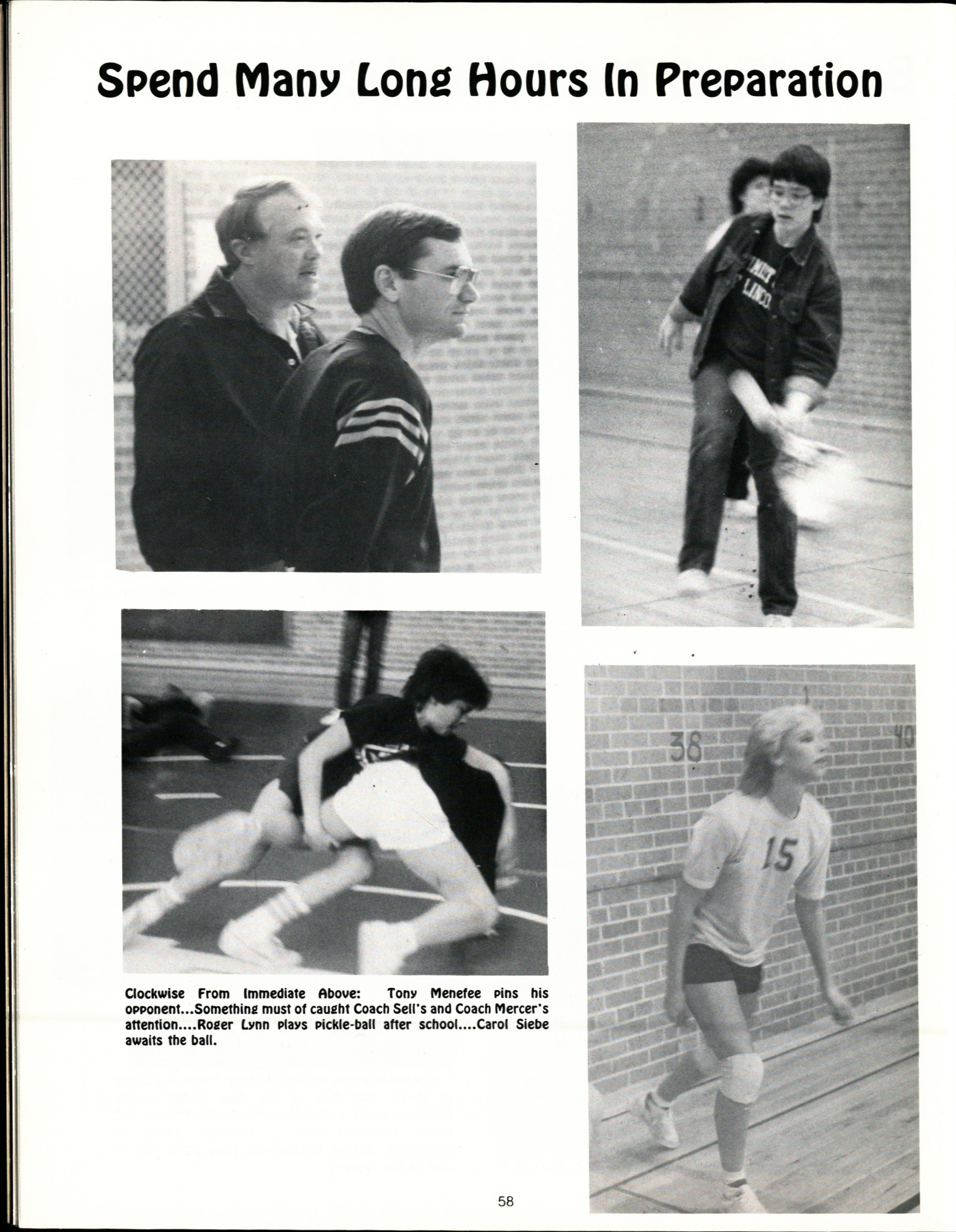 Clockwise from the Immediate Left: Do i,,ou think it will ever come back Tammy Bouwens. Beth Gibbons. and Andee Walek Andee Walek tives it all she has Back Row: Lisa Edtecomb. Assistant Coach Rich Brittenham. Michelle Beck. Marsha Thelen. Tammi,, Bouwens. Andee Walek. Kim Grosshans. Laurie Schomaker. and Coach Bitham. Bottom Row: Beth Gibbons. tai,, Criswell. Cindi,, Kloke. Barb Kubes. and carrie Munn.