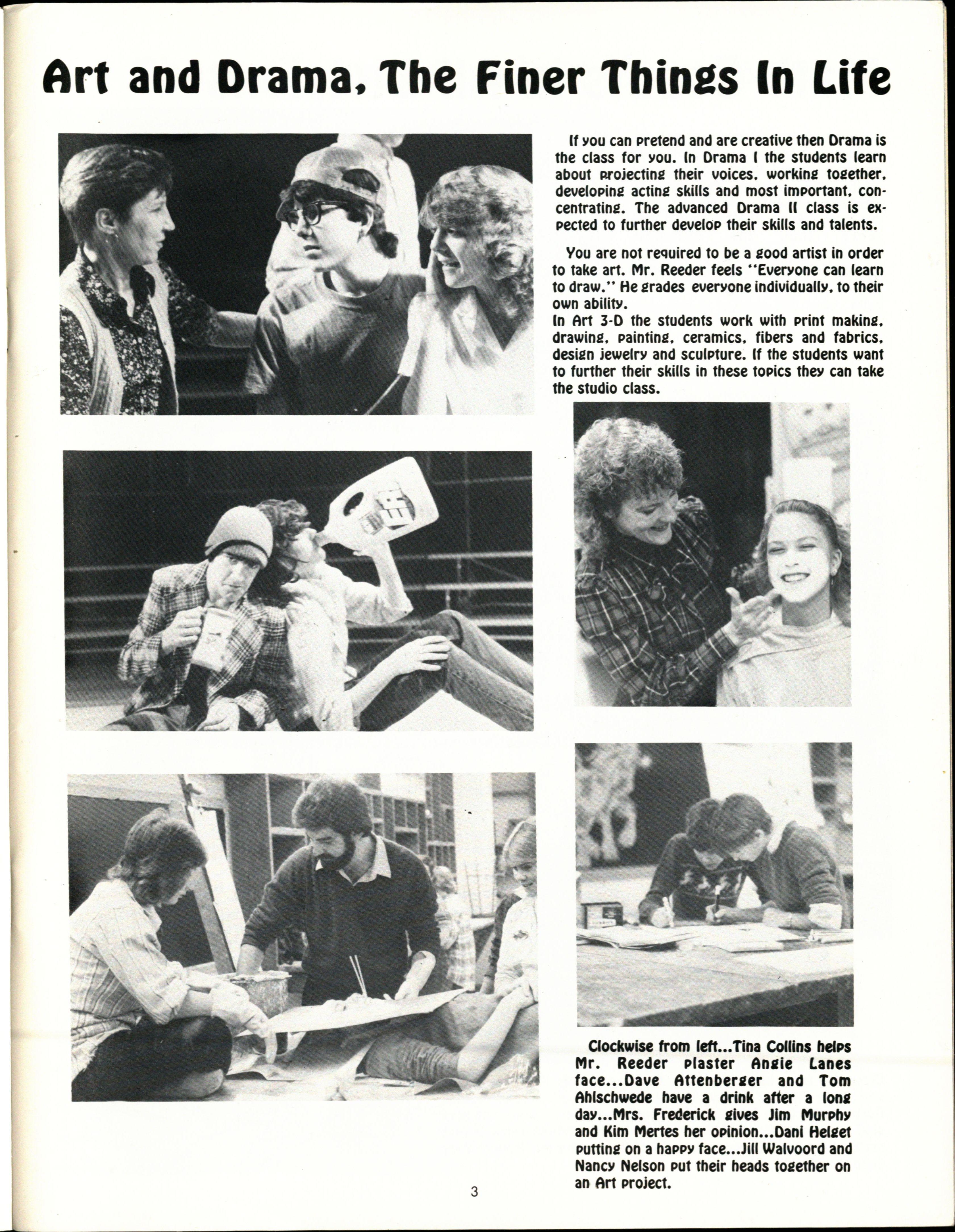 Clockwise from left Tina Collins belPs Mr. Reeder Plaster Antle Lanes face ... Dave Attenberaer and Tom Ablschwede have a drink after a Iona daY ... Mrs. Frederick aives Jim MurPbY and Kim Mertes her oPinion ... Dani Helaet Puttine on a haPPY face Jill Walvoord and Nancy Nelson Put their heads toaether on an Art Project.