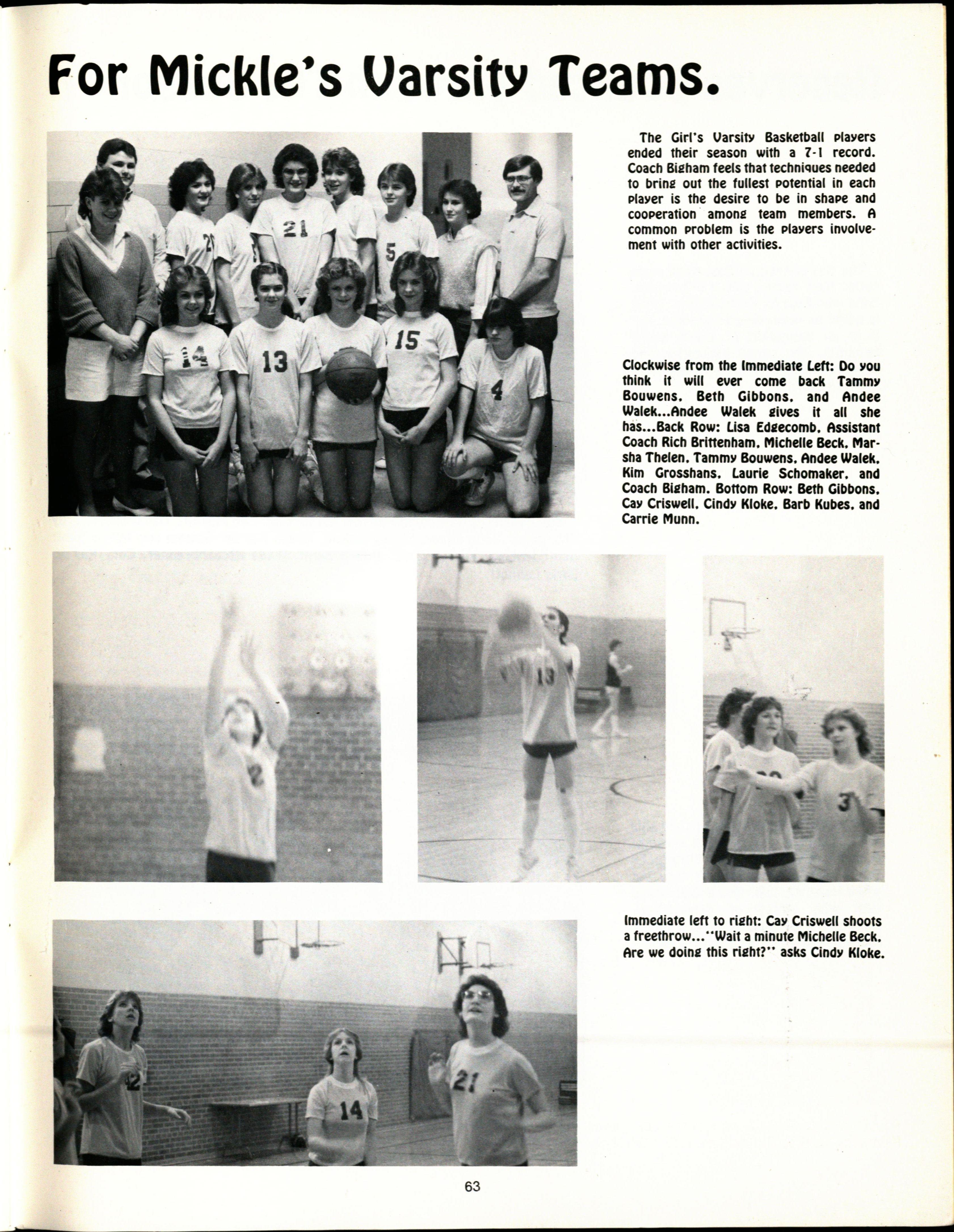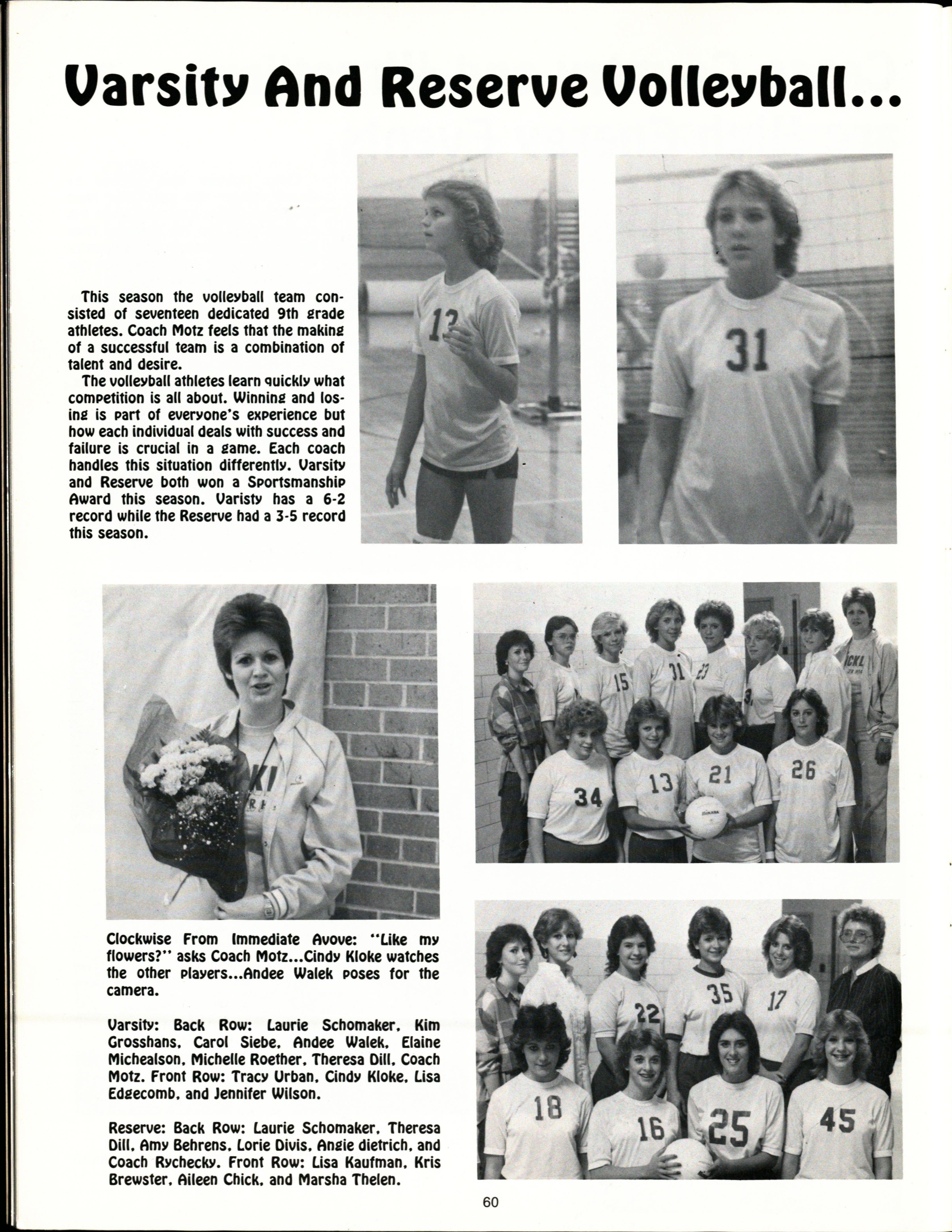 Varsiw: Back Row: Laurie Schomaker. Kim Grosshans. Carol Siebe. Andee Walek. Elaine Michealson. Michelle Roether. Theresa Dill. Coach Motz. Front Row: Tracy Urban. Cindy Kloke. Lisa Edeecomb. and Jennifer Wilson.