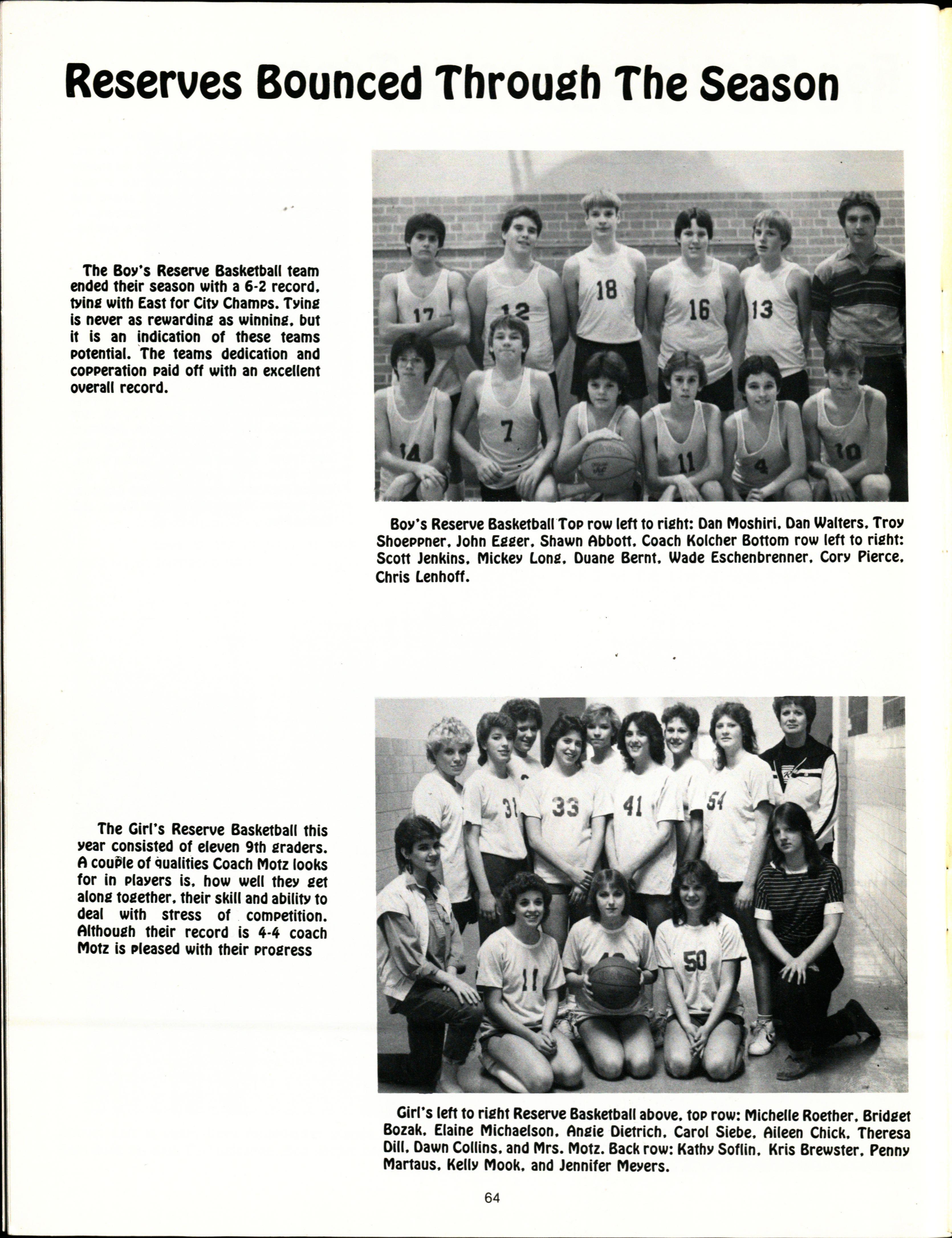 Reserve: Back Row: Laurie Schomaker. Theresa om. Amy Behrens. Lorie Divis. Aneie dietrich. and Coach RYcheckY. Front Row: Lisa Kaufman. Kris Brewster. Aileen Chick. and Marsha Thelen.
