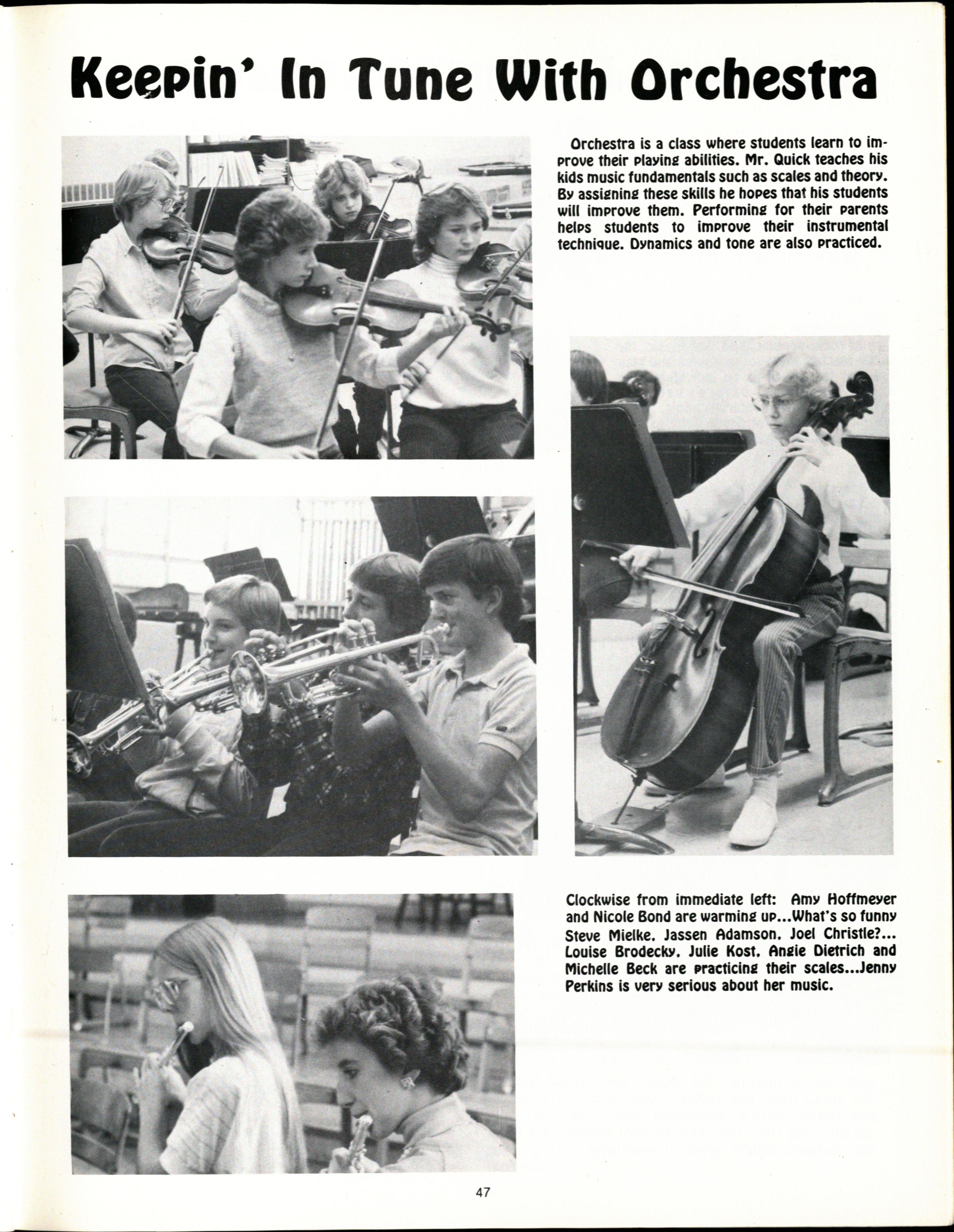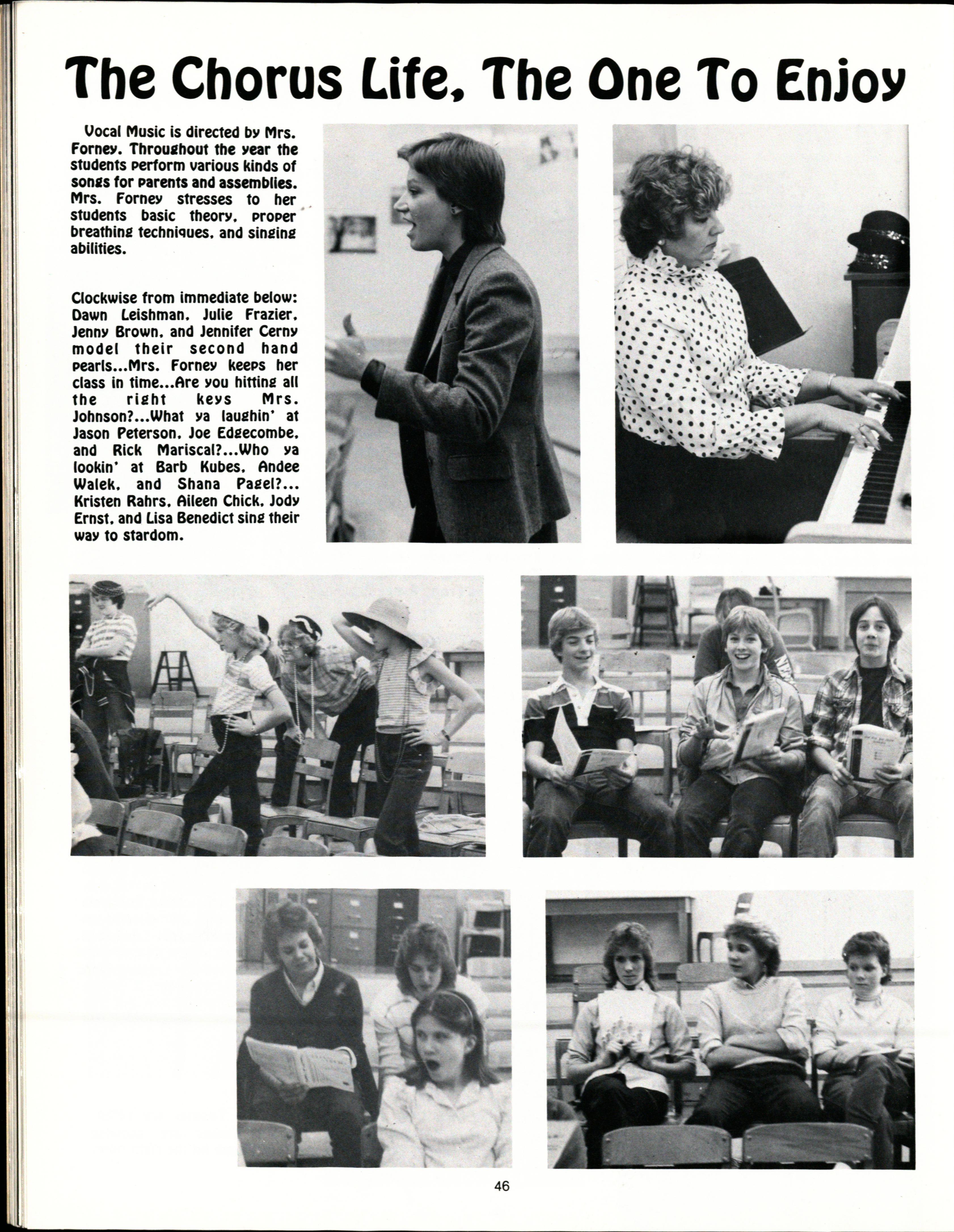 aockwise from immediate below: Dawn Leishman. Julie Frazier. Jenny Brown. and Jennifer Cerny model their second hand s>earls Mrs. Forney keeps her class in time ... Are you hittina all the riaht keys Mrs. Johnson? What ya lauahin • at Jason Peterson. Joe Edaecombe. and Rick Mariscal? Who Ya lookin • at Barb Kubes. Andee Walek. and Shana Paael? Kristen Rahrs. Aileen Chick. Jody Ernst. and Lisa Benedict sina their way to stardom.