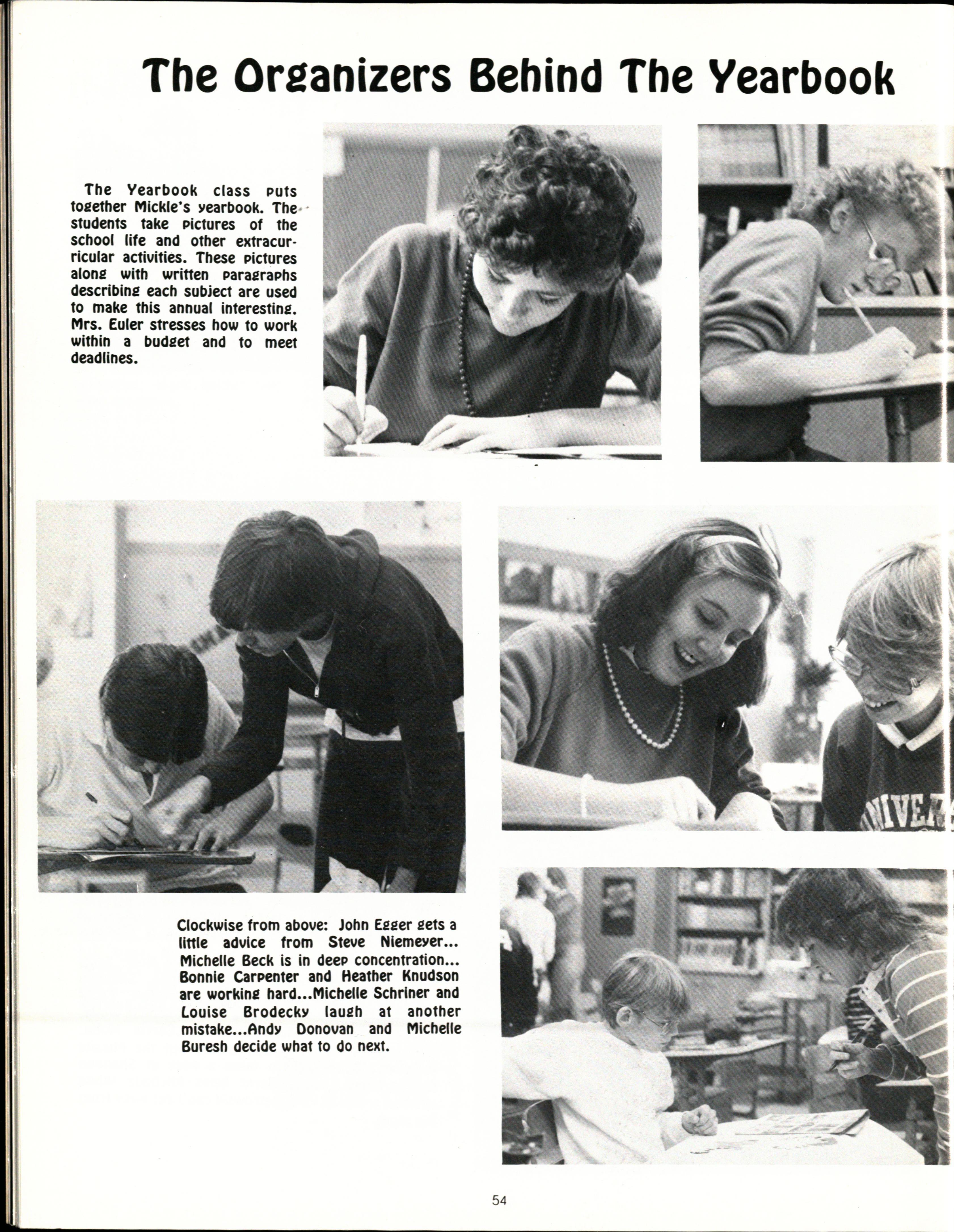 The Yearbook class Puts toeether Mickle·s Yearbook. The students take Pictures of the school life and other extracurricular activities. These Pictures alone with written ParaaraPhs describina each subject are used to make this annual interestina. Mrs. Euler stresses how to work within a budaet and to meet deadlines.