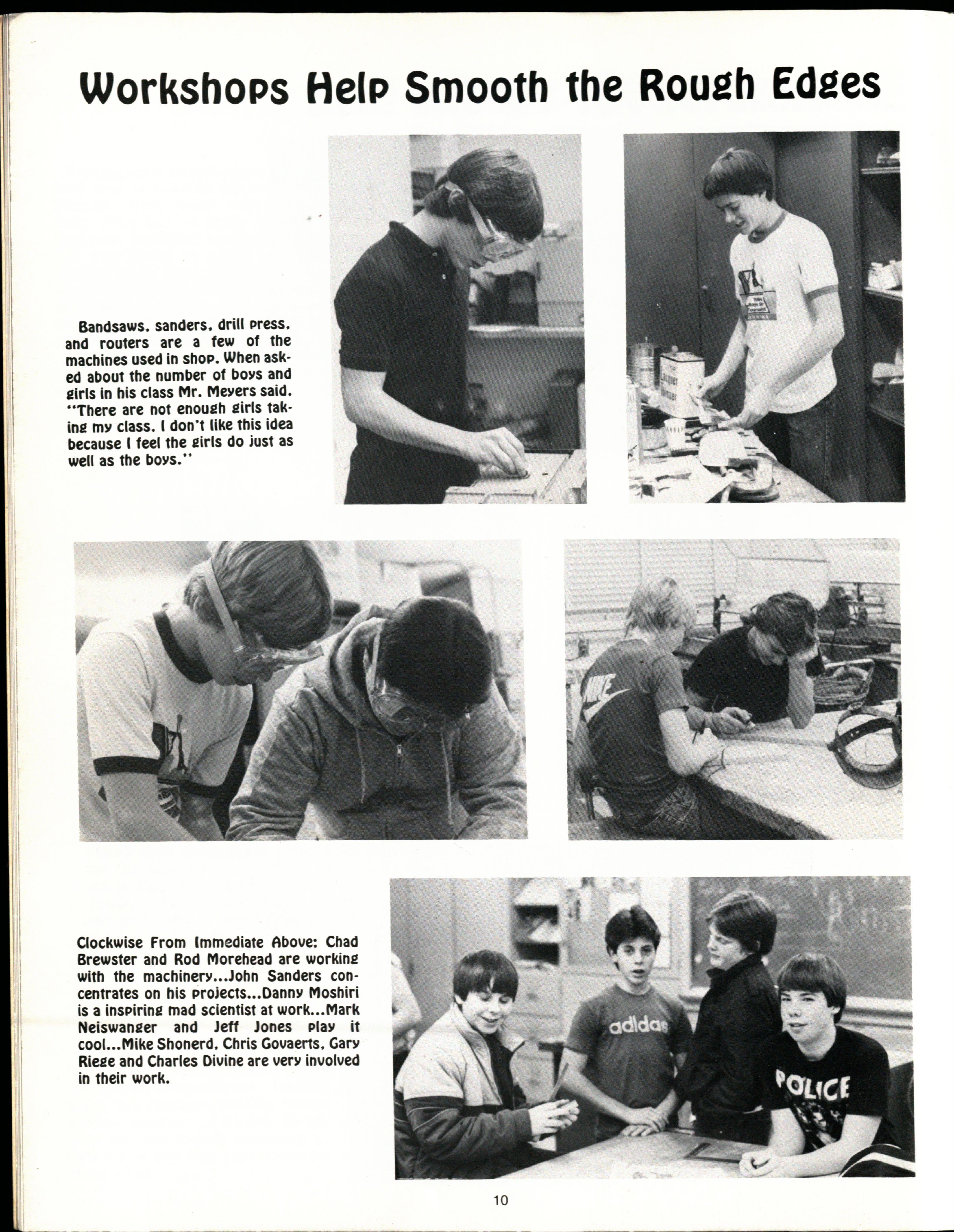 Clockwise From Immediate Above: Chad Brewster and Rod Morehead are workine with the machinerY John Sanders concentrates on his Projects ... DannY Moshiri is a insPirine mad scientist at work Mark Neiswaneer and Jeff Jones Play it cool ... Mike Shonerd. Chris Govaerts. Gary Rieee and Charles Divine are very involved in their work.