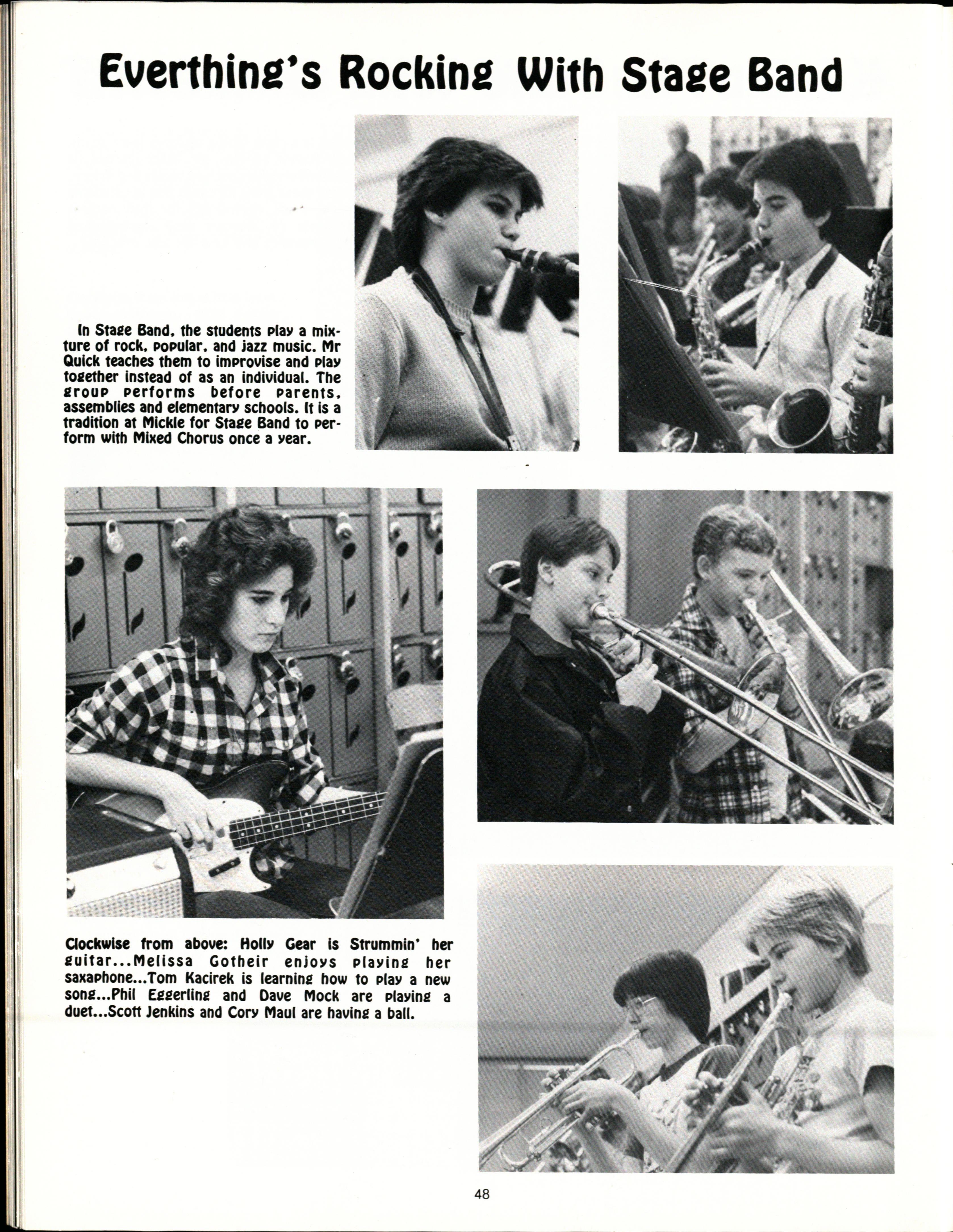 aockwlse from above: HollY Gear is Strumm1n· her auitar ••• Melissa Gotheir enjoys PlaYine her saxaPhone ••. Tom Kacirek is learnine how to Play a new sone ••• Phil Eaeerline and Dave Mock are PlaYine a duet ••• Scott Jenkins and CorY Maul are havine a ball.