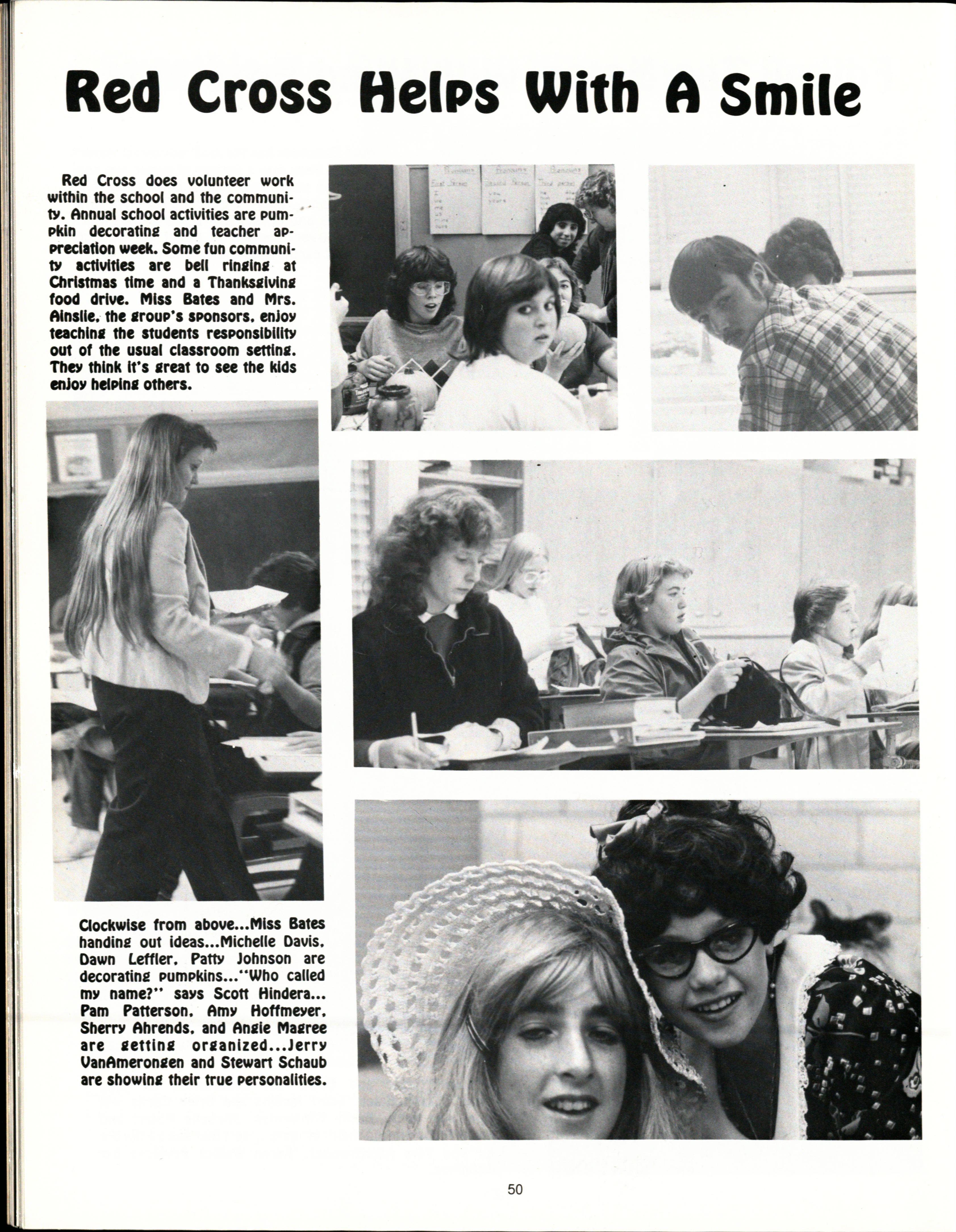 Red Cross does volunteer work within the school and the communin,. Annual school activities are PumPkin decoratina and teacher aPPreclatlon week. Some fun communin, activities are bell rlnaina · at Christmas time and a Thanksalvlna food drive. Miss Bates and Mrs. Ainslie. the aroup•s sPOnsors. enJoy tachlnl the students resPOnslbllln, out of the usual classroom settlna. ThD think tt·s areat to see the kids enJoy helPlna others.