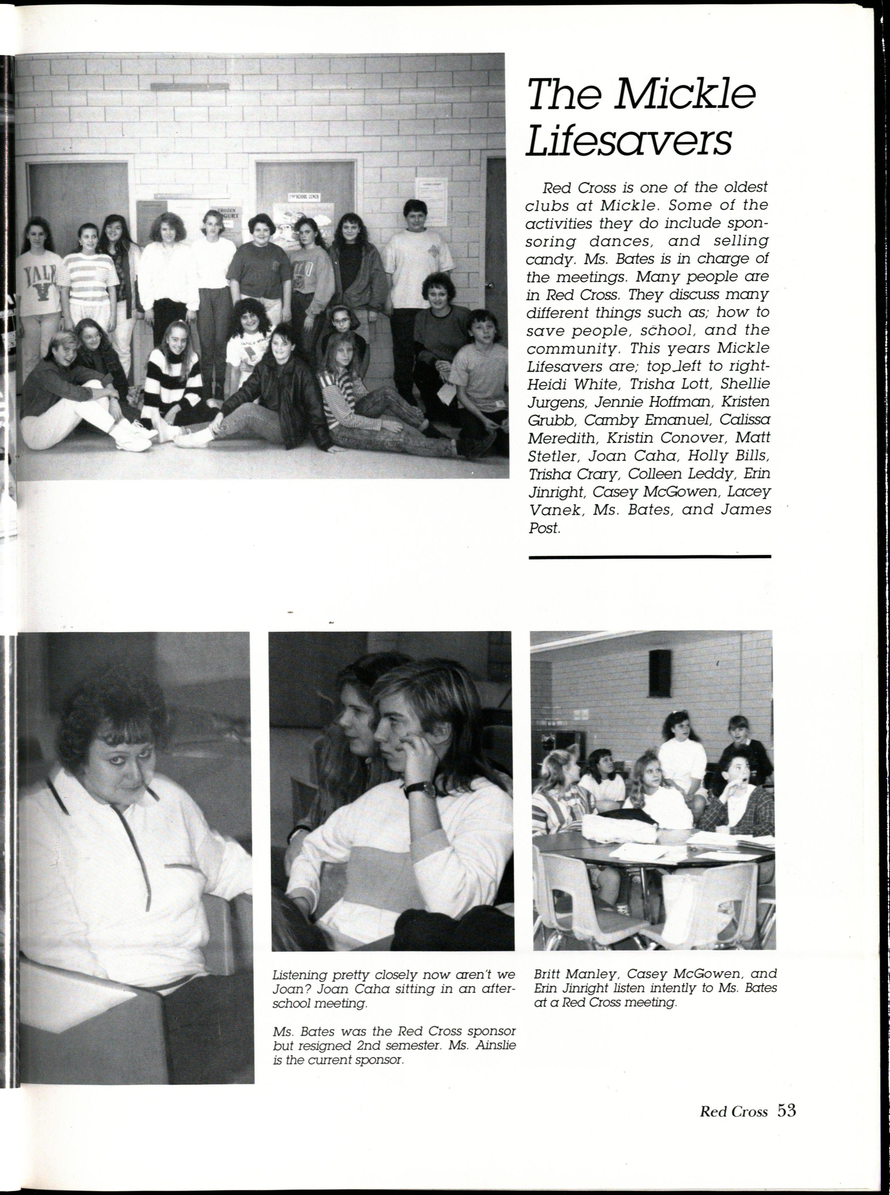 Red Cross is one of the oldest clubs at Mickle Some of the activities they do include sponsor i ng dances , and selling candy Ms . Bates is in charge of the meetings Many people are in Red Cross They discuss many different things such as; how to save people , school , and the community This years M i ckle Lifesavers are ; topJett to rightHe i d i White , Trisha Lott , Shellie Jurgens , Jennie Hottman , Kristen Grubb , Camby Emanuel, Calissa Mered i th, Kristin Conover , Matt Stetler , Joan Caha , Holly Bills , Trisha Crcny, Colleen Leddy, Erin Jinrigh t, Casey McGowen , Lacey Vanek , Ms Bates , and James Post.