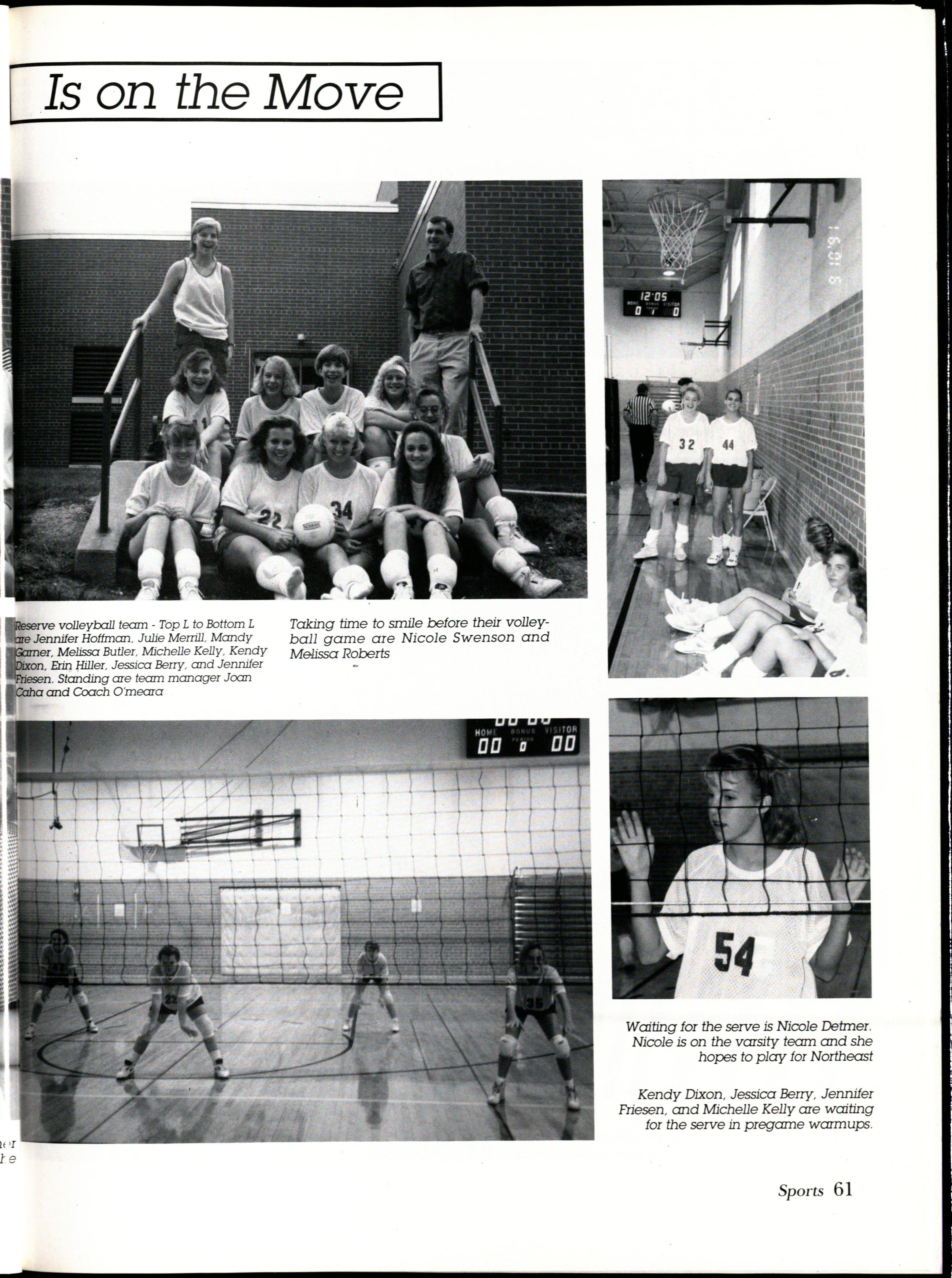 Varsity girls lxrsketball top row L to Rare : Assistant Jnel Johnson , Erin York , Nicole Detmer, Nicole Swenson , Michelle Kelly, Kelly Zessin , and Coach Bigham Bottom row L to Rare : Robin Voss , Melissa Roberts , Vicki Scheinost, Tiffany Jahn , Kelly Ott, and Julie Merrill Not shown Assistant Jami Upton