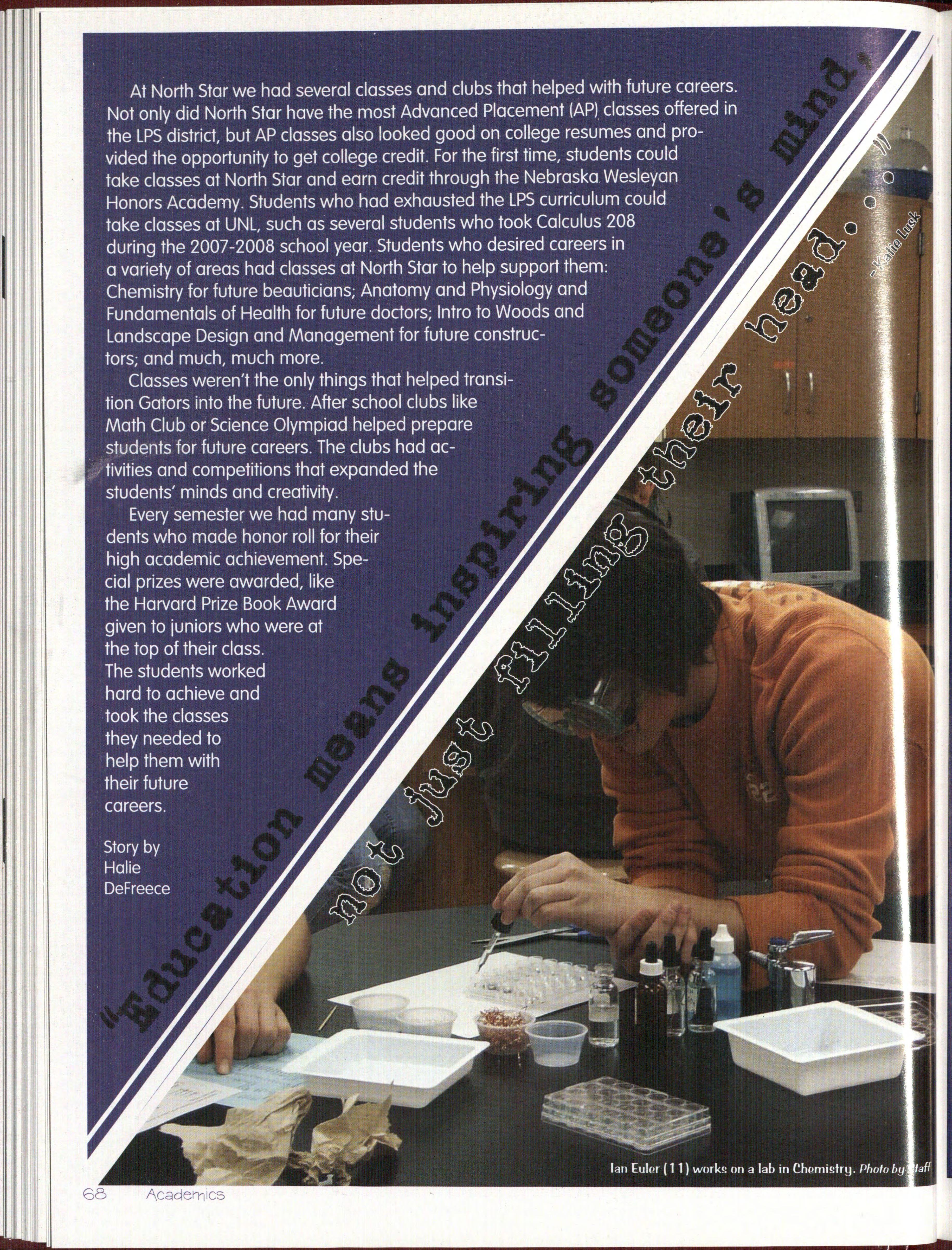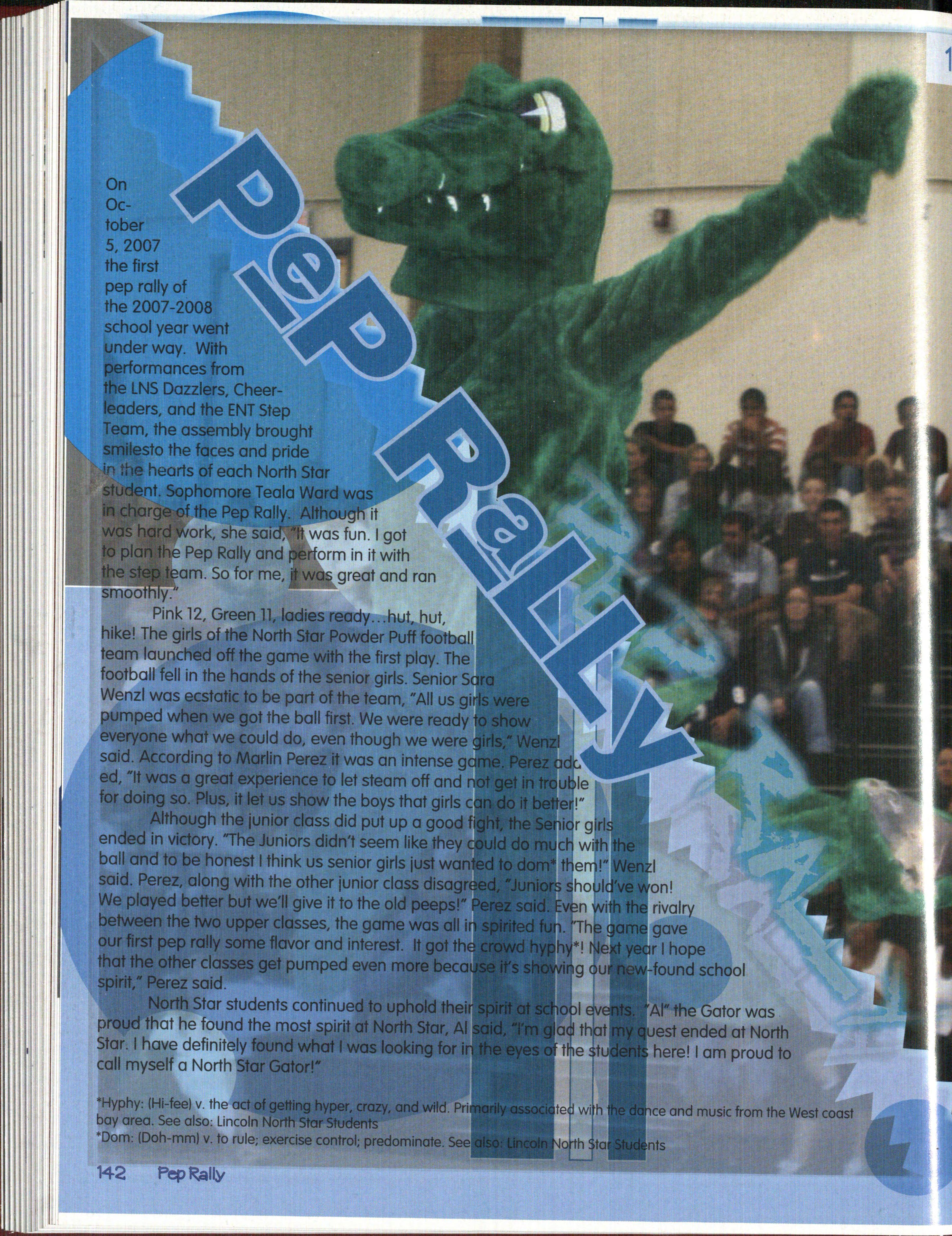 U WQ&~WQl'.Q toot S~J:i,QQQ~f his or her accomplishments acknowledged wa on of character and determination. To accomplish something was to put forth a great deal of effort and strength and come out a winner. It didn't necessarily mean being "the winner, 11 but it was the knowledge you conquered that obstacle in the way of your goal. No matter what, everyone could celebrate some accomplishment during their years at North Star. North Star had many accomplishments in 2007-2008. At the start of the year the media wasn't in our favor. The headlines were full of .stories about things that didn't portray North Star as a II good" school. However, together we were able to overcome those negative perceptions . We celebrated accomplishments when we defeated rival schools at sporting and art competitions. Each day students managed to accomplish goals, whether was getting an A on a test or making a Varsity sportt. This isn't even to mentio the greatest accomplishment of all: having helped 400 plus seniors reach their goal of graduation It didn't make a difference how small or large the task was, just knowing that as long as you have foll owed through and had done the best you could, it is was indeed a great accomplishment.