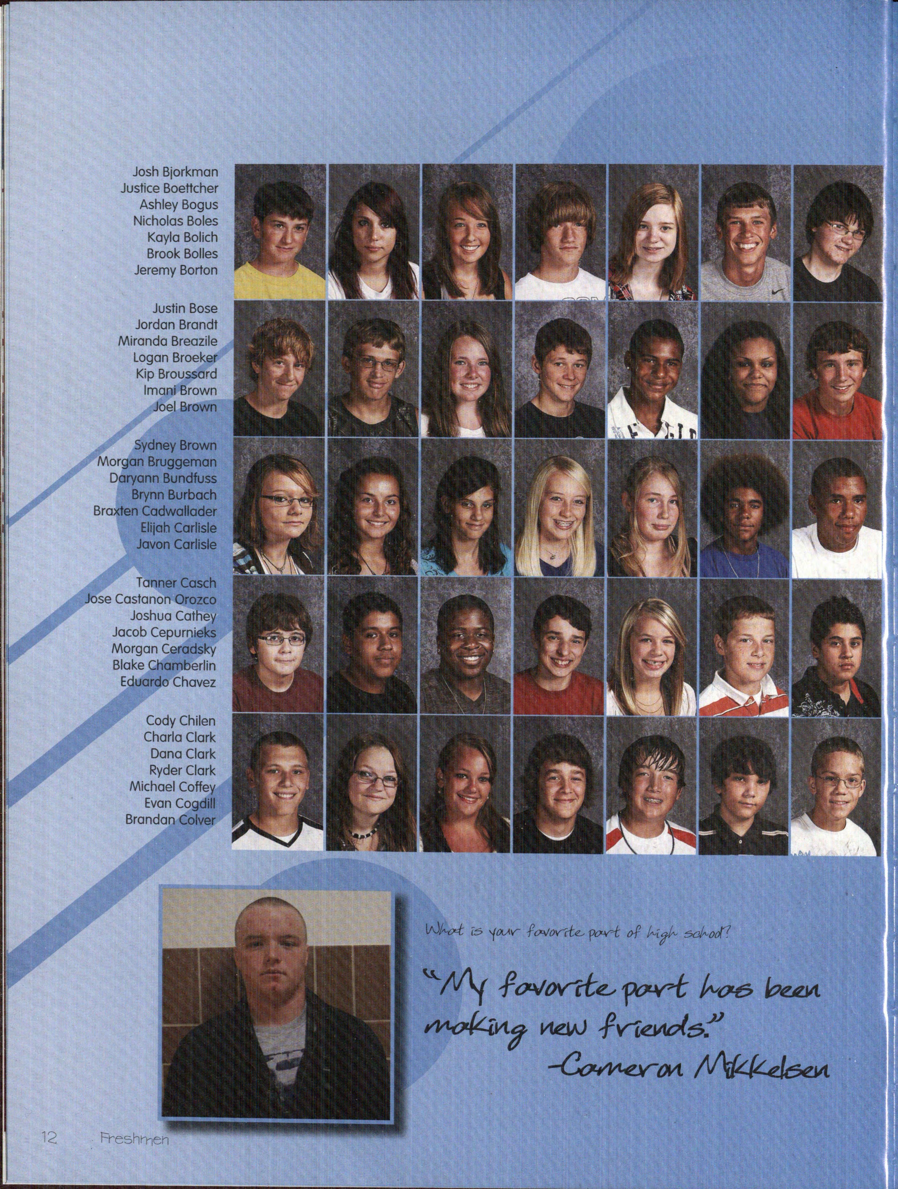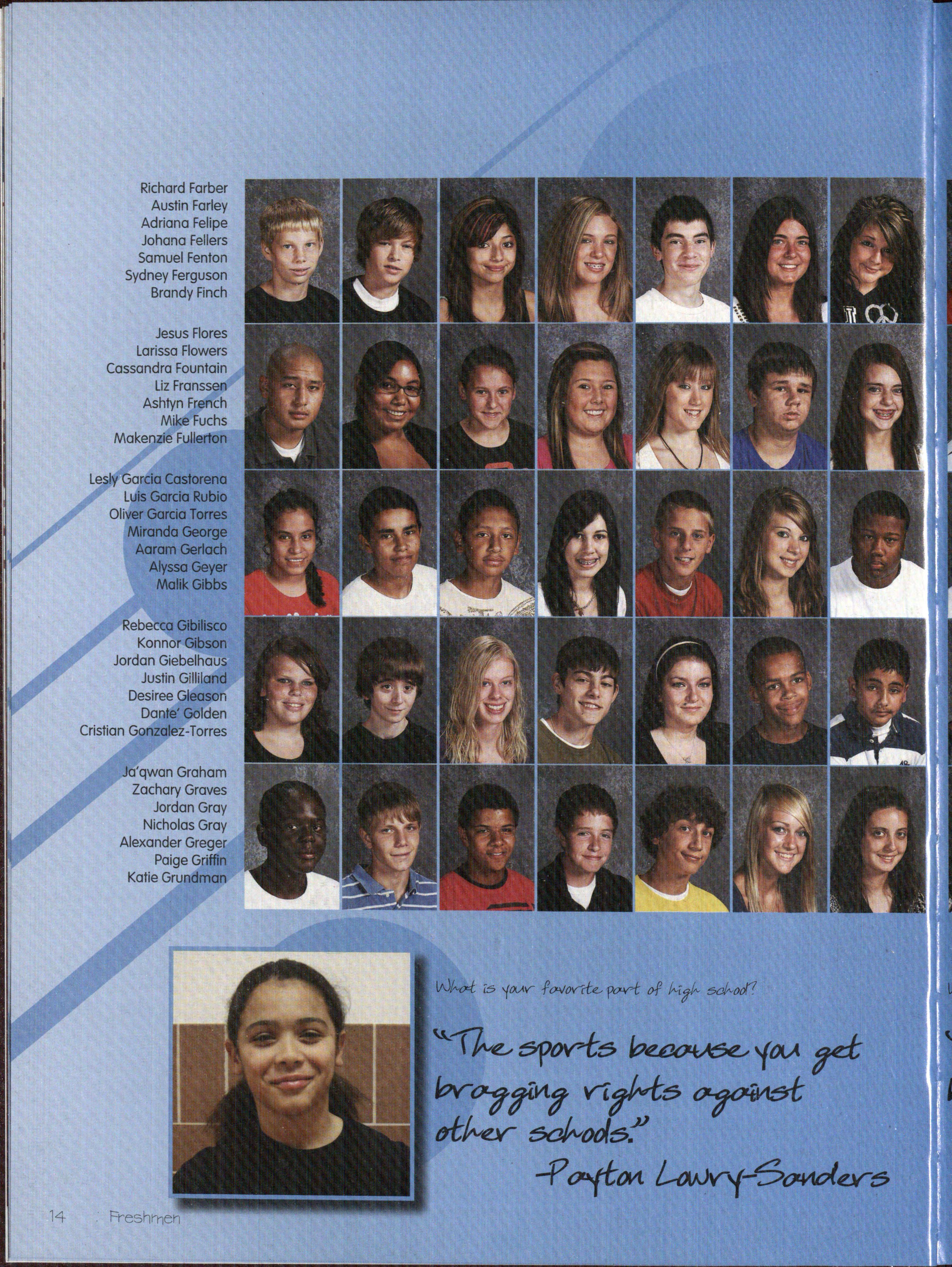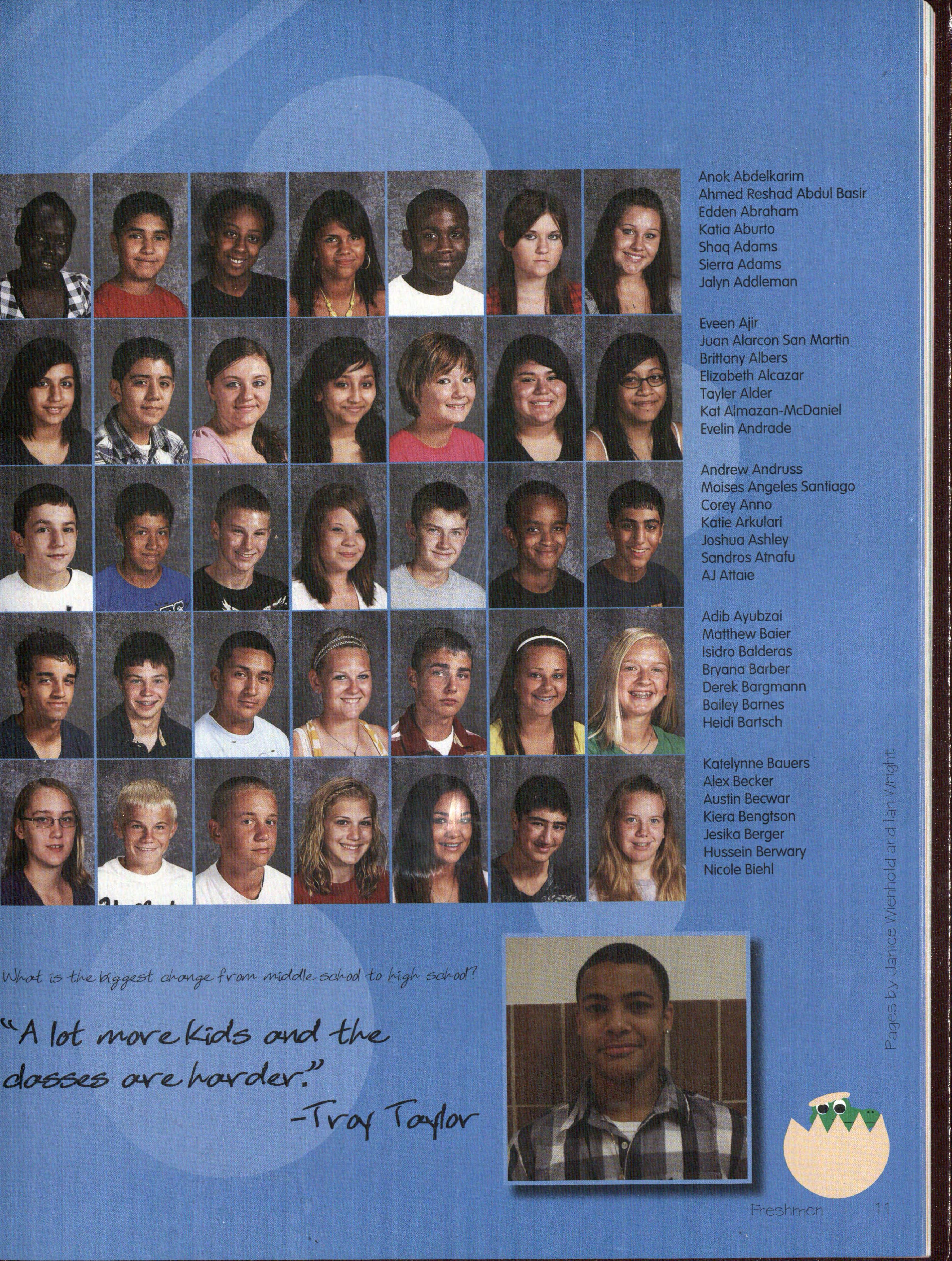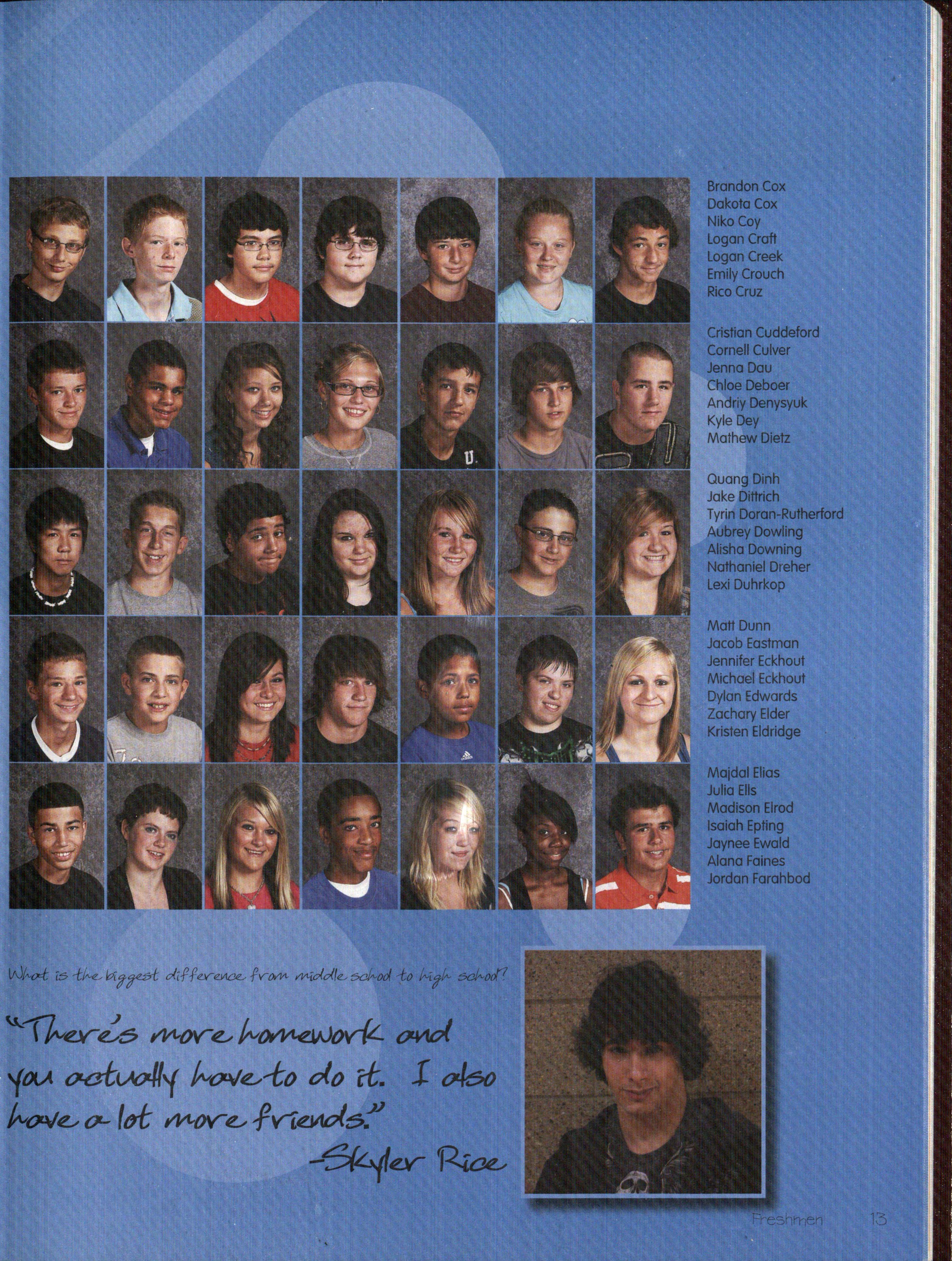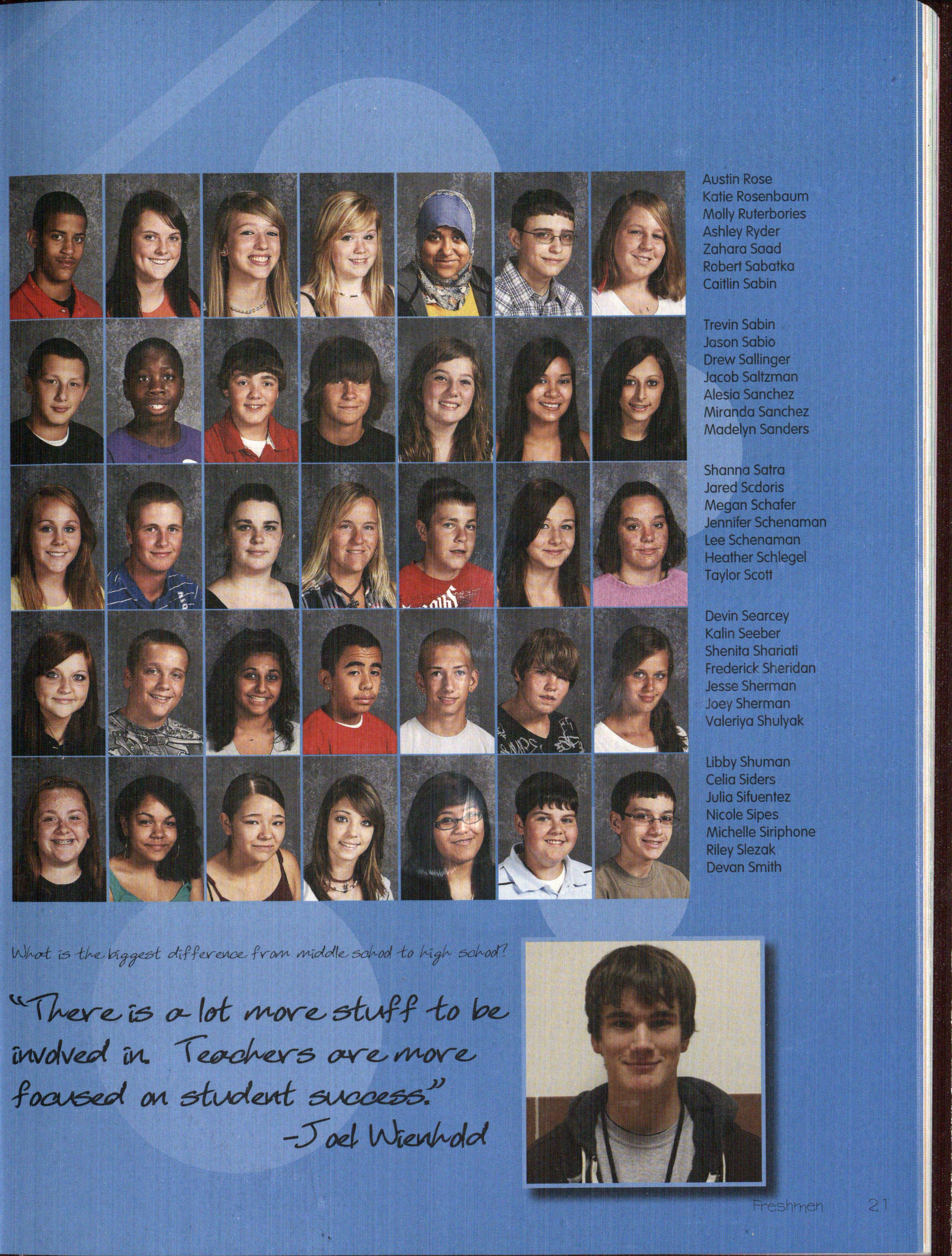 As f'resh.:rne:n. entered high school rn.a:n.y of' th.em ex:plored :n.ev-r activities an.d f'ou.:n.d areas that interest them lv1:orga:n. Bruggeman. (9) alw-ays loved singing, acting, a:n.d sof'tball: u.pa:n. entering p.igh sc.h.ool she -made the JV sof'tball tea:rn. and f'ou.:n.d herself' involved. in. choir and the One Acts. For her, t.h.e :transition. w-as dif'f'icult be.tw-een. ma.ki:n.g new- f'rien.ds a:n.d getting all of'her homew-ork done daily. "R:ight now-, I'mjust f'ocu.sing on. lettering i:n. th.eat.re and :passi:n.g :my Oral Cornrnu.:n.ication.s class," Bruggeman. b"tated.. :Each year w-he:n. new- f'resh.rne:n. entered high school it mea:n.t new- possibilities in sparts and sparts is just about all Zach Jackson. (9) thought about Jackson. spent near]y all of'his f'ree time either w-or:king out, playing f'ootball or han.gi:ng out w-it.h. his brothers Jackson. started playing f'ootball w-ay ba.ck even. bef'ore kin.dergart.e:n., w-hich led to him making t.h.e varsity f'ootba.11 tea:rn. as a f'resh.r:na:n. ::E-Ie also played baseball a:n.d participated in vV"restling to help him vV"ith f'ootball. As far as his transition. in.to h:igh school w-e:n.t, Jackson. cJa±rn.ed. "school corn.es easy to me, so t.h.e transition. w-as easy Plus my last school w-as so s-rnall it w-as lil"\:.e a closet, so I like being in a bigger setting." Jackson. doesn't like to th.ink of' shortterm goals, :i:nstead he looks complete]y to t.h.e f'u.tu.re.