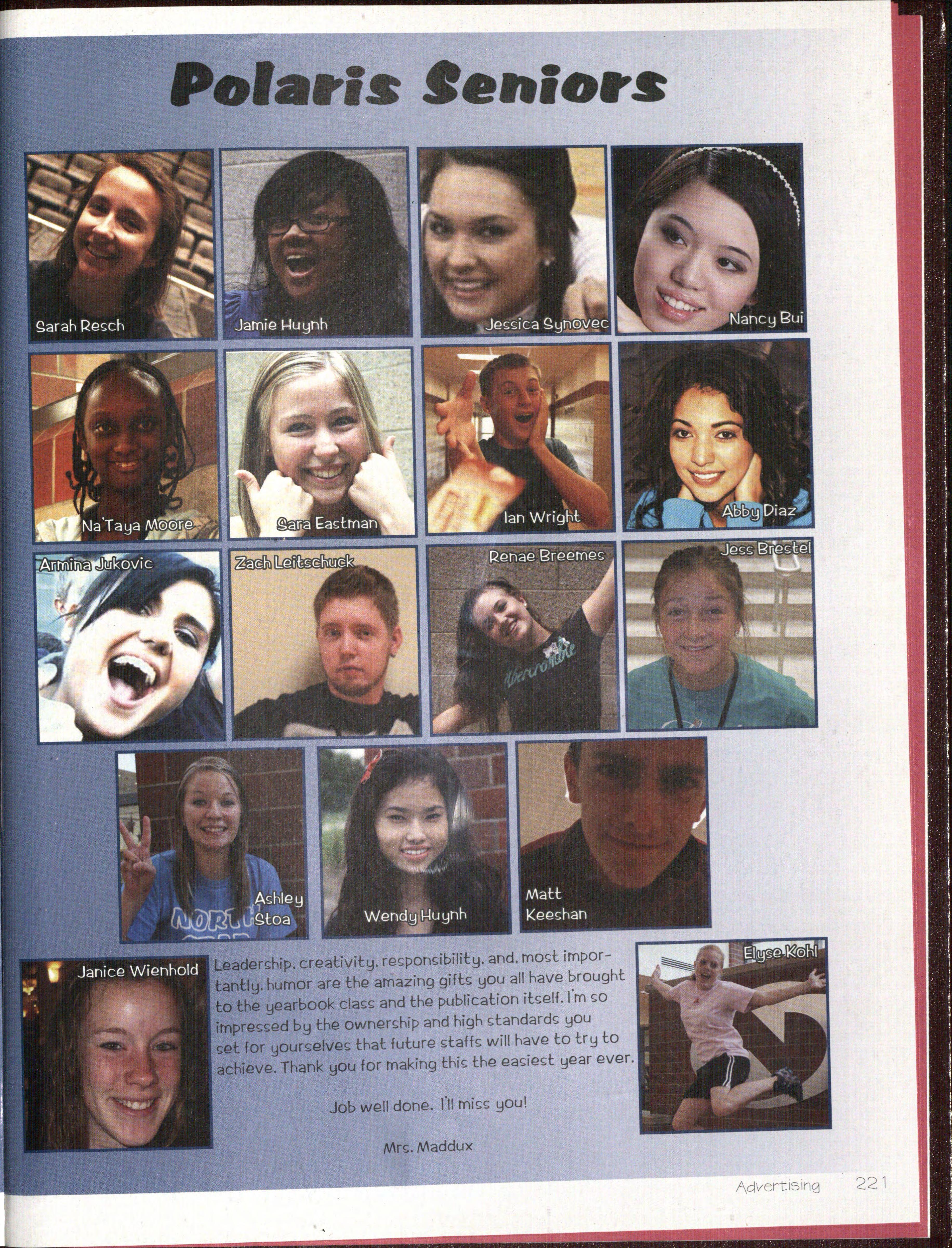 Leader~hip. creativity. re~pon~ibility. and. mod importantly. humor are the amazing gift~ you all have brought t o the yearbook cla~~ and the publication it~elf. I'm ~o irnpres;~ed by the owner~hip and high dandard~ you ~et for yours;elves that future staff~ will have to try to achieve. Thank you for making thi~ the ea~ied year ever.