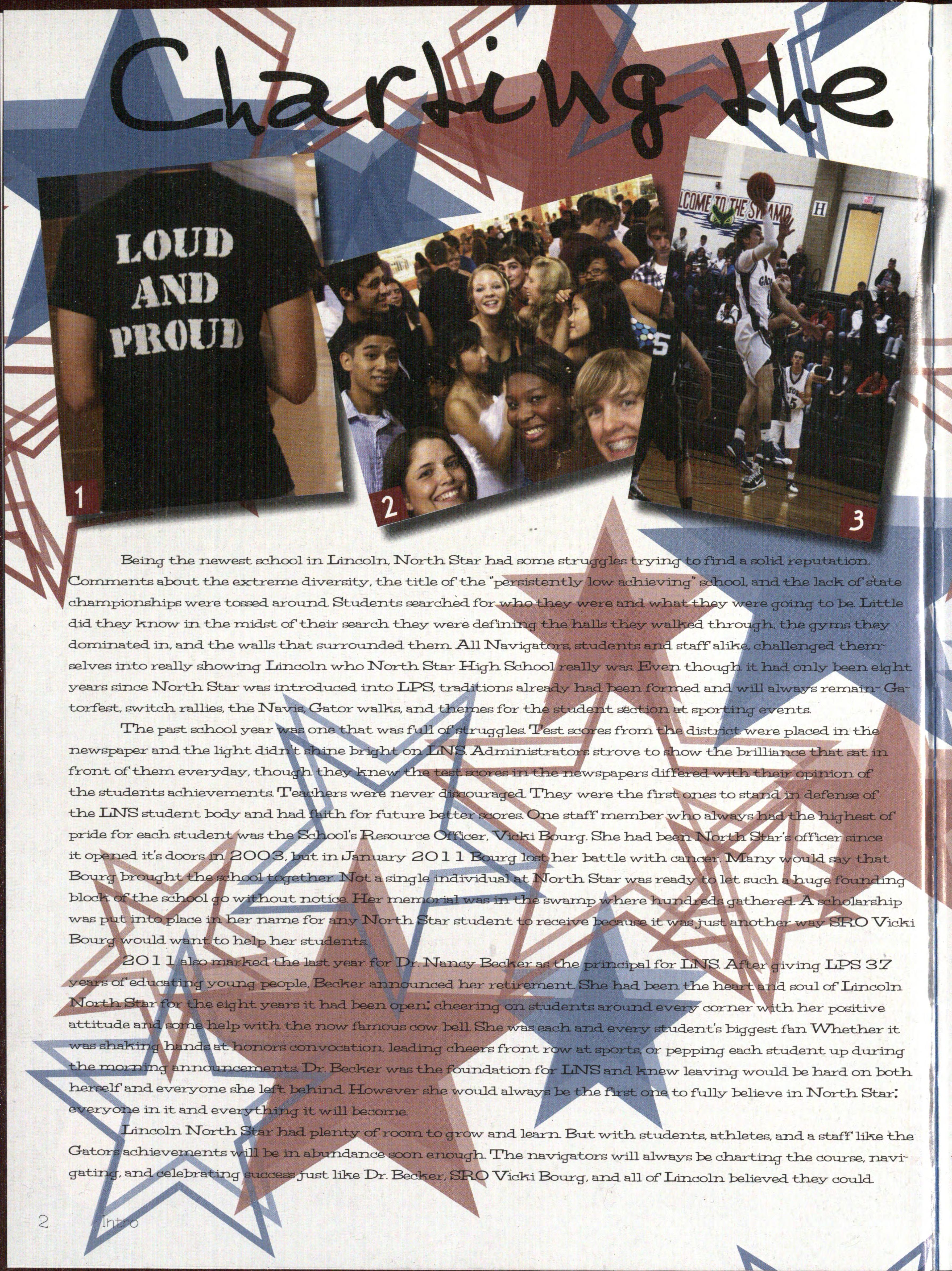 From the opening of' the school in the fall of' 2 00 3 u.n.til January 24, 2 0 1 1 , -w-hen. sh.e lost her battle -w-ith cancer , SR.0 Vicki Bou.rg-w-as one of'the strongest and. most :positive inf1uences helping to sh.ape North Star in.to a place -w-here stud.en.ts -w-an~ to be
