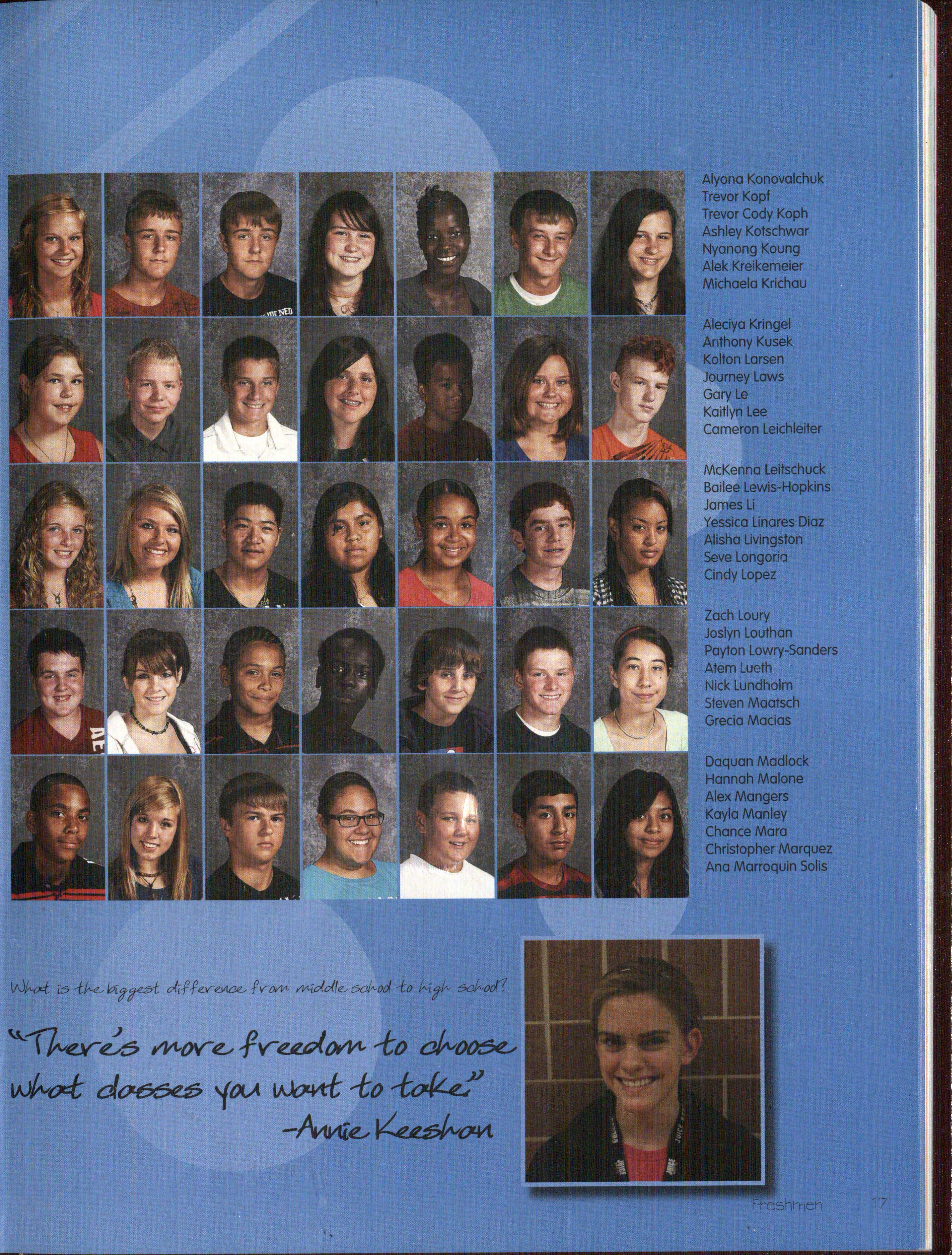 It w-as:n.'t alw-ays a smooth transition. going f'rom one school to the other, especru]y w-h.e:n. you. ma.de the big ju.mp f'rom middle school to high school. 'rh.e experience could be f'u.:n., stressf'ul, difficult, a:n.d f'or some easy. 'T t w-as a:n. easy transition. f'or me: t.h.e classes w-ere a lot easier to fi :n.d th.en. ;r th.ought they w-ould be," Je:n.:n.i lv1:oo:n. (9) ex:plai:n.ed, 'T th.ink t.h.e thought of' being a part of' a large student body is ex:citingr lv1:oo:n. played on the JV sof'tball tea:rn. in t.h.e spring and also swru:n f'or N ort.h. Star ::E-Ier goals f'or the year w-ere to letter in. S'Nirnming, have all A's, and just have a good f'resh.r:na:n. ex:per~e:n.ce.