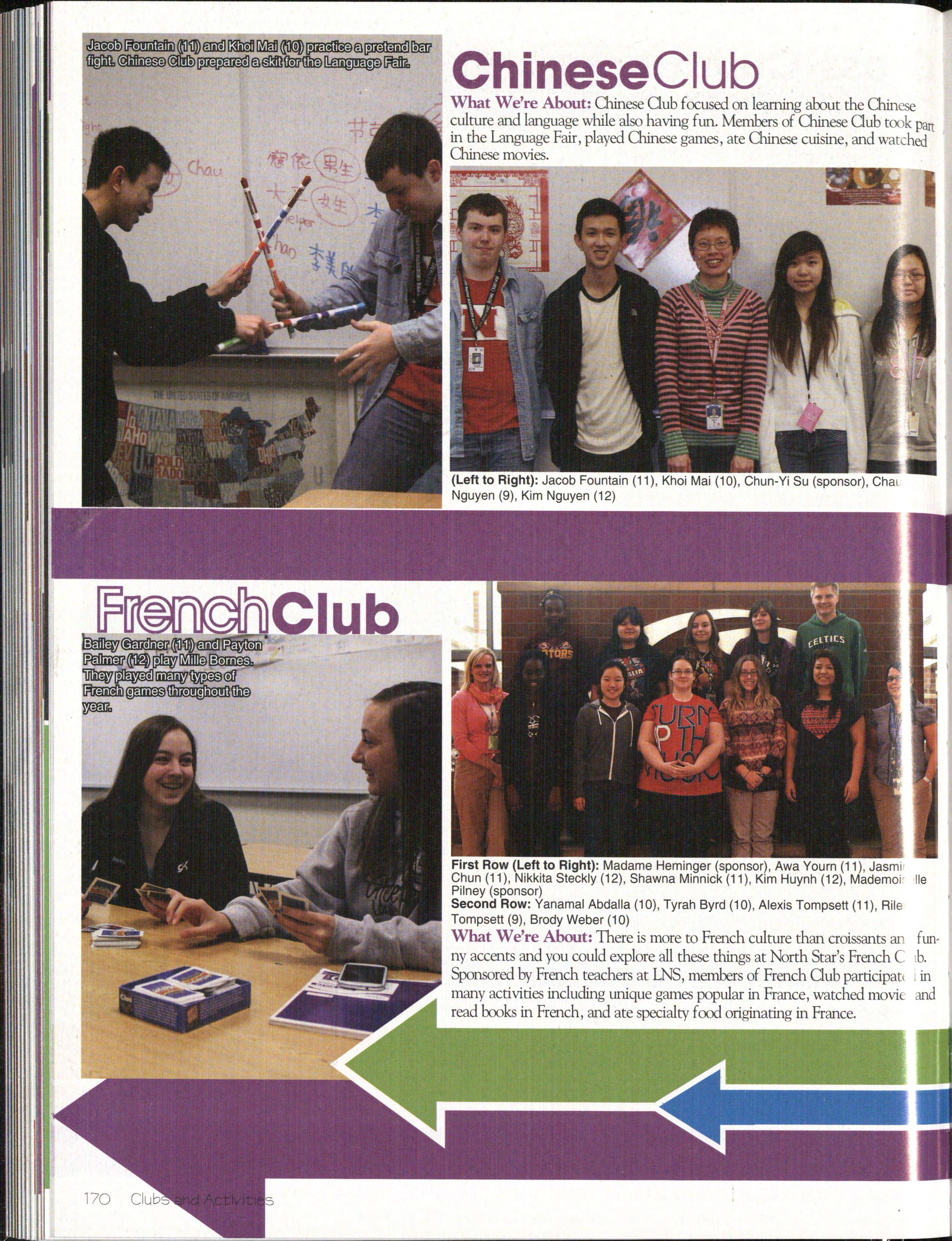 What We're About: There is more to French culture than croissants an funny accents and you could explore all these things at North Star's French C 16. Sponsored by French teachers at LNS, members of French Club participatt t in many activities including unique games popular in France, watched movie and read books in French, and ate specialty food originating in France.