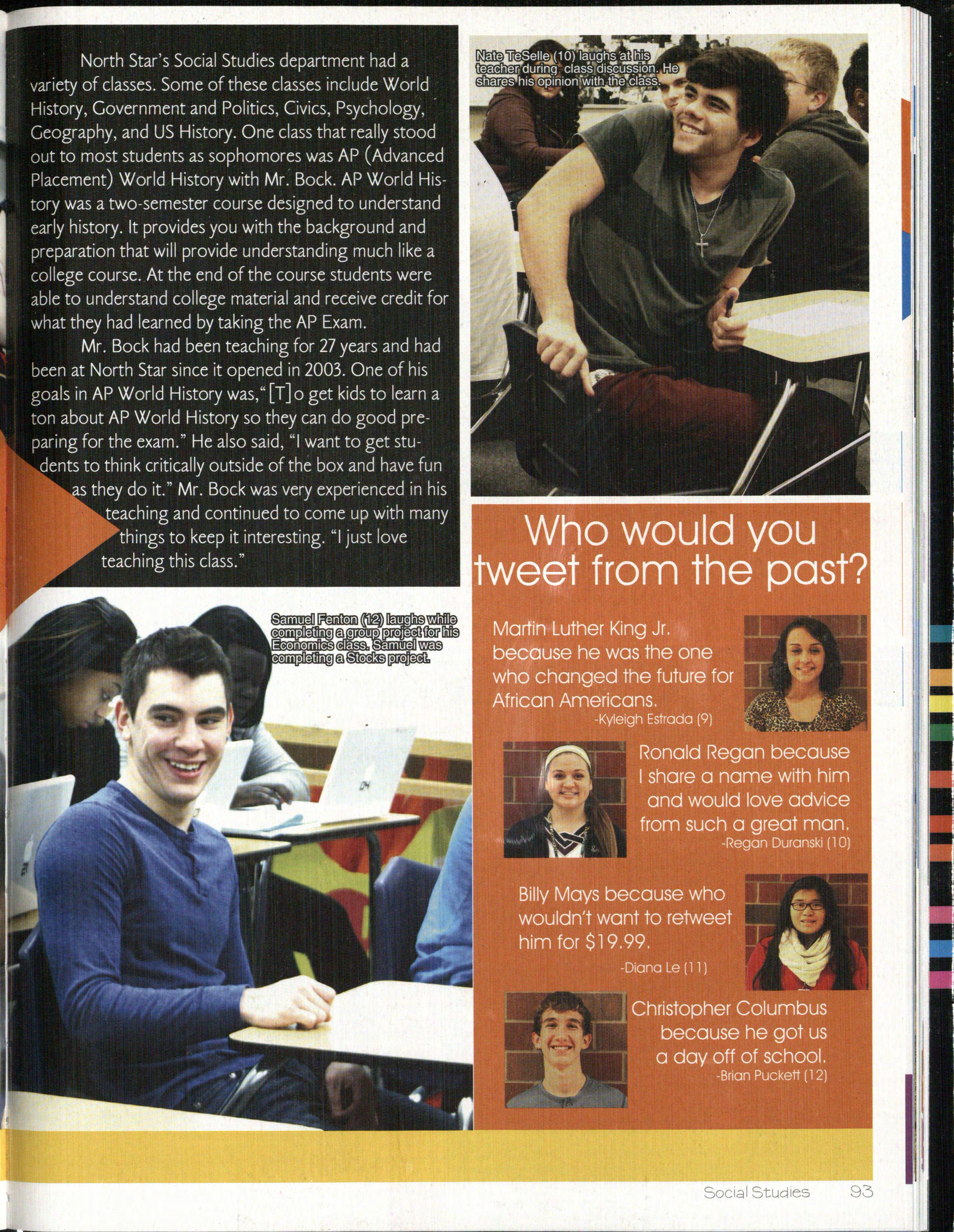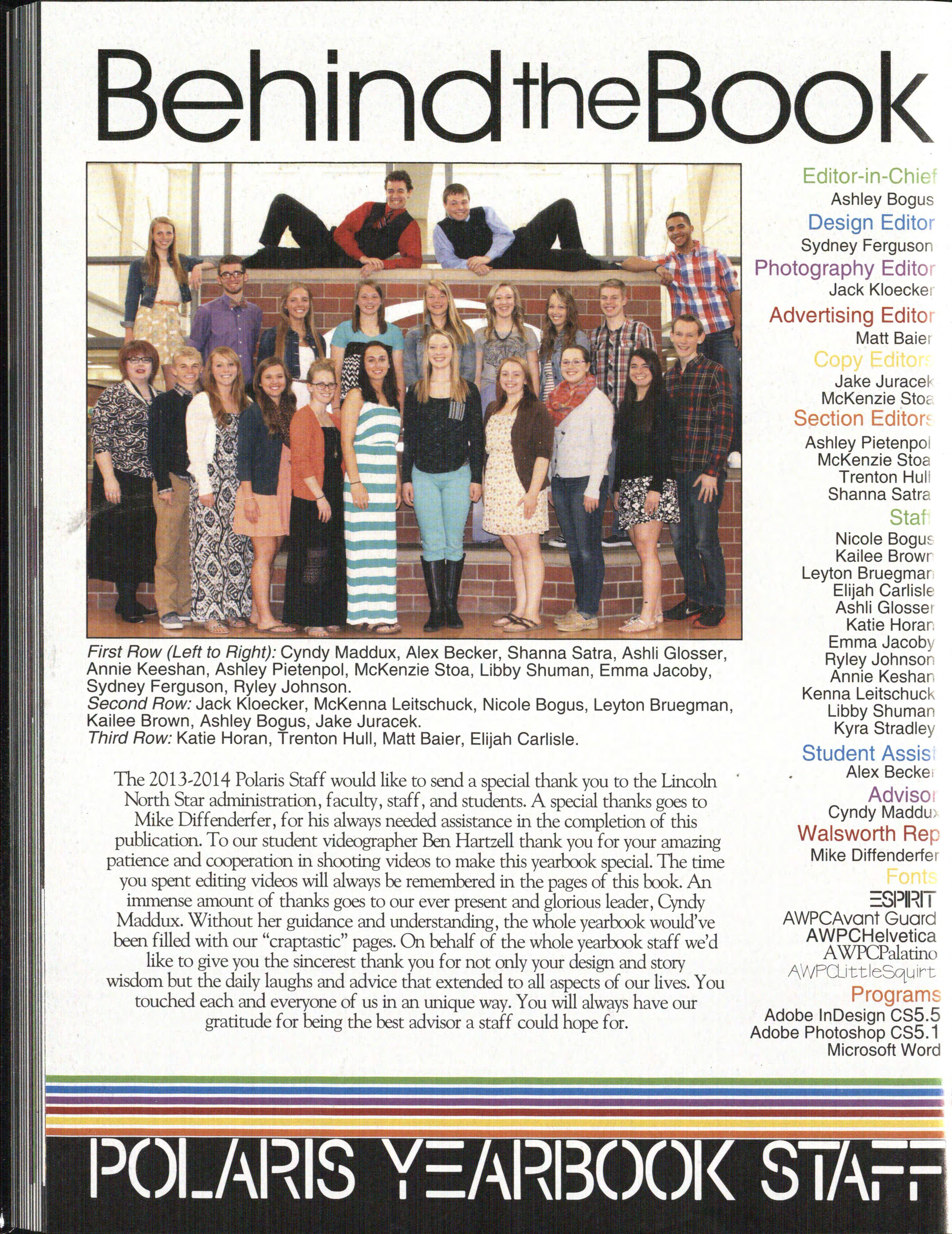 The 2013--2014 Polaris Staff would like to send a special thank you to the Lincoln • North Star administration, faculty, staff, and students. A special thanks goes to Mike Diffenderfer, for his always needed assistance in the completion of this publication. To our student videographer Ben Hartzell thank you for your amazing patience and cooperation in shooting videos to make this yearbook special. The time you spent editing videos will always be remembered in the pages of this book. An immense amount of thanks goes to our ever present and glorious leader, Cyndy Maddux. Without her guidance and understanding, the whole yearbook would've been filled with our "craptastic" pages. On behalf of the whole yearbook staff we'd like to give you the sincerest thank you for not only your design and story wisdom but the daily laughs and advice that extended to all aspects of our lives. You touched each and everyone of us in an unique way. You will always have our gratitude for being the best advisor a staff could hope for.
