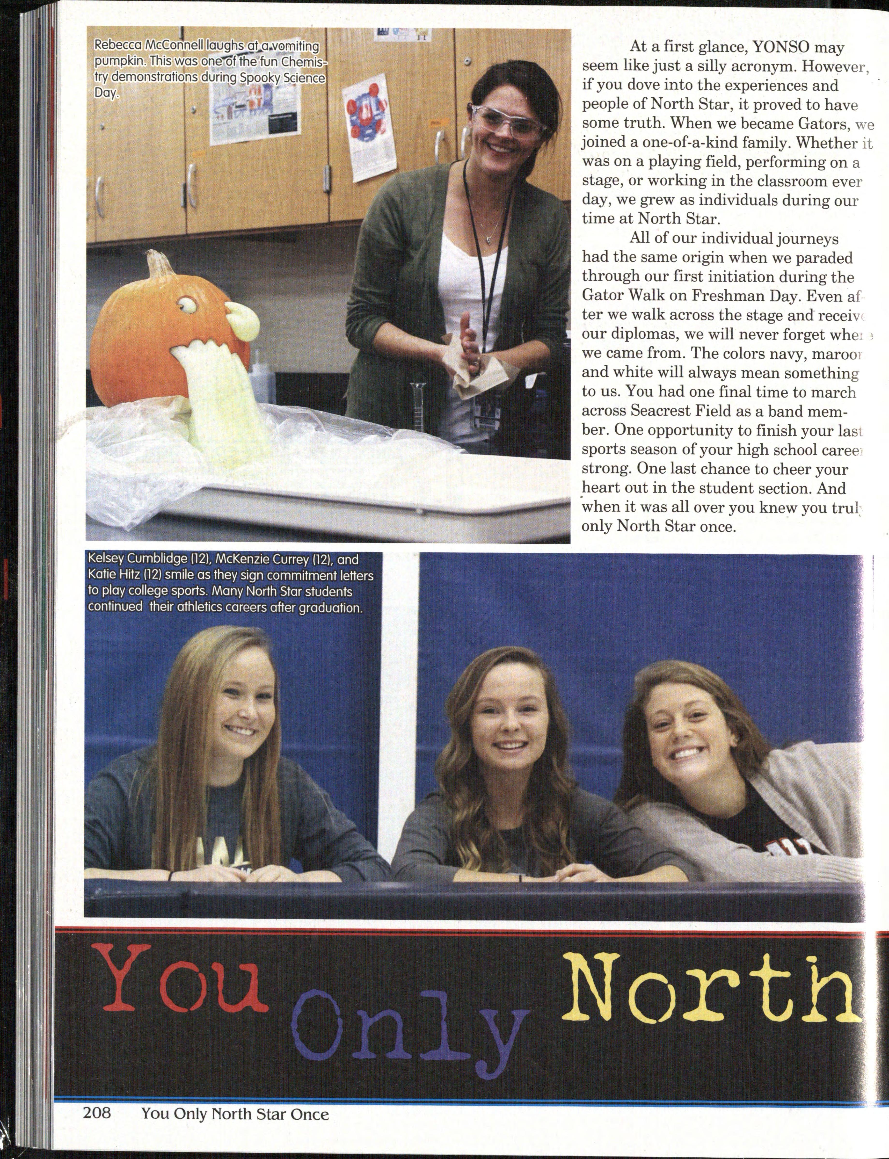 At a first glance, YONSO may seem like just a silly acronym. Howev e r, if you dove in to the experiences and people of North Star, it proved to hav e some truth. When we became Gators , we joined a one-of-a-kind family. Whethe r it was on a playing field, performing on a stage, or working in the classroom eve r day, we grew as individuals during ou r time at North Star.