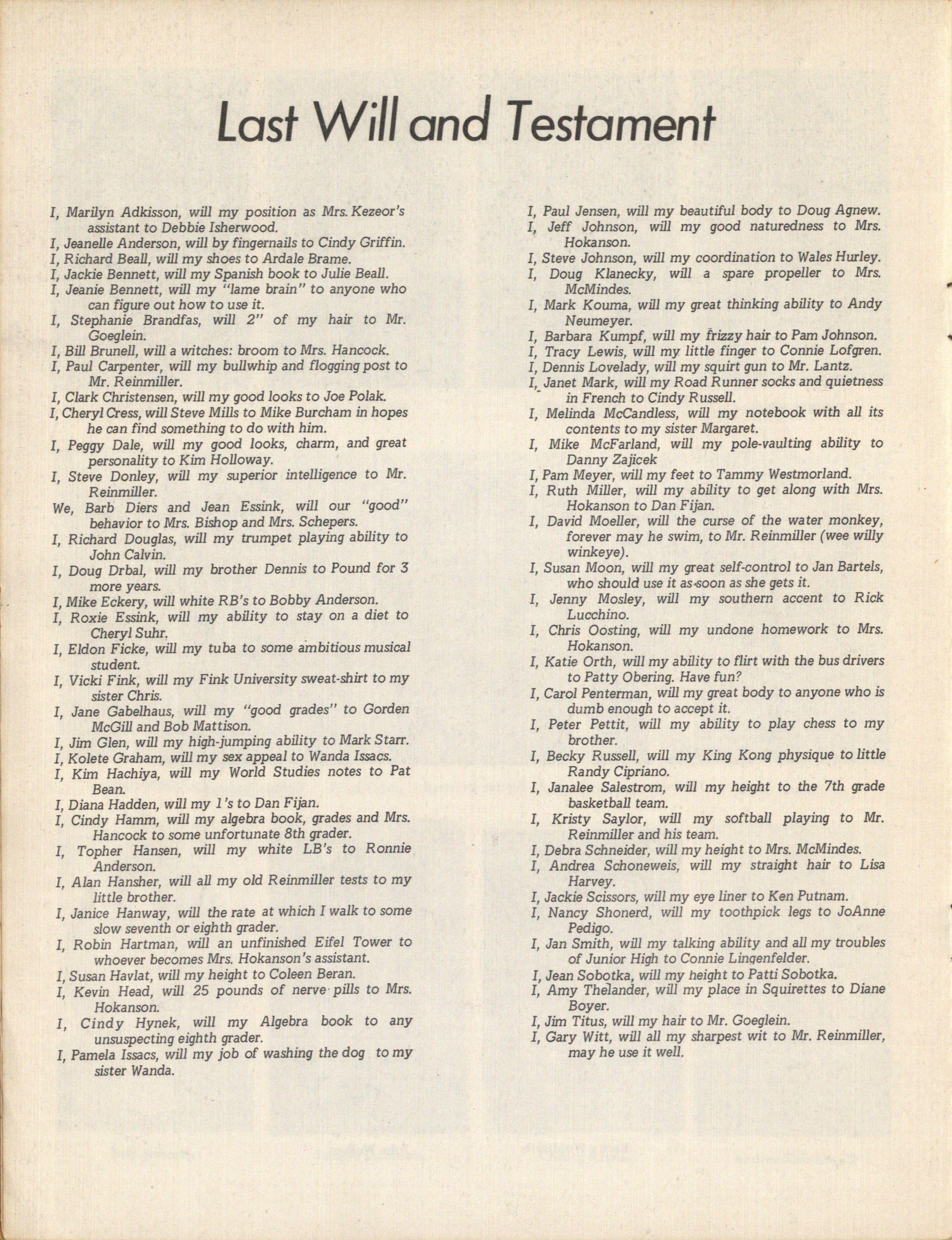 I, Jane Gabelhaus, will my "good grades" to Gorden McGill and Bob Mattison.
