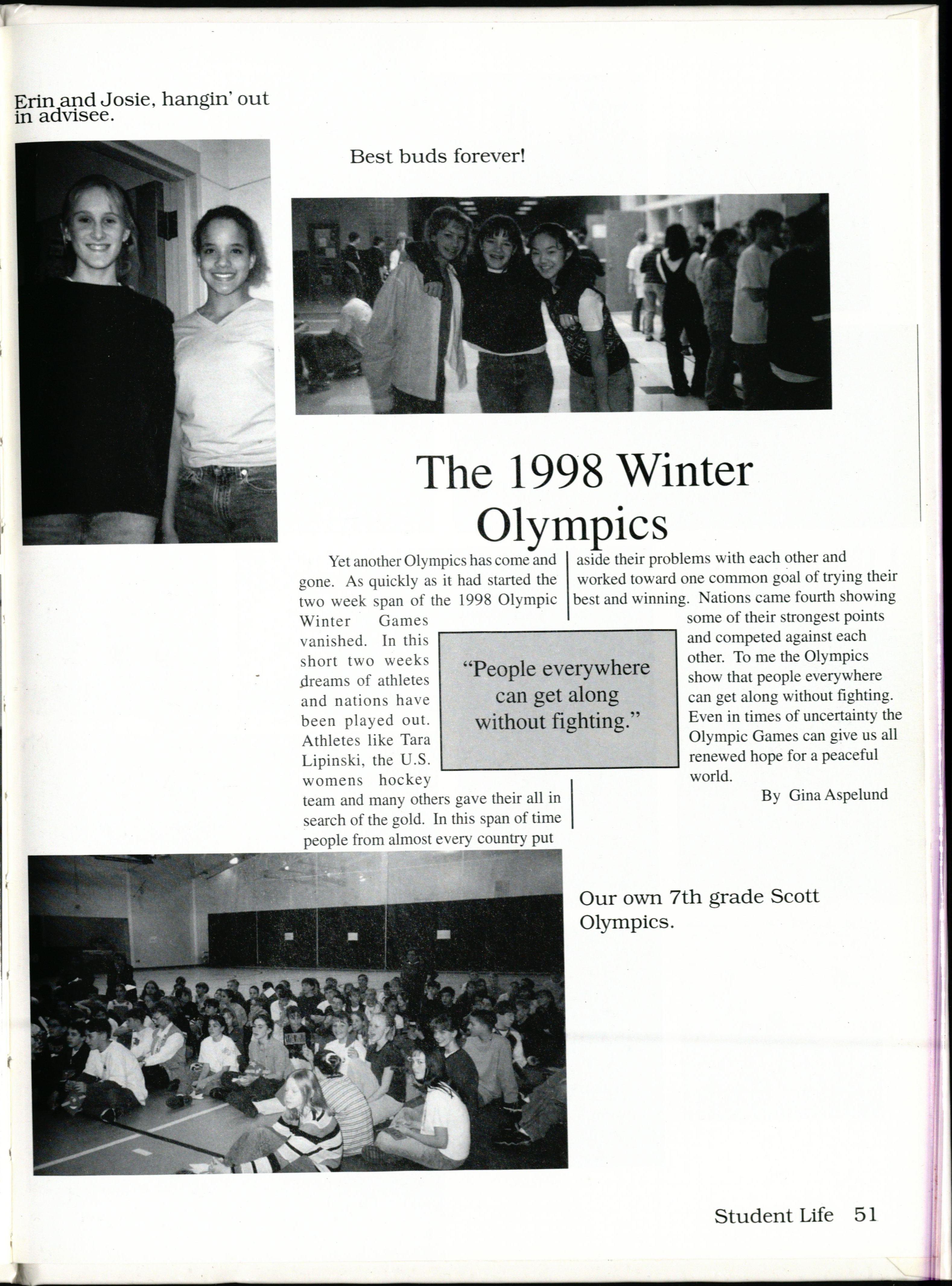 Yet another Olympics has come and a ide their problem with each other and gone. As quickly a it had tarted the worked toward one common goal of trying their two week span of the 1998 Olympic be t and winning. ation came fourth howing Winter Games .----------------. ome of their trongest point vanished. In this and competed against each short two week other. To me the Olympic .dreams of athletes "People everywhere how that people everywhere and nation have can get along can get along without fighting. been played out. without fighting." Even in times of uncertainty the Athlete like Tara Olympic Game can give u all Lipinski, the U.S ._______________. renewed hope for a peaceful womens hockey world. team and many other gave their all in