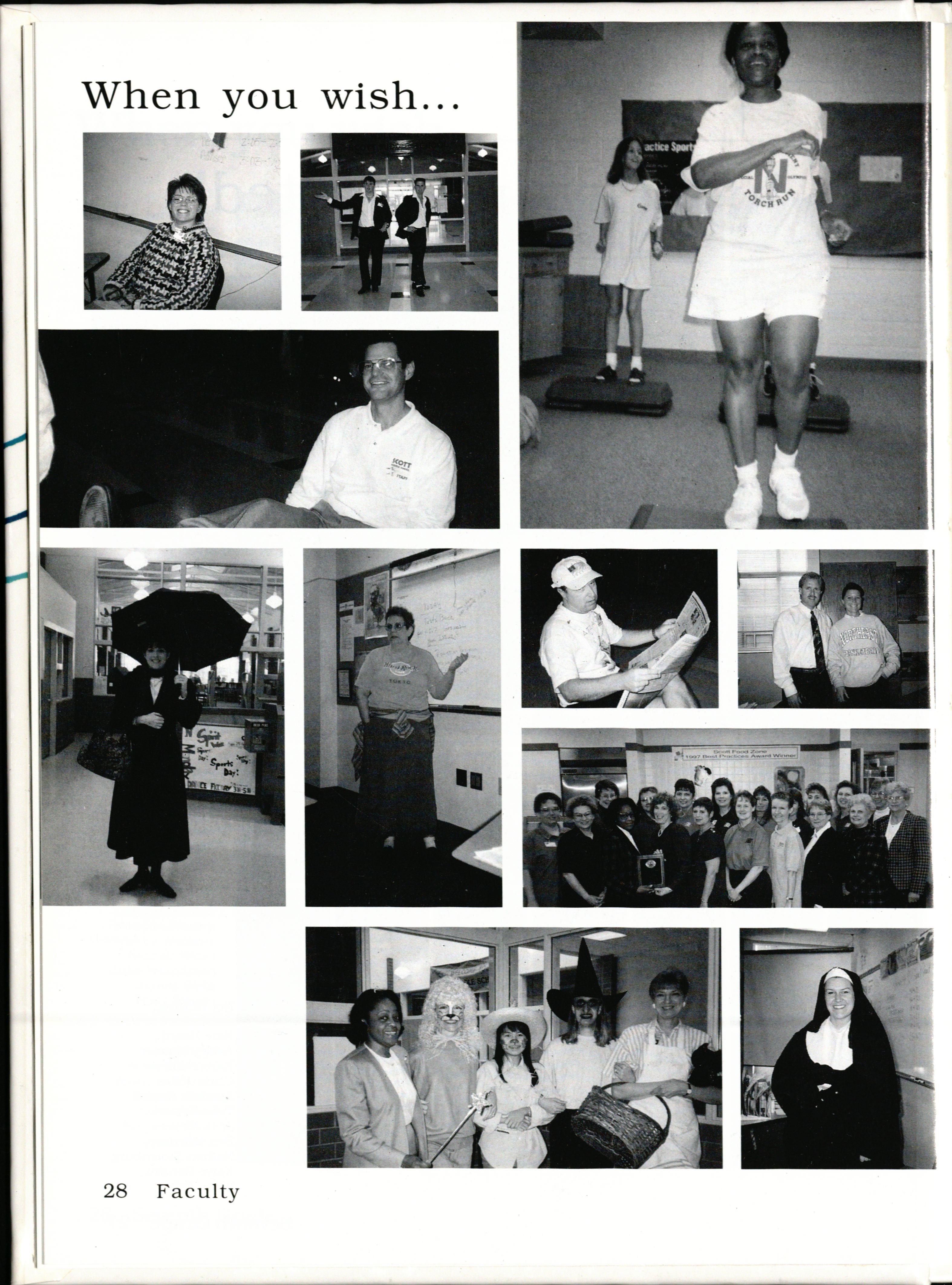Spirit week at Scott Middle School is always a great succe s. This year there was a tremendous amount of participation and creativity. September 29 through October 3 were five wacky days. The week started off with sports day. People wore their uniforms or clothing from their favorite port or team. On Tuesday , people dressed up as movie stars A favorite was the three ninth grade witche from The Craft. The office staff dressed a character from The Wizard of Oz. Wedne day was not as uccessful