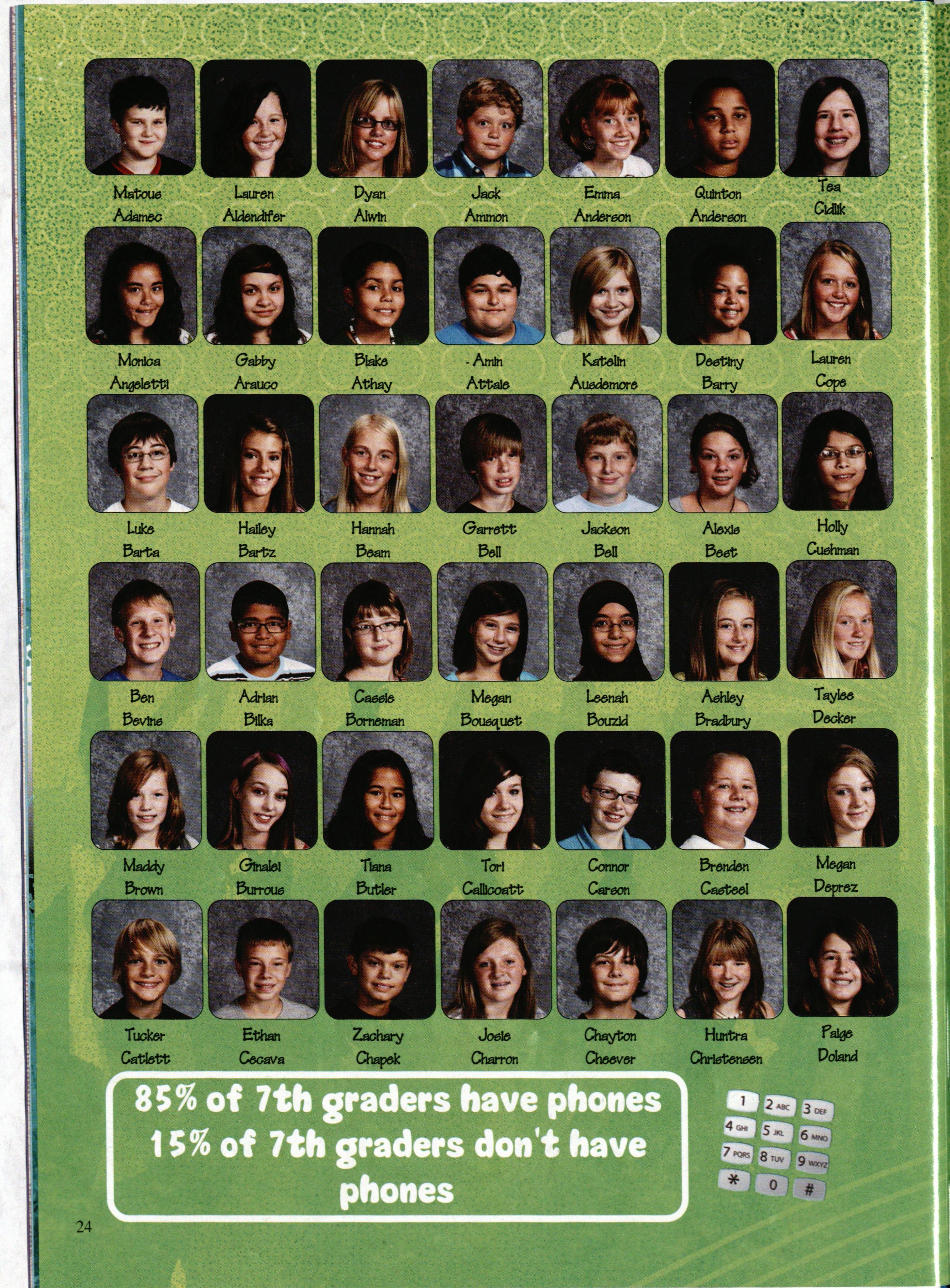 Seven ;·ffade is In the ~..,..:~~~,, mlddle of everythln1.You're not the new kids, but you 're not given the responsibility of leading the school. Seventh grade is a great time to make new friends and prove to yourself that you really can accomplish anything you put your -mind to. Don't forget to try your hardest in all that you do, and remember all the 100d times you've had this past year.
