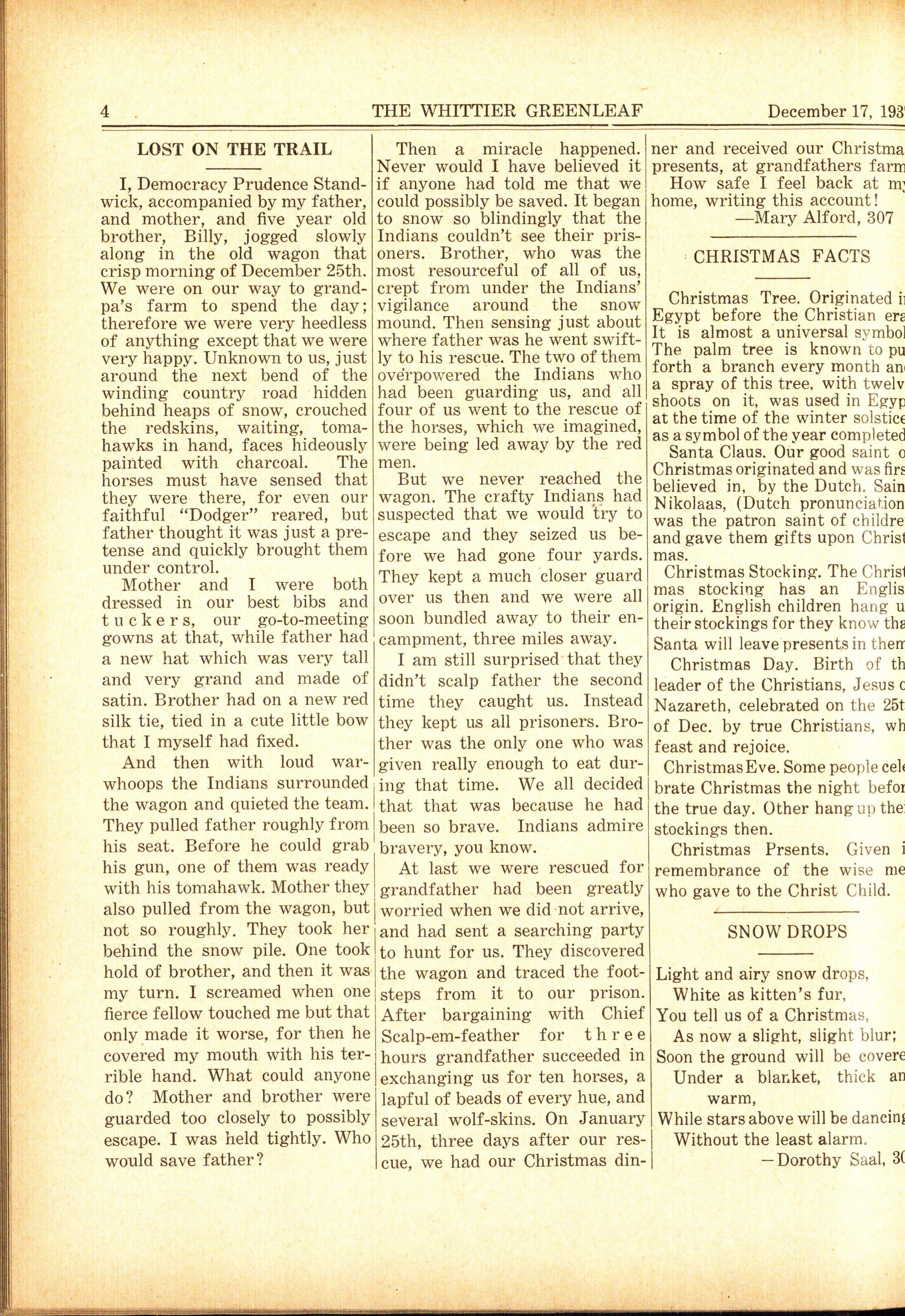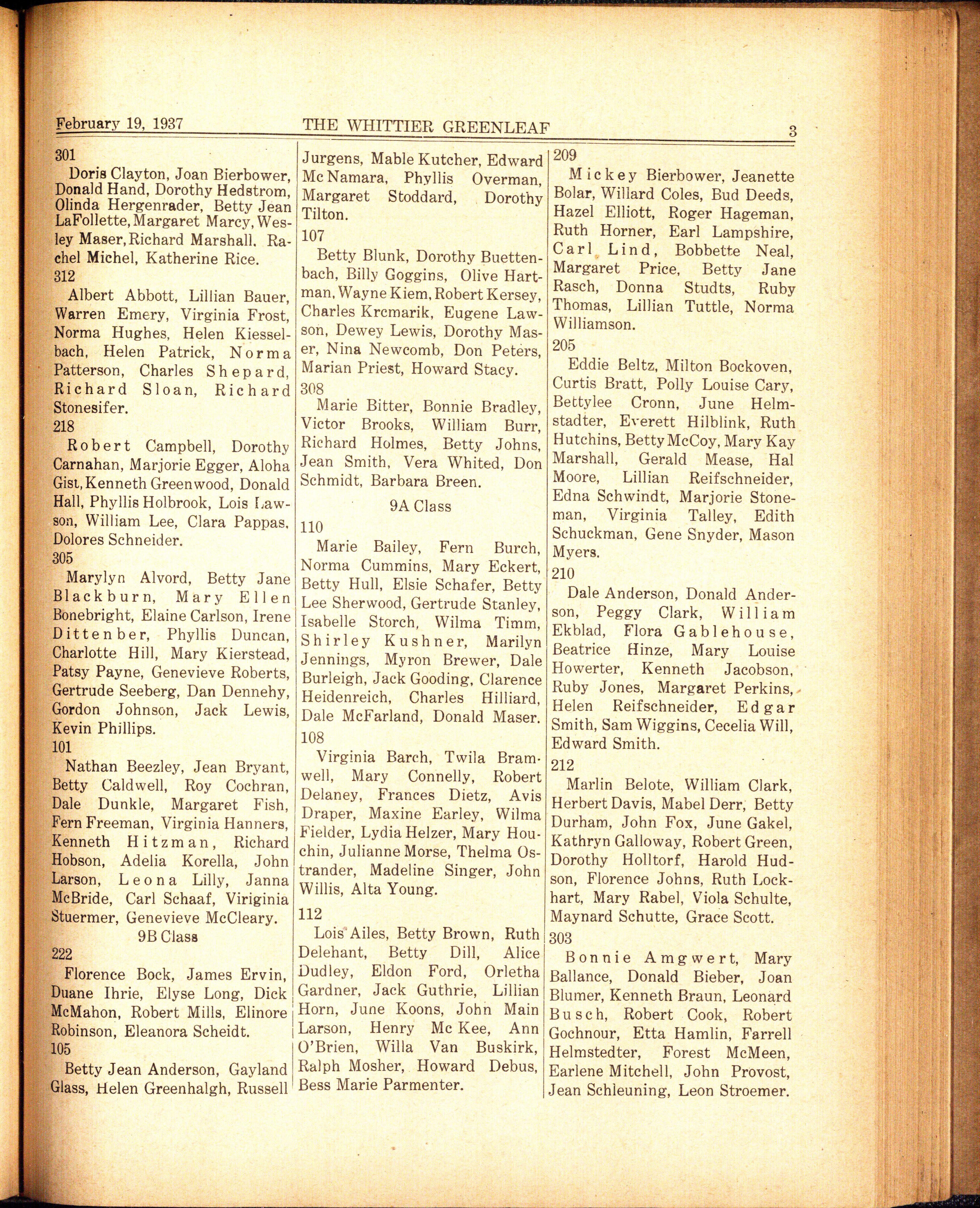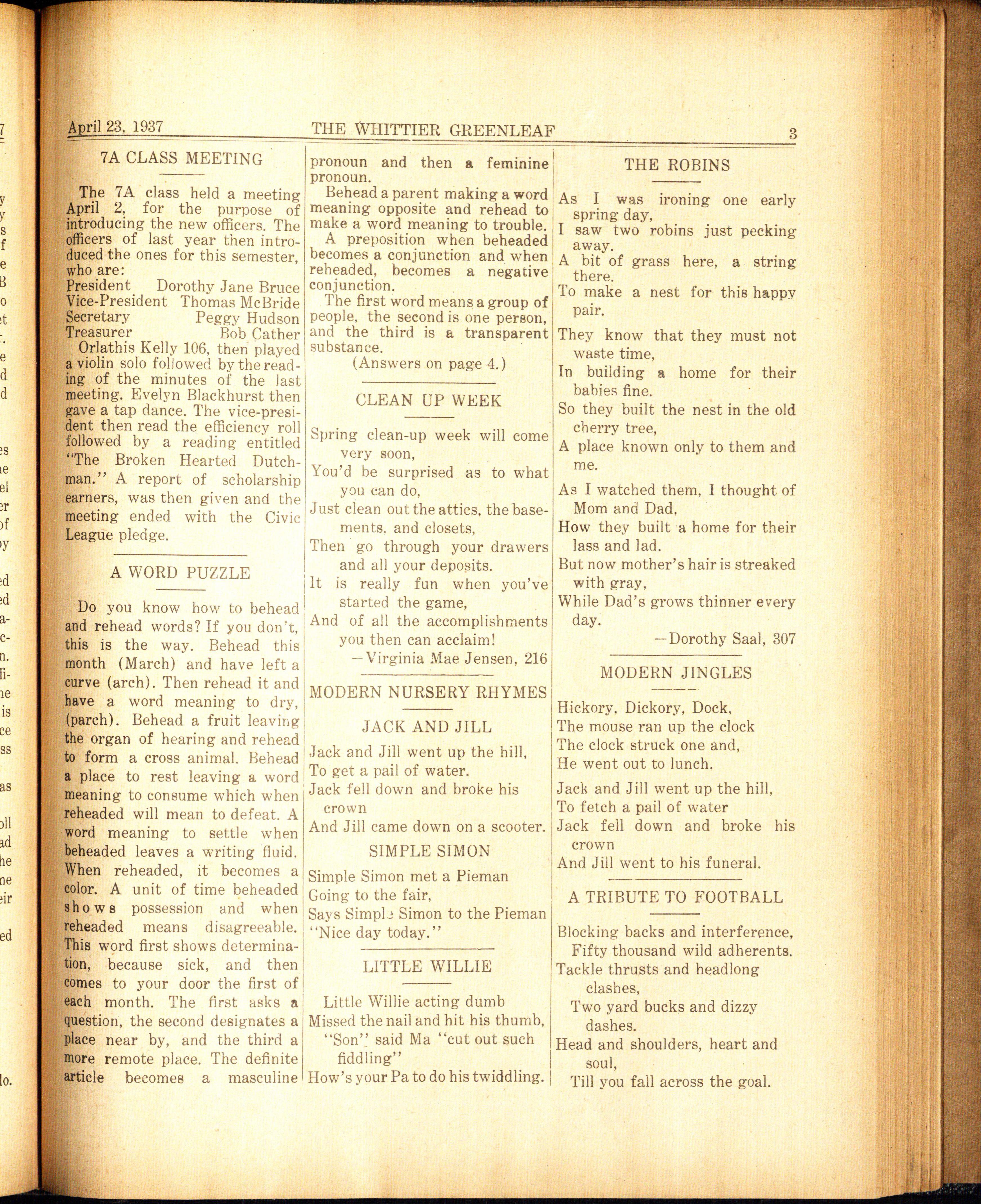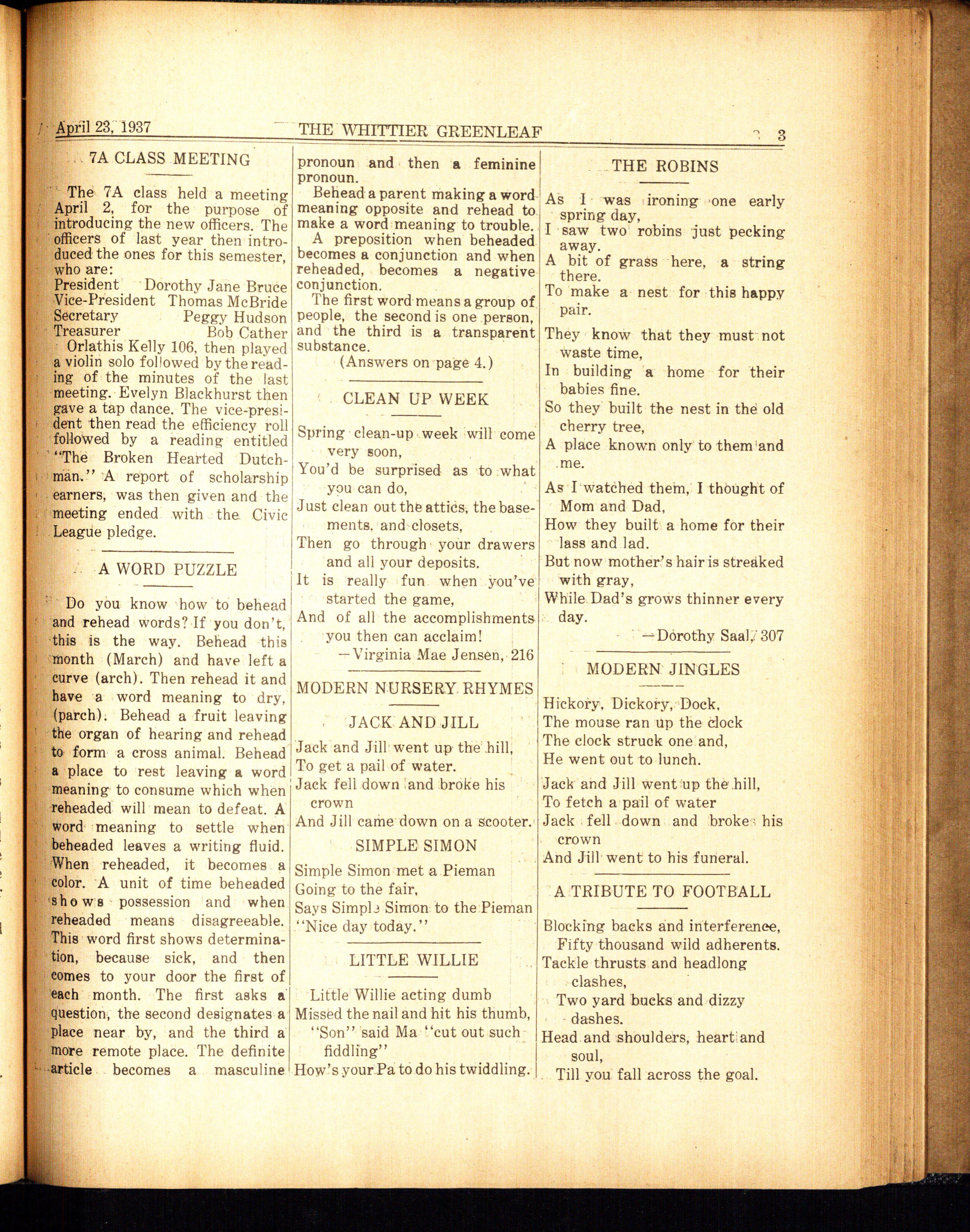 This semester's Greenleaf assembly which was held Friday the 19th, was one of the m ost novel of Whittier's assembl i es. It was in form of a birthday party. This surprise party was given for Greenleaf (represent- ed by Bud Deeds). There was a birthday cake holding fourteen candles, for Greenleaf's fourteenth birthday. His godmother, Betty Hull, wished him well. Greenleaf received a paddling from the Boy. He also added two for good luck. Ouch! We wonder if it hurt . A package was presented to Greenleaf. Besides containing a present for him it had a prize 7A Class for the home room having the · 309 highest number of subscriptions