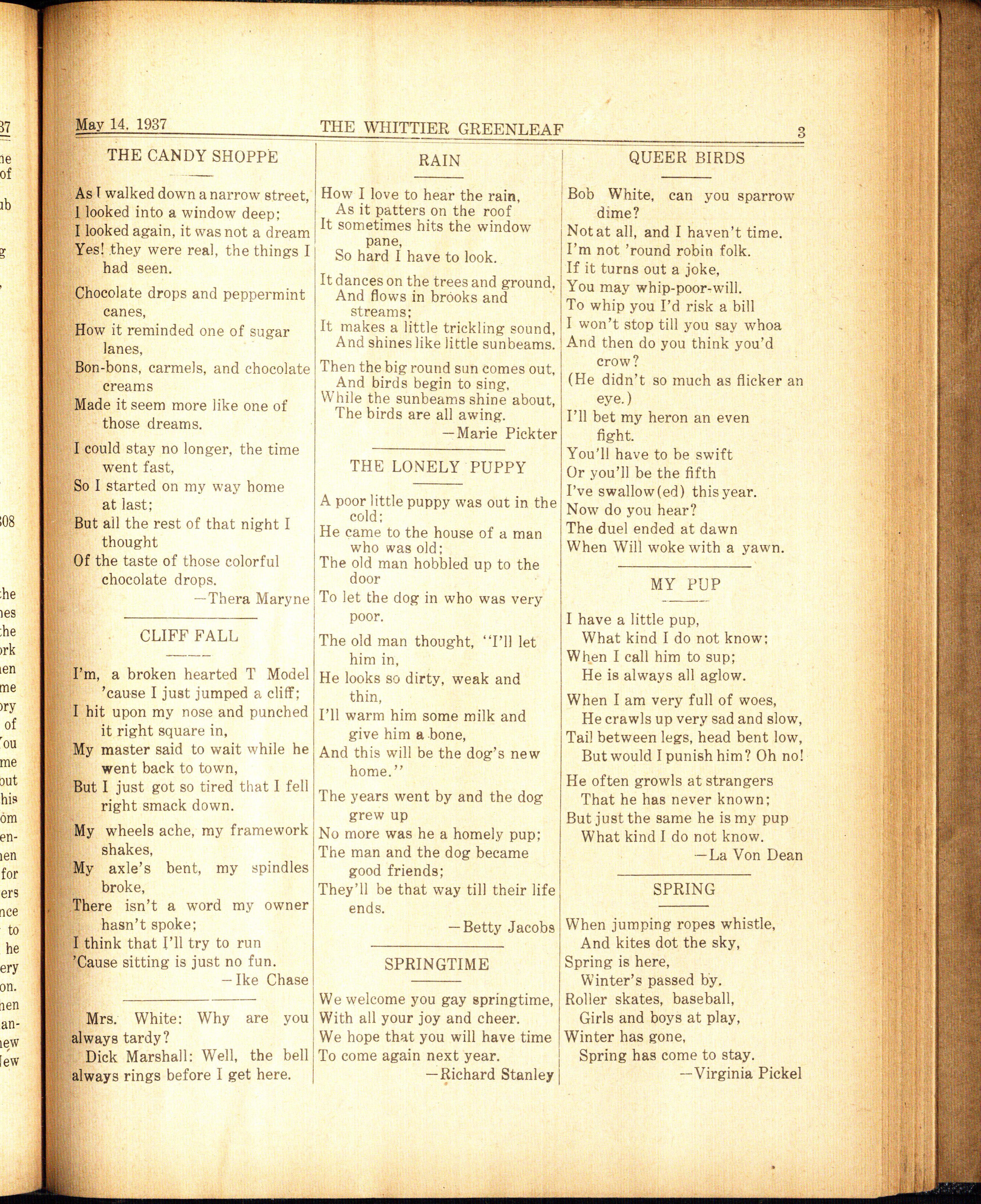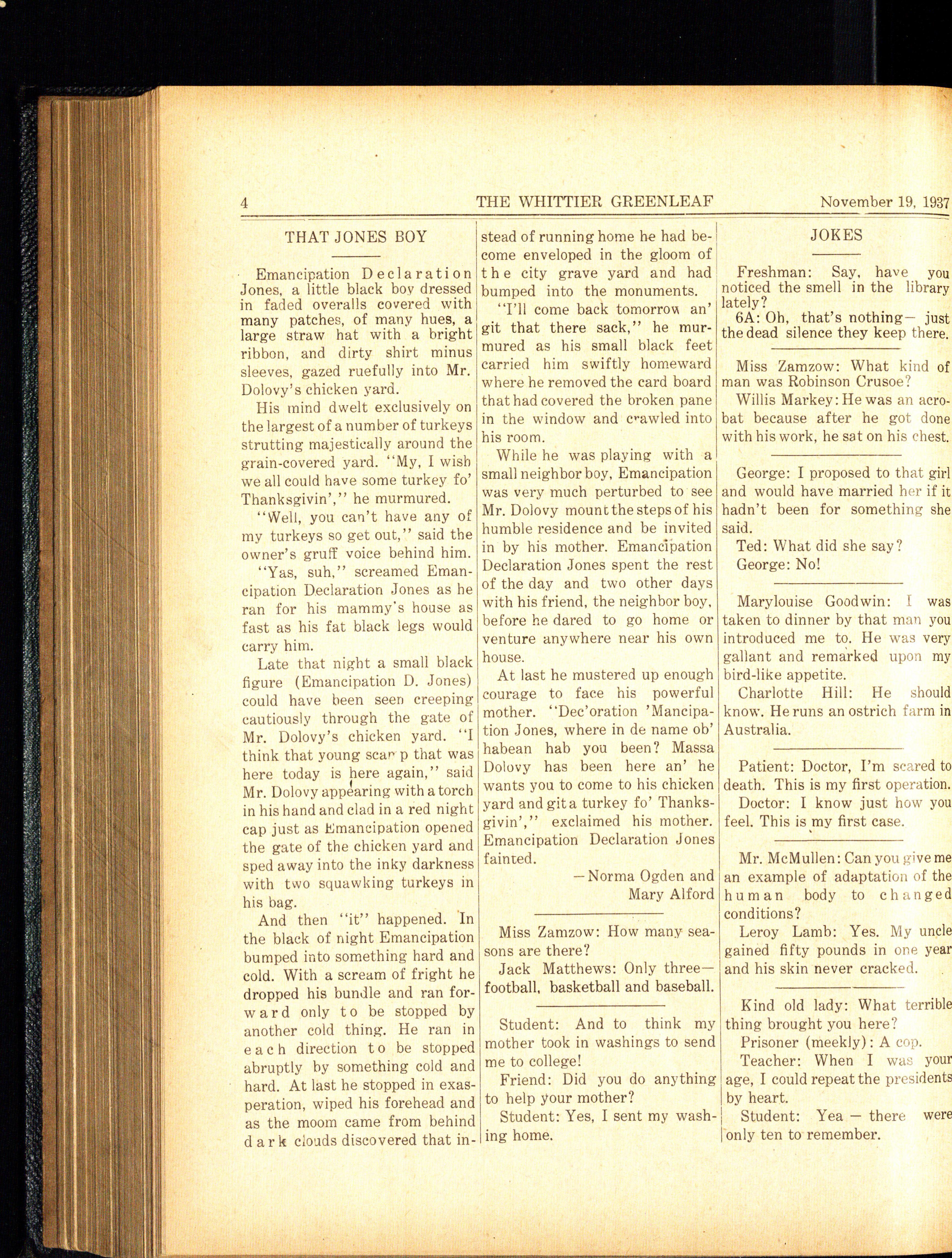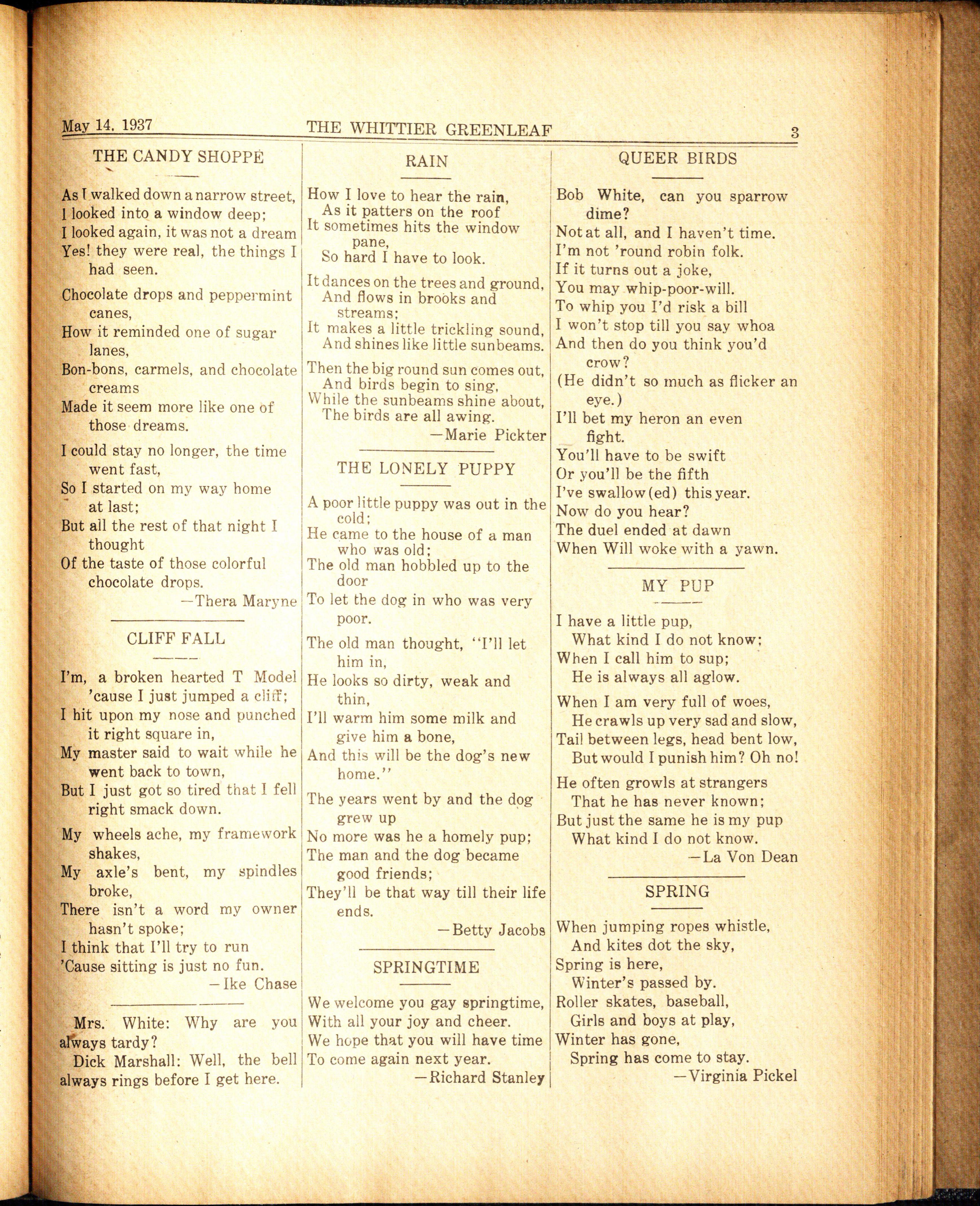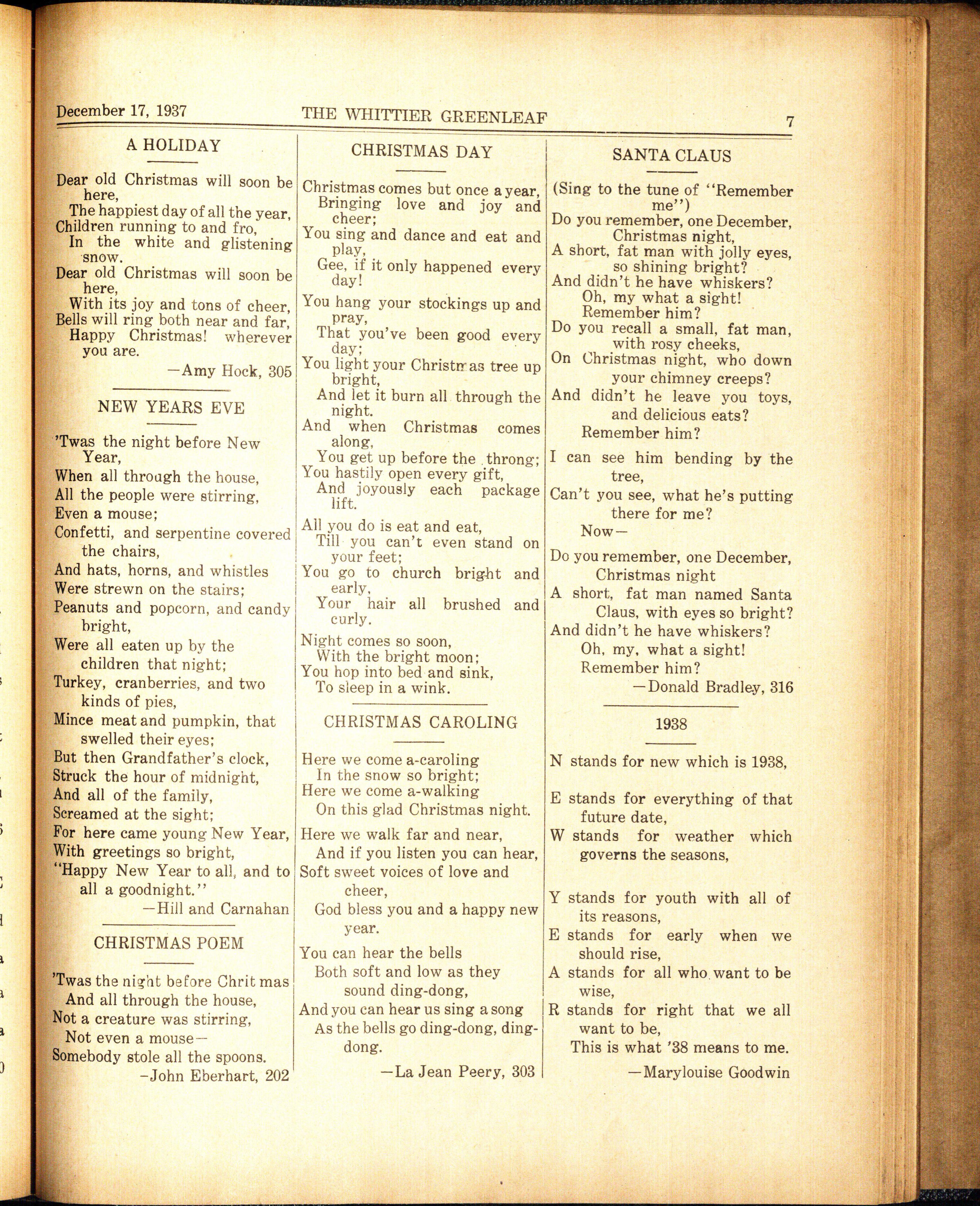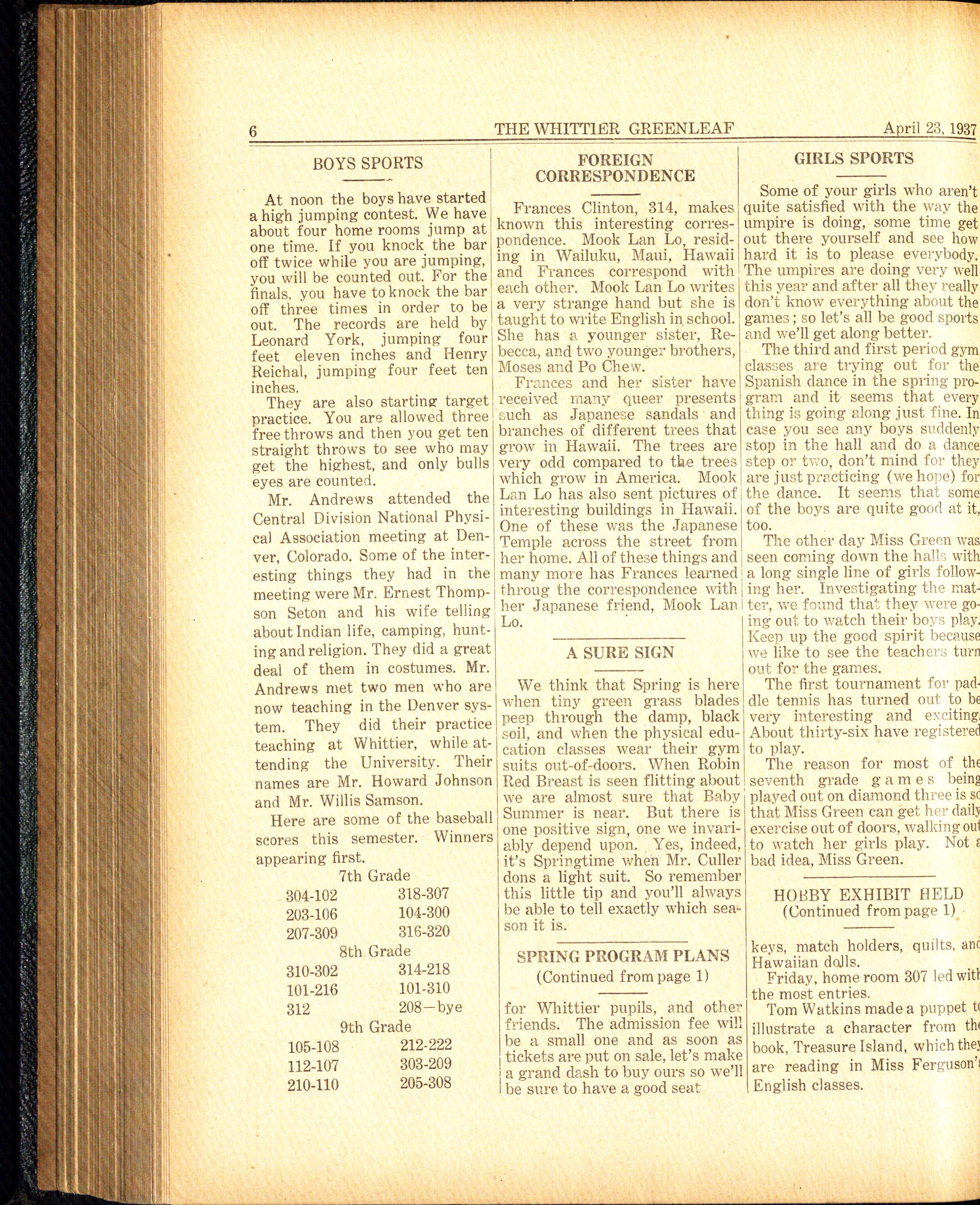 This semester's Greenleaf assembly which was held Friday the 19th, was one of the m ost novel of Whittier's assembl i es. It was in form of a birthday party. This surprise party was given for Greenleaf (represent- ed by Bud Deeds). There was a birthday cake holding fourteen candles, for Greenleaf's fourteenth birthday. His godmother, Betty Hull, wished him well. Greenleaf received a paddling from the Boy. He also added two for good luck. Ouch! We wonder if it hurt . A package was presented to Greenleaf. Besides containing a present for him it had a prize 7A Class for the home room having the · 309 highest number of subscriptions