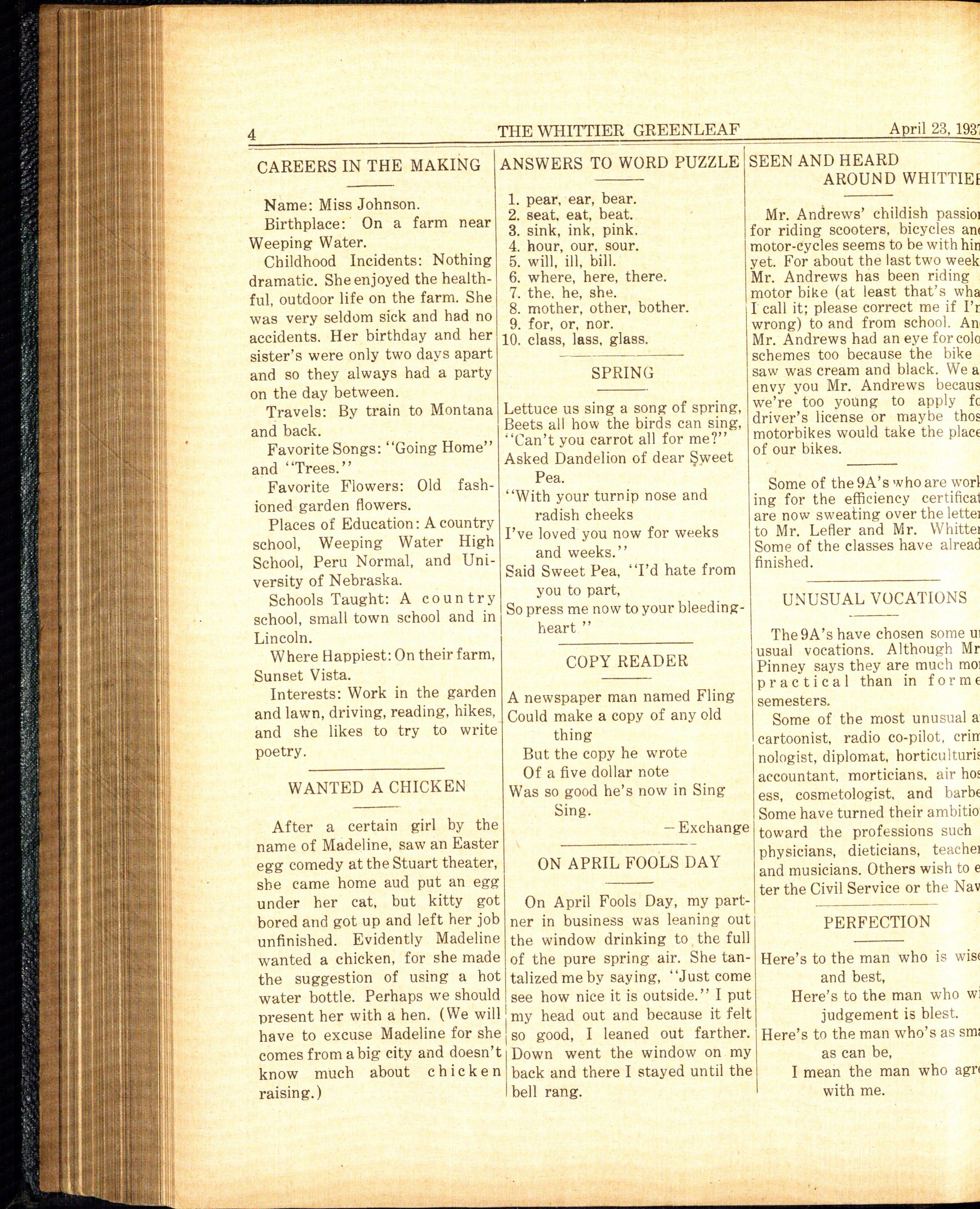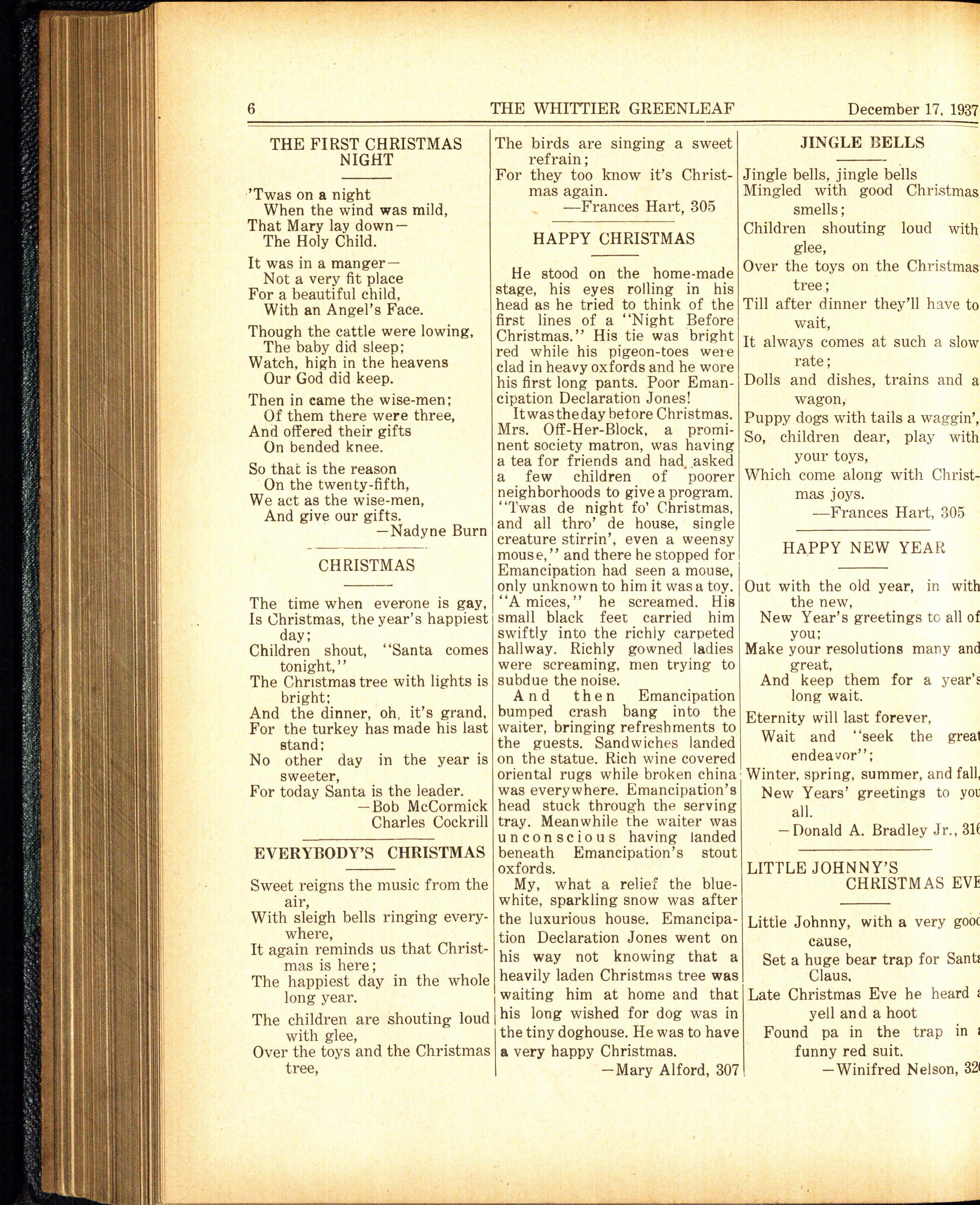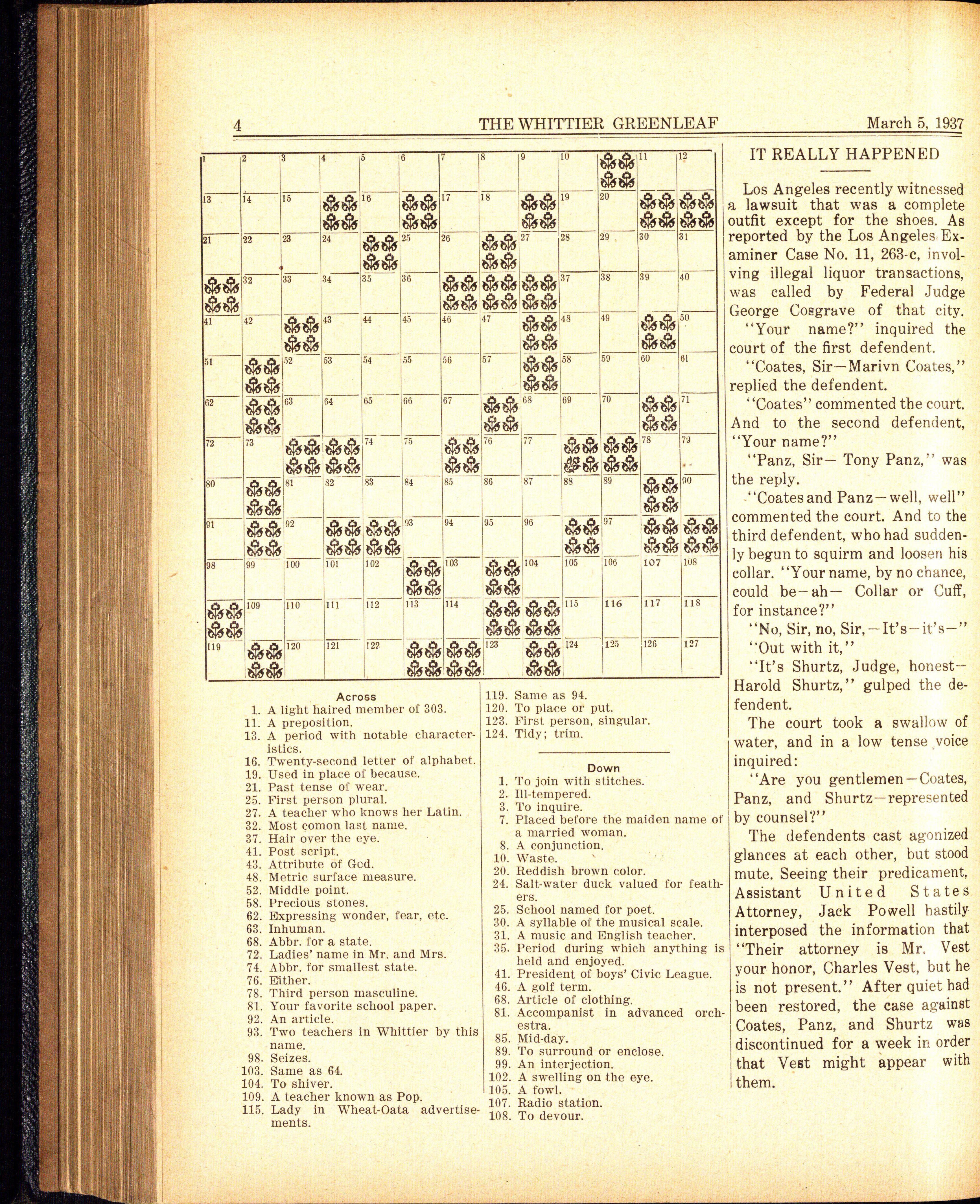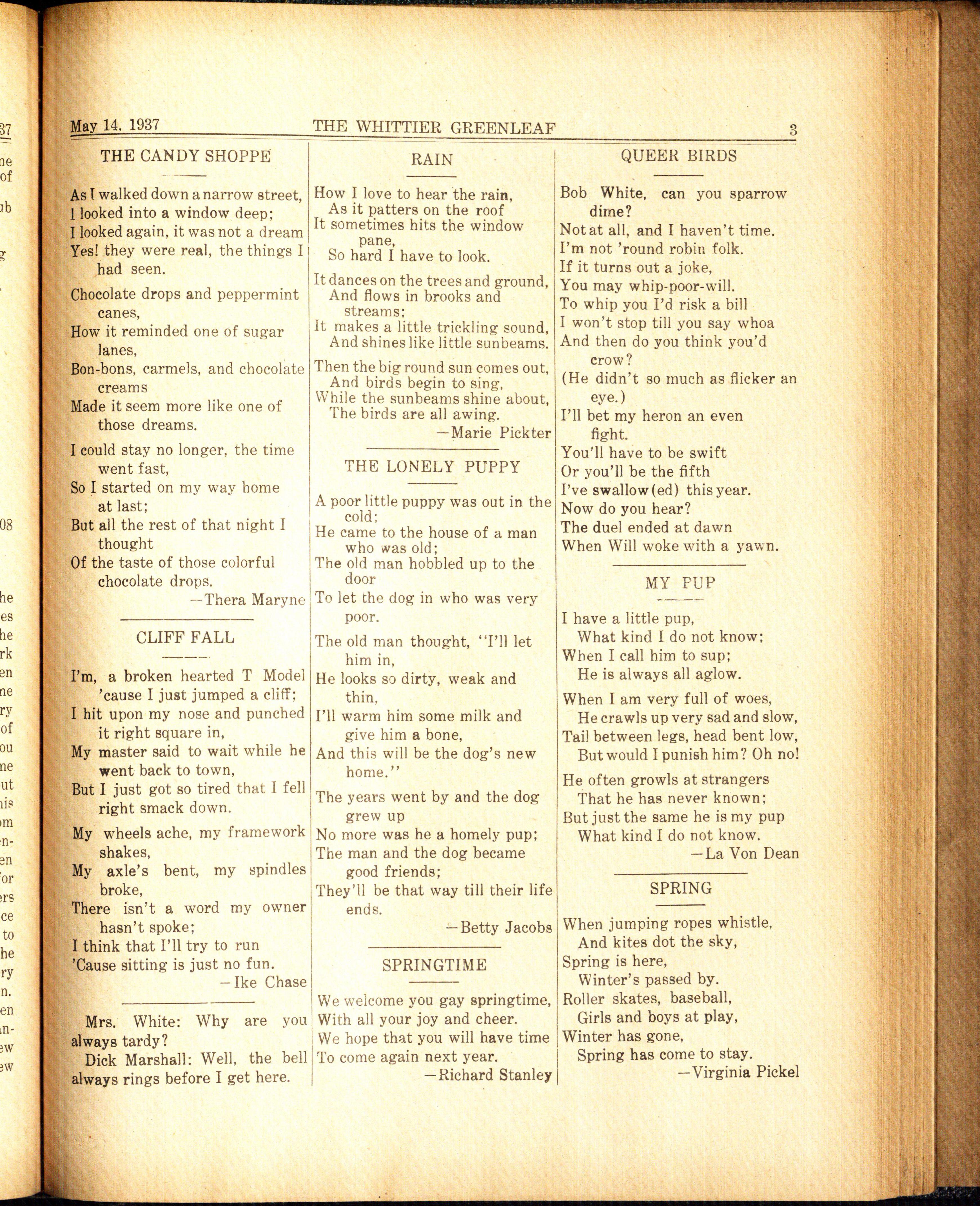 This semester's Greenleaf assembly which was held Friday the 19th, was one of the m ost novel of Whittier's assembl i es. It was in form of a birthday party. This surprise party was given for Greenleaf (represent- ed by Bud Deeds). There was a birthday cake holding fourteen candles, for Greenleaf's fourteenth birthday. His godmother, Betty Hull, wished him well. Greenleaf received a paddling from the Boy. He also added two for good luck. Ouch! We wonder if it hurt . A package was presented to Greenleaf. Besides containing a present for him it had a prize 7A Class for the home room having the · 309 highest number of subscriptions