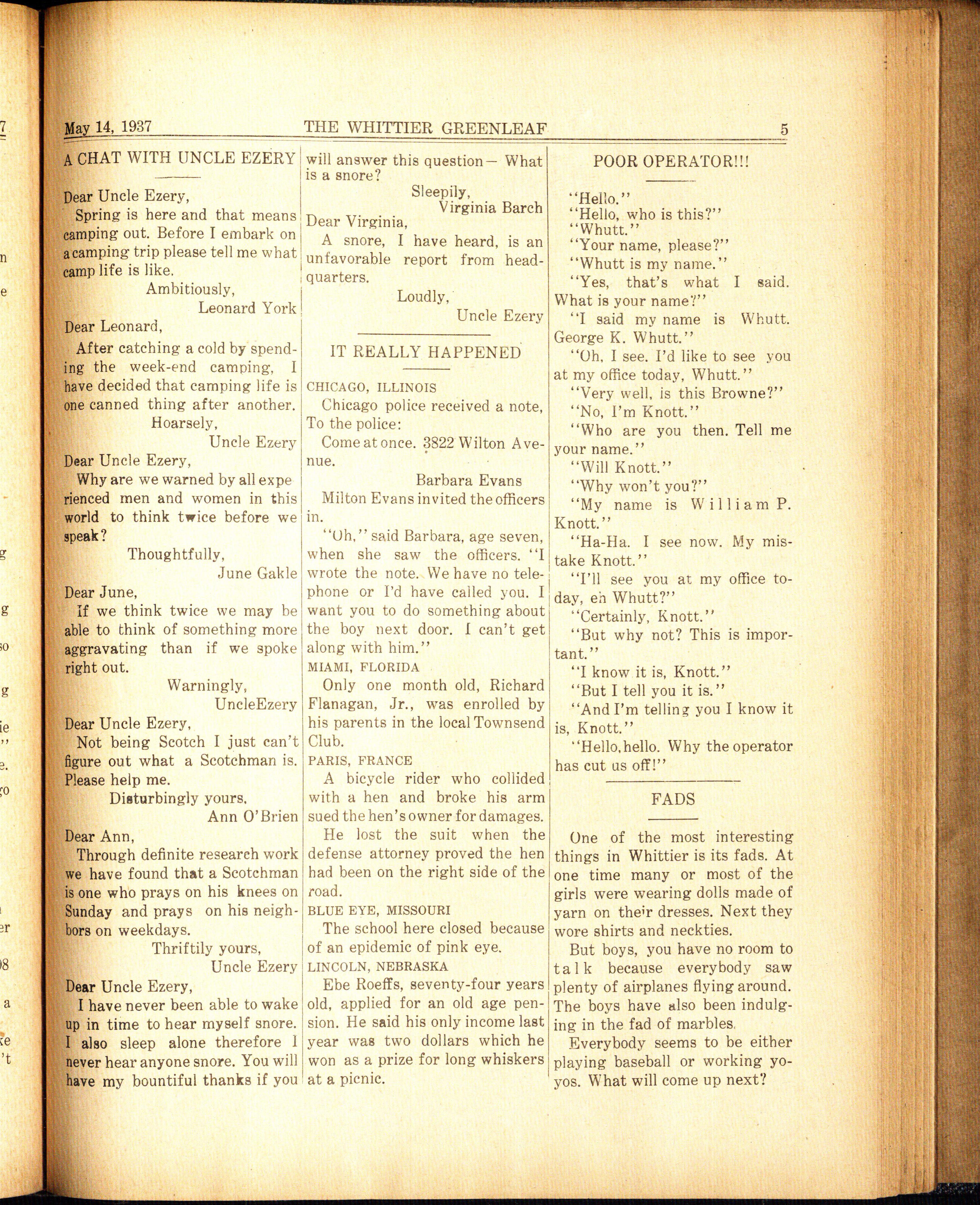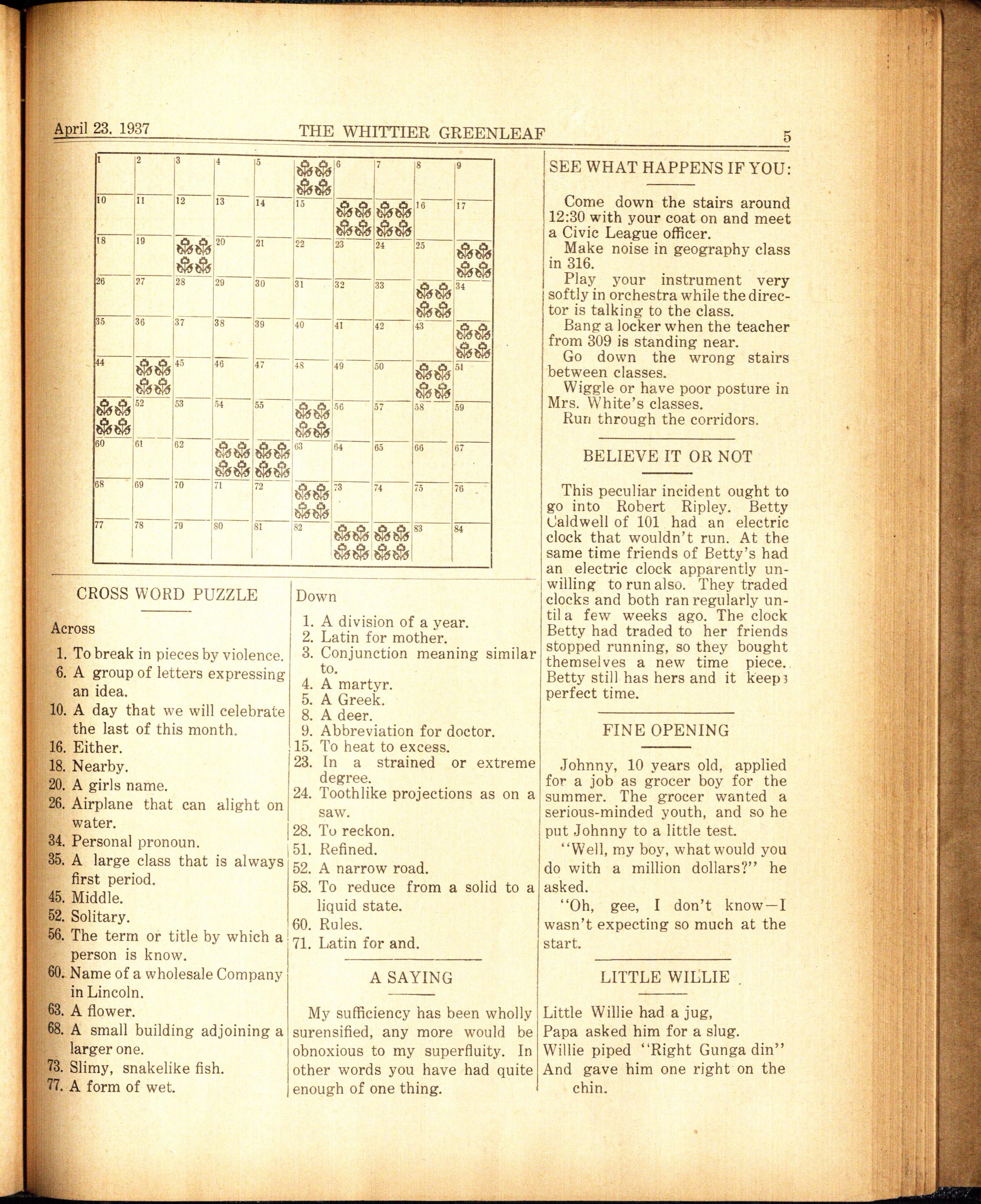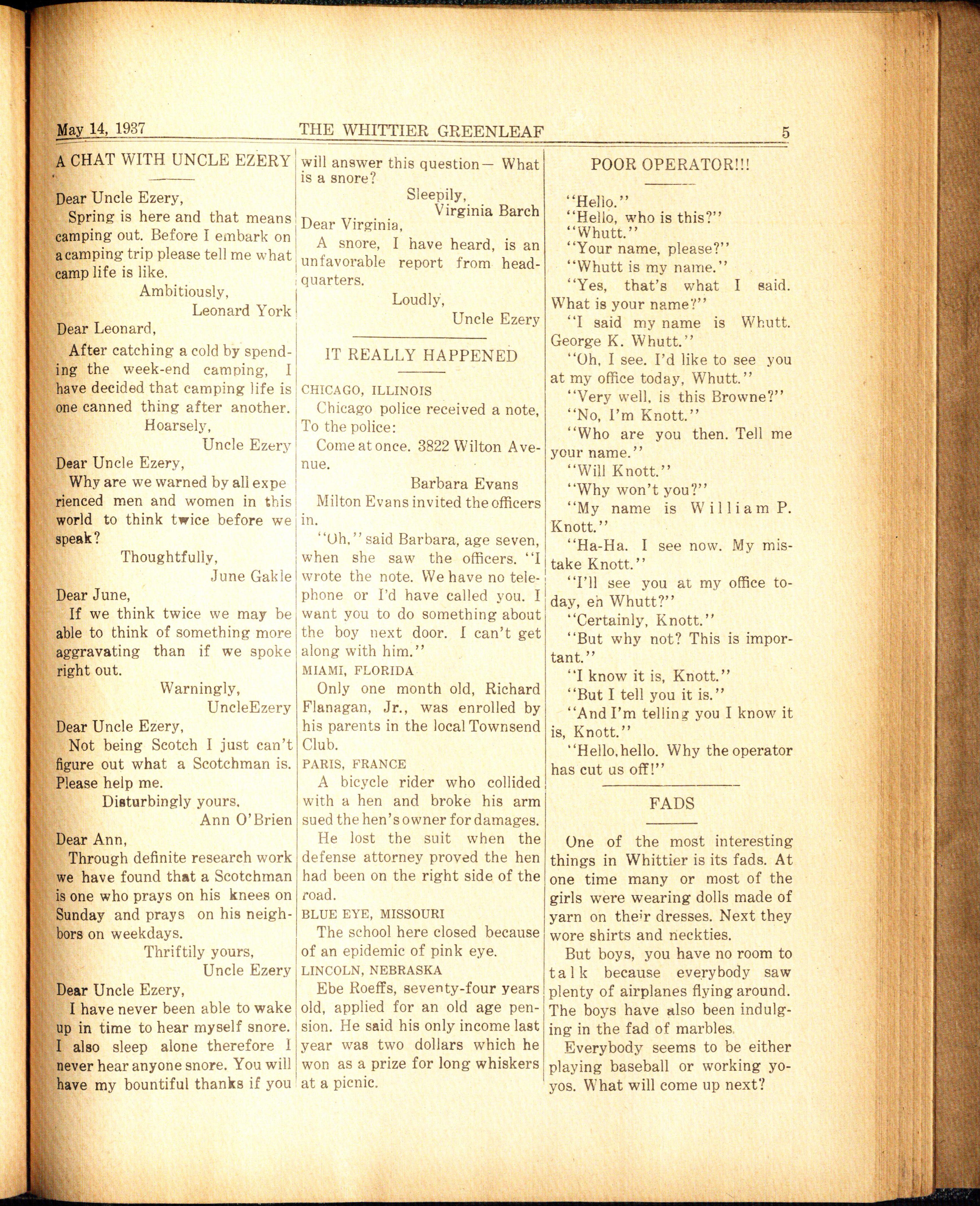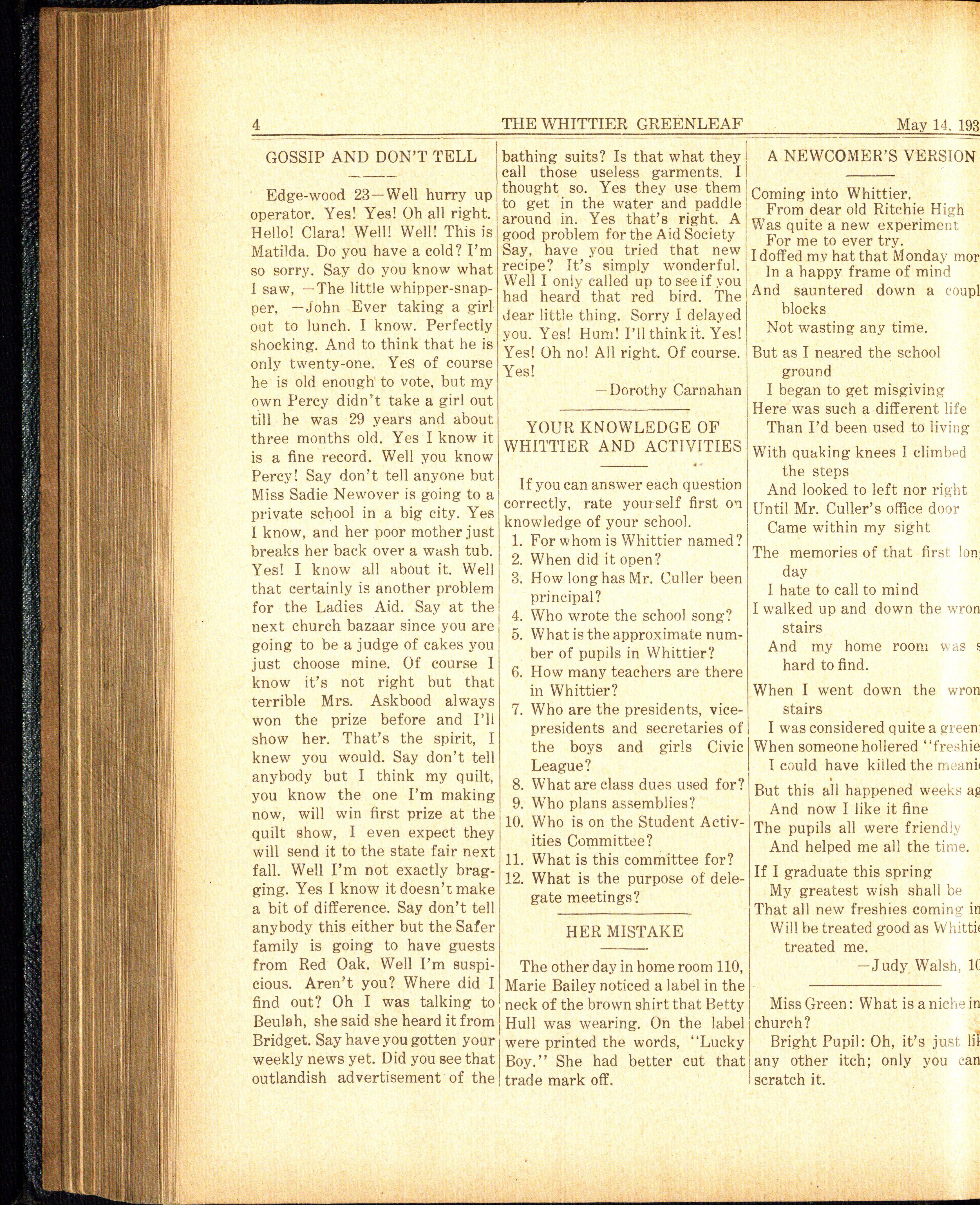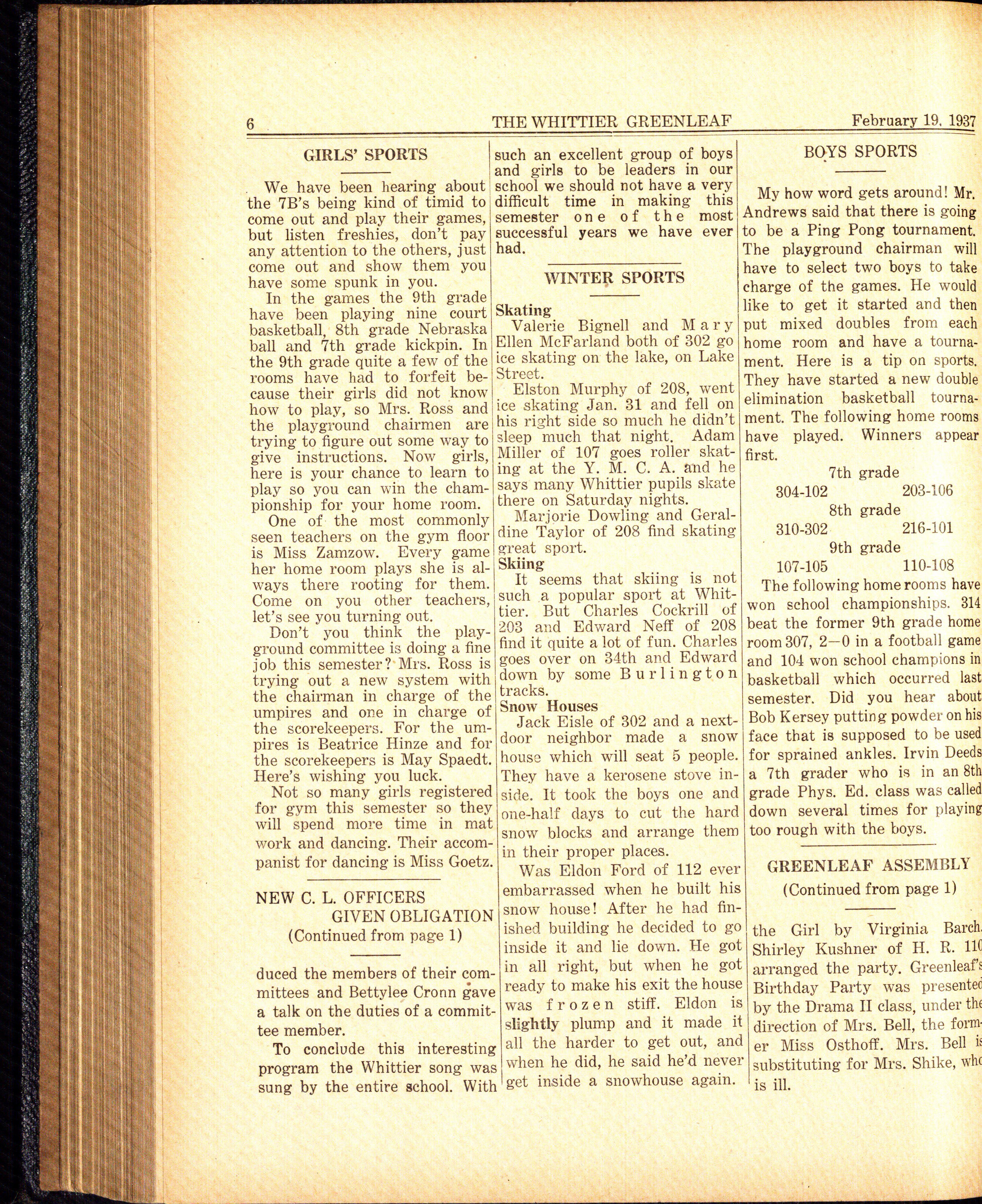 This semester's Greenleaf assembly which was held Friday the 19th, was one of the m ost novel of Whittier's assembl i es. It was in form of a birthday party. This surprise party was given for Greenleaf (represent- ed by Bud Deeds). There was a birthday cake holding fourteen candles, for Greenleaf's fourteenth birthday. His godmother, Betty Hull, wished him well. Greenleaf received a paddling from the Boy. He also added two for good luck. Ouch! We wonder if it hurt . A package was presented to Greenleaf. Besides containing a present for him it had a prize 7A Class for the home room having the · 309 highest number of subscriptions