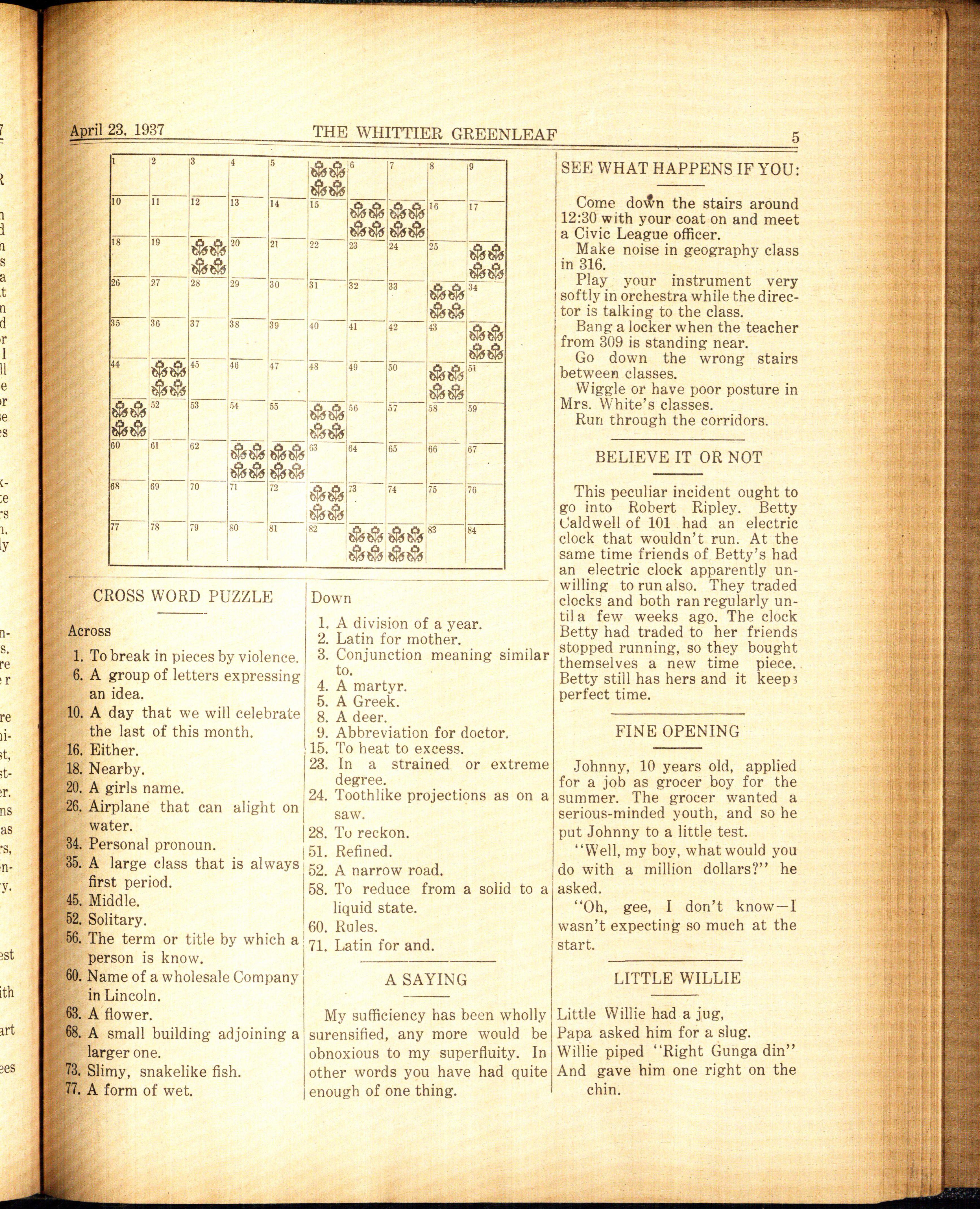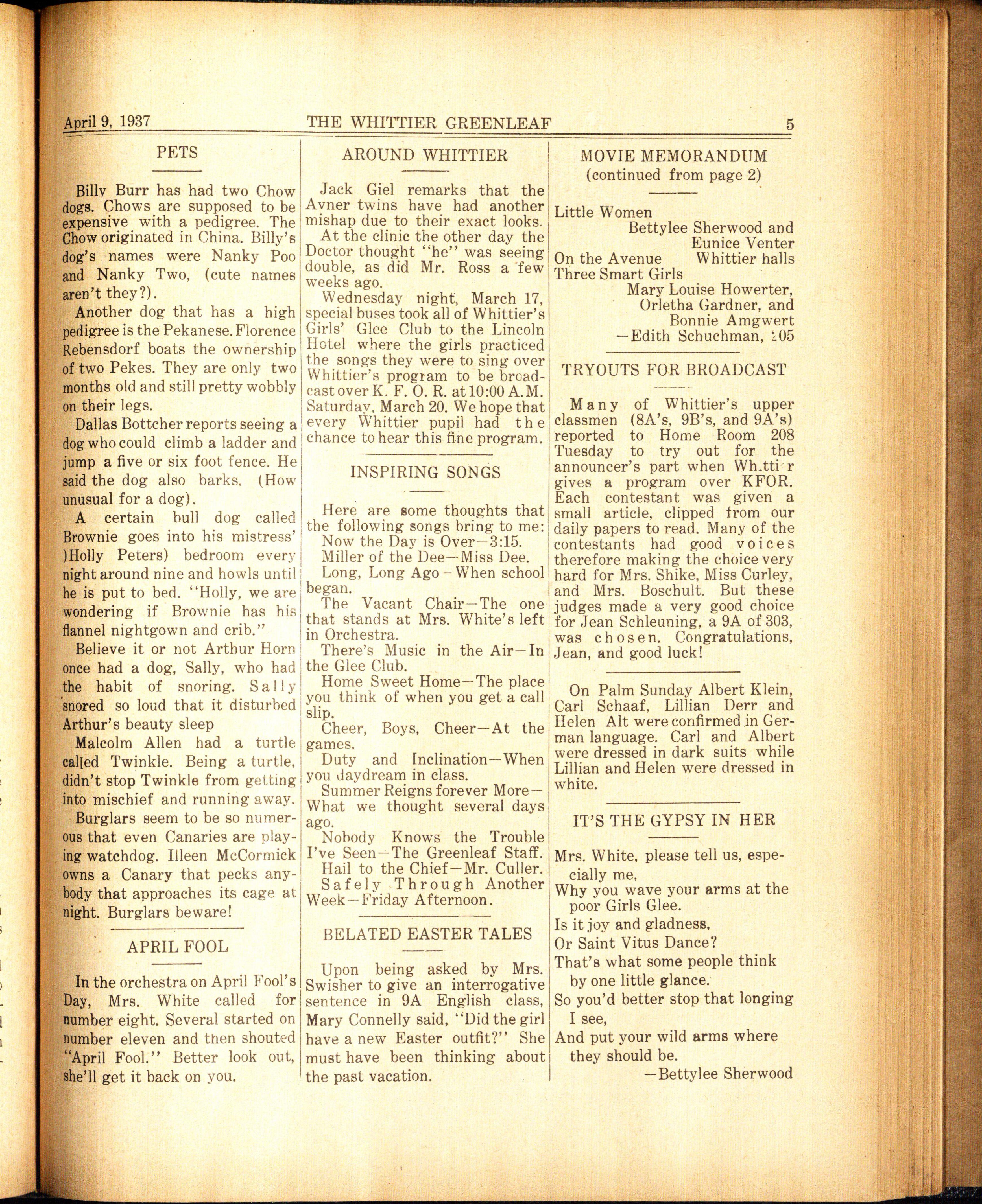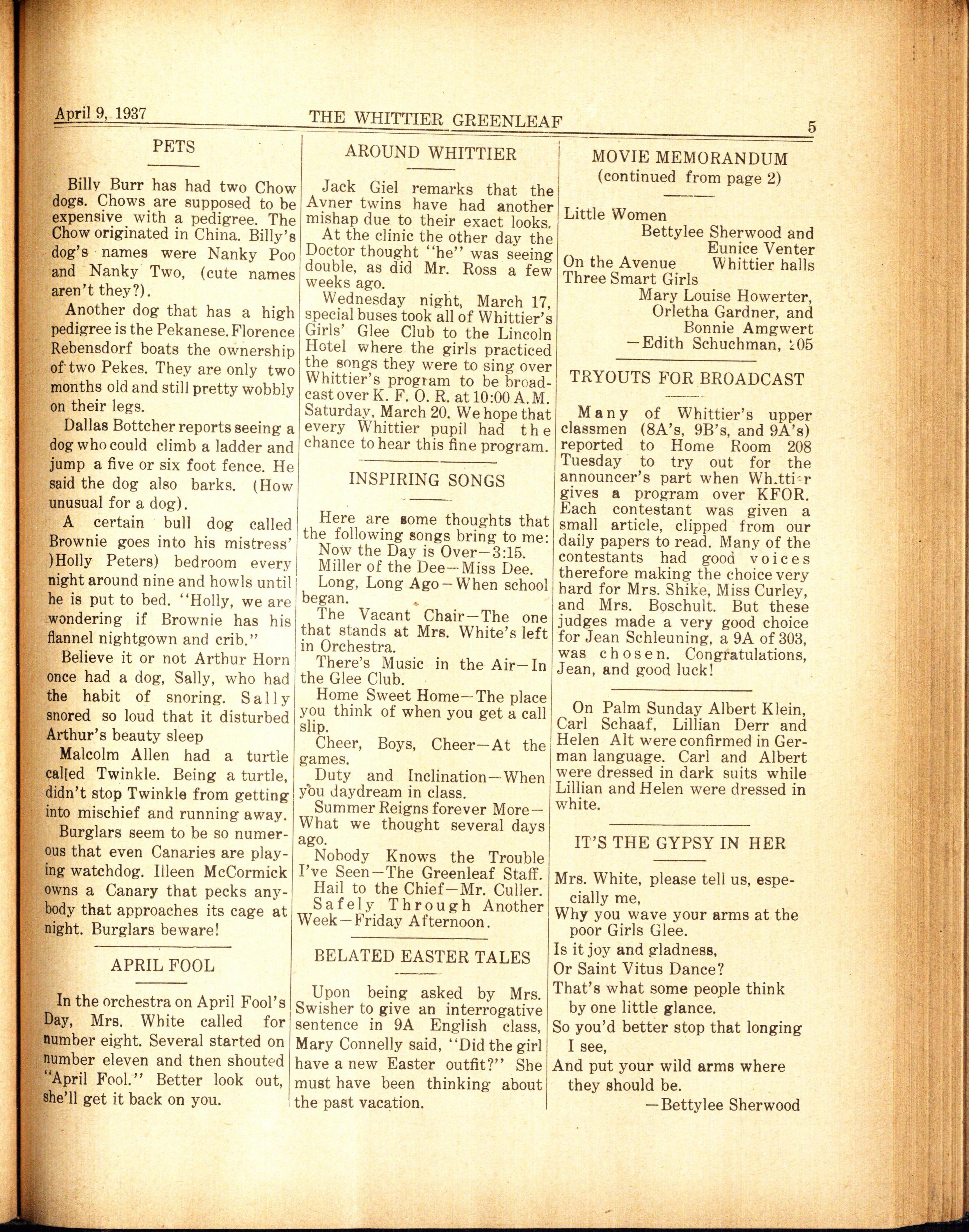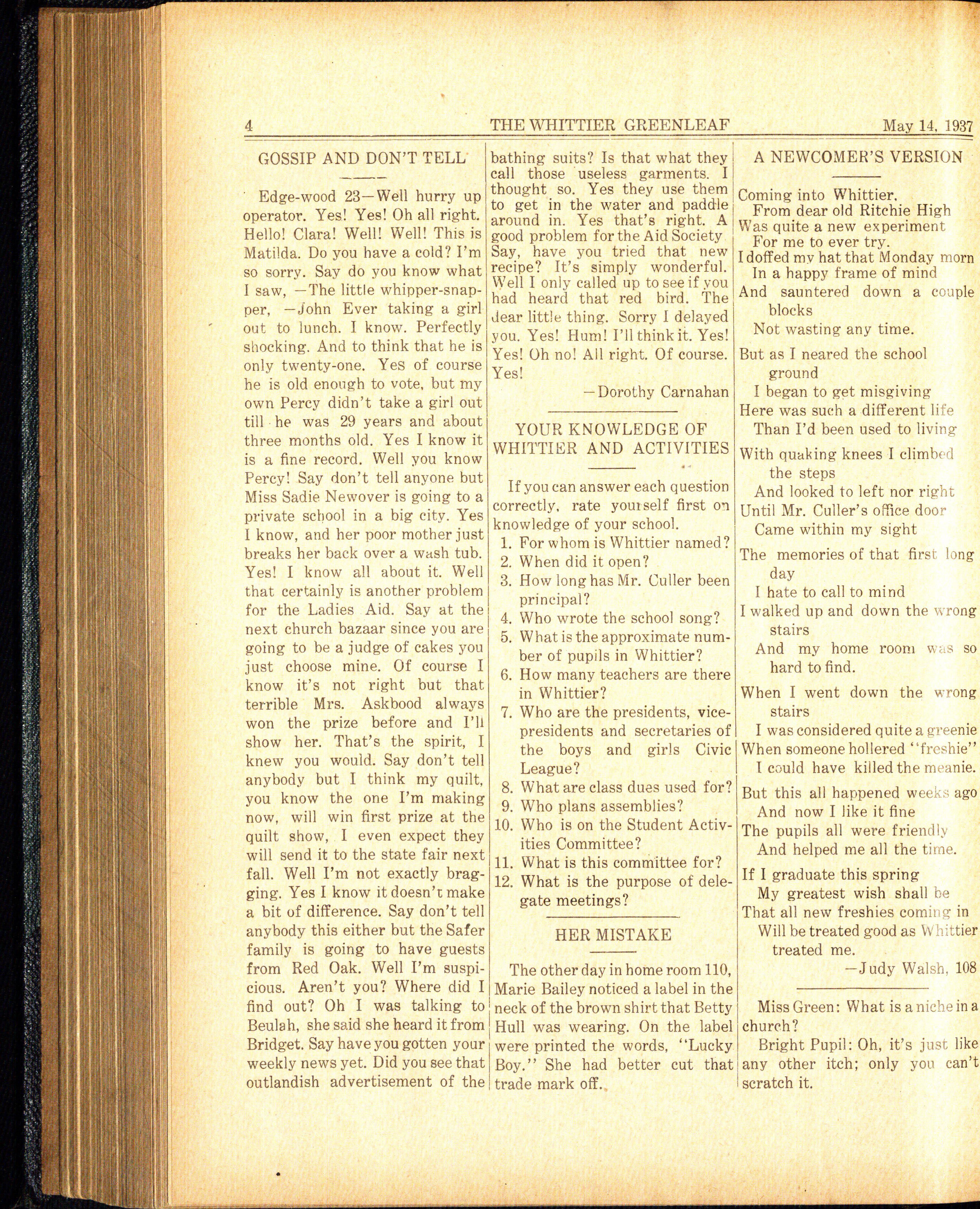 This semester's Greenleaf assembly which was held Friday the 19th, was one of the m ost novel of Whittier's assembl i es. It was in form of a birthday party. This surprise party was given for Greenleaf (represent- ed by Bud Deeds). There was a birthday cake holding fourteen candles, for Greenleaf's fourteenth birthday. His godmother, Betty Hull, wished him well. Greenleaf received a paddling from the Boy. He also added two for good luck. Ouch! We wonder if it hurt . A package was presented to Greenleaf. Besides containing a present for him it had a prize 7A Class for the home room having the · 309 highest number of subscriptions