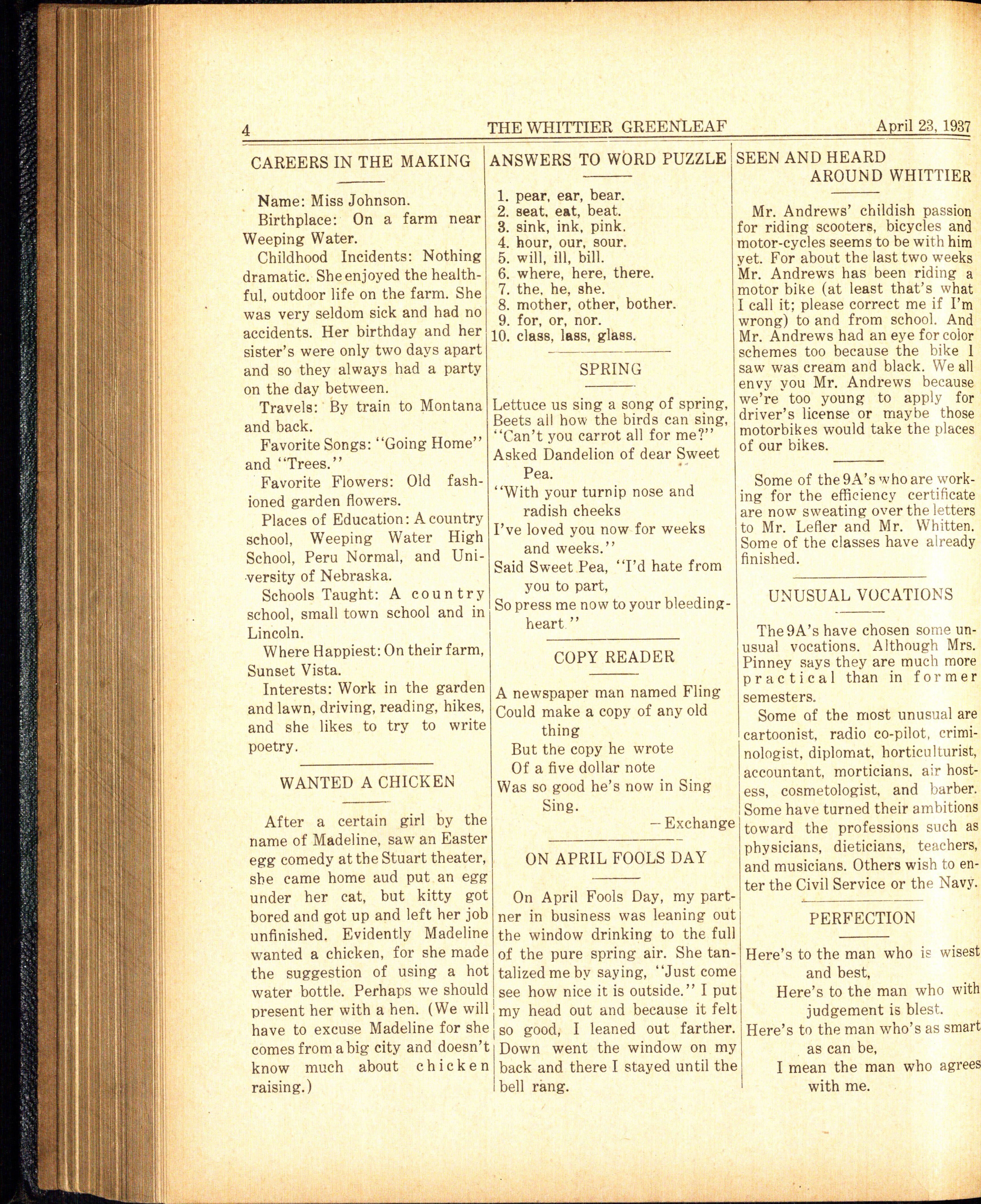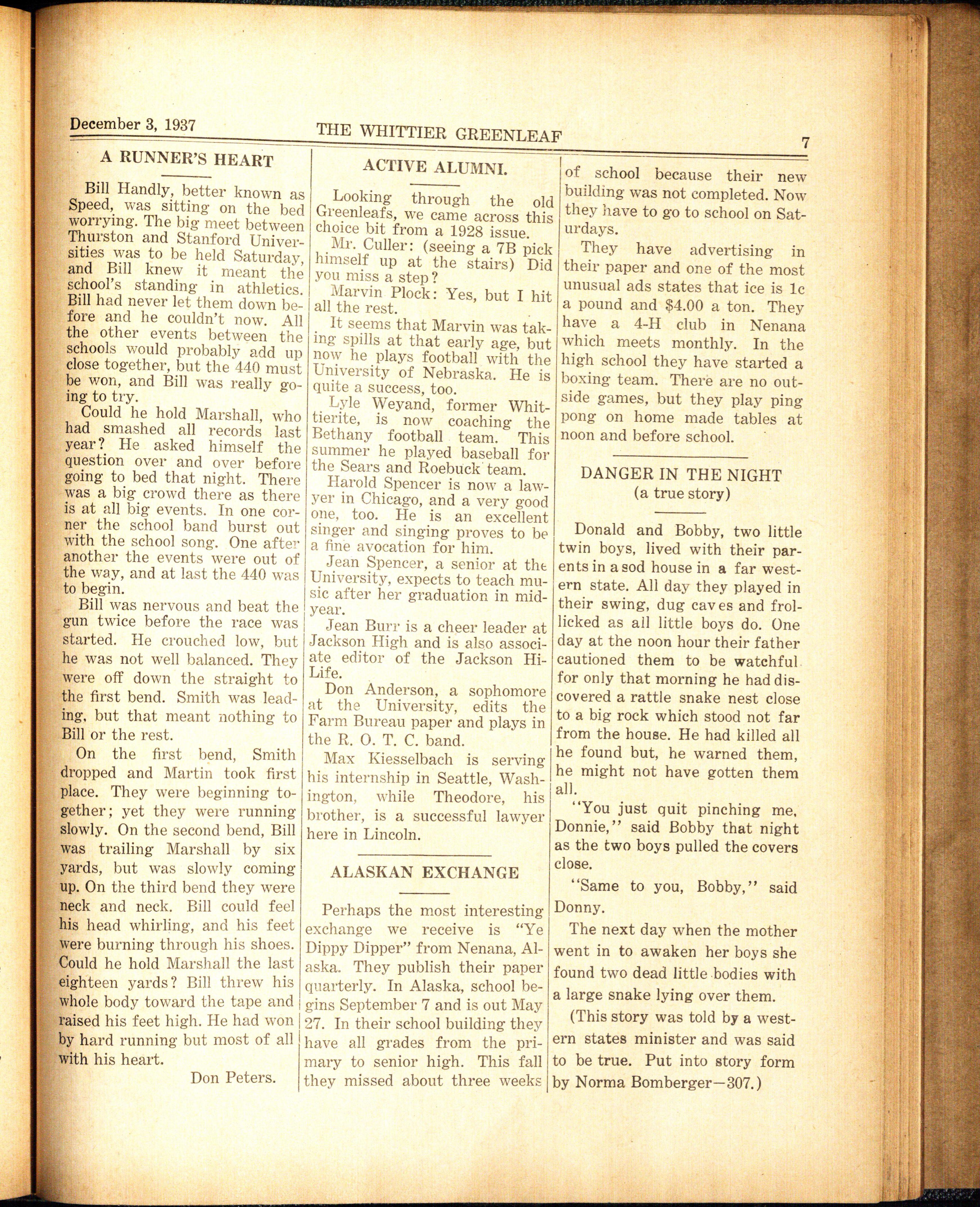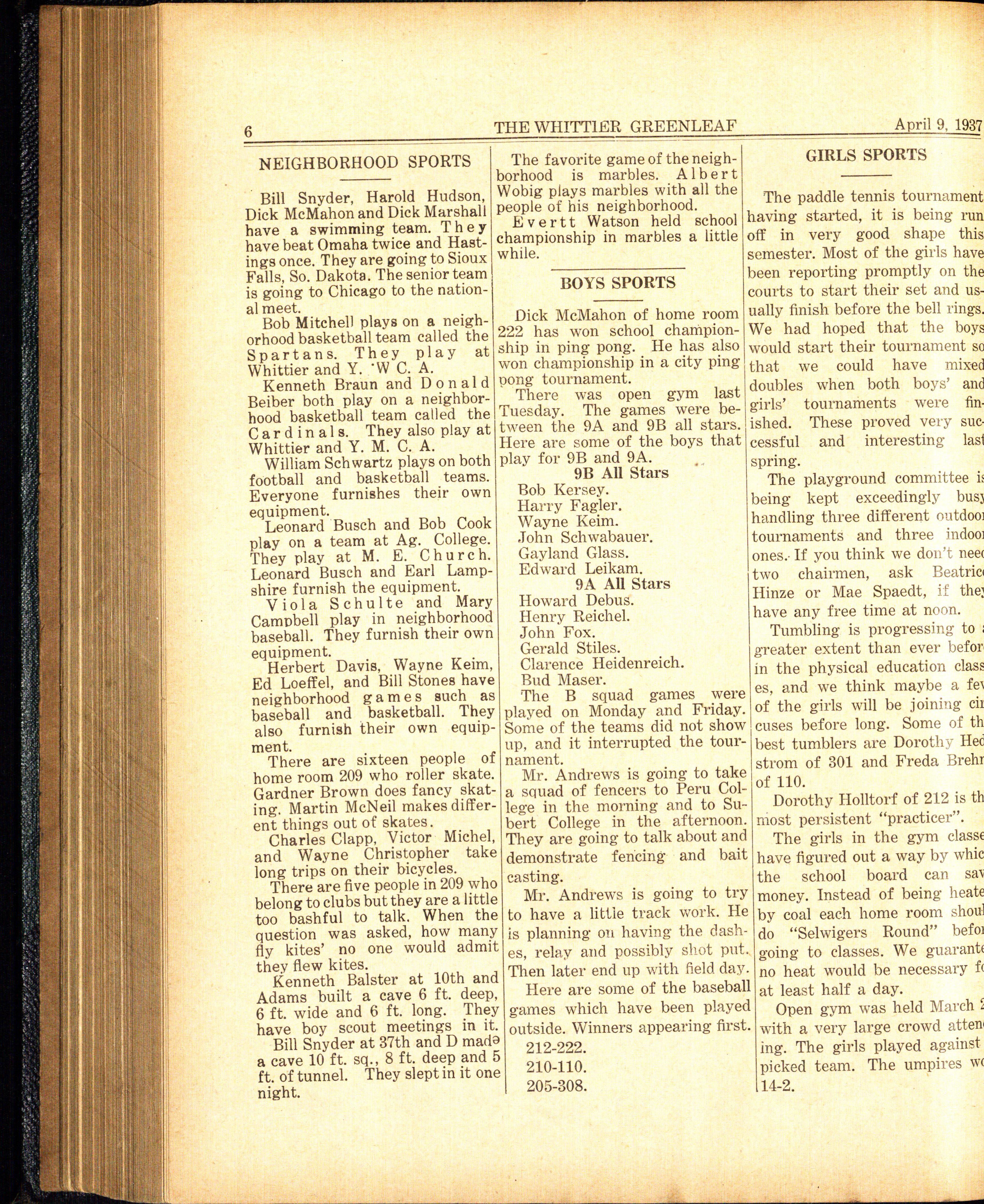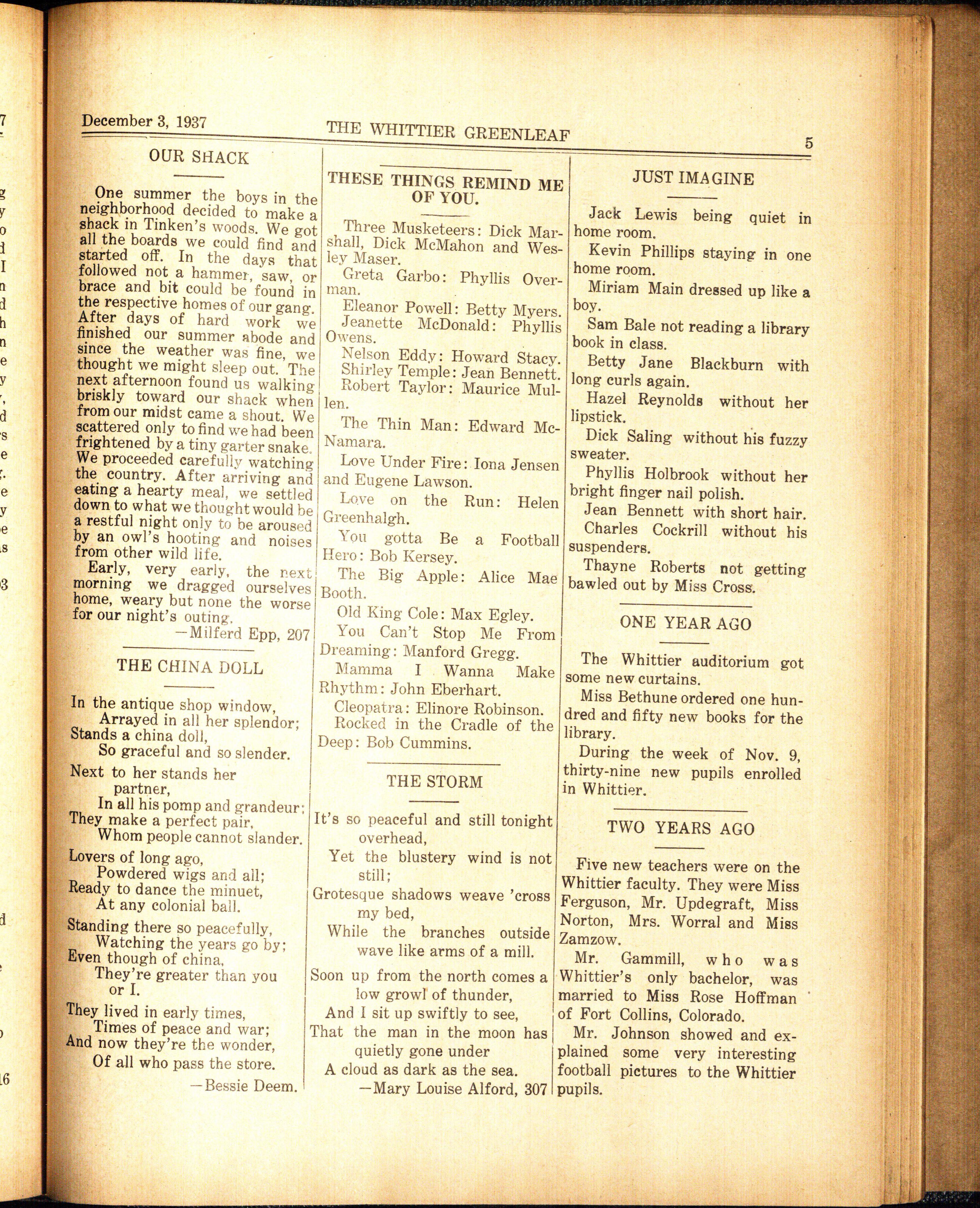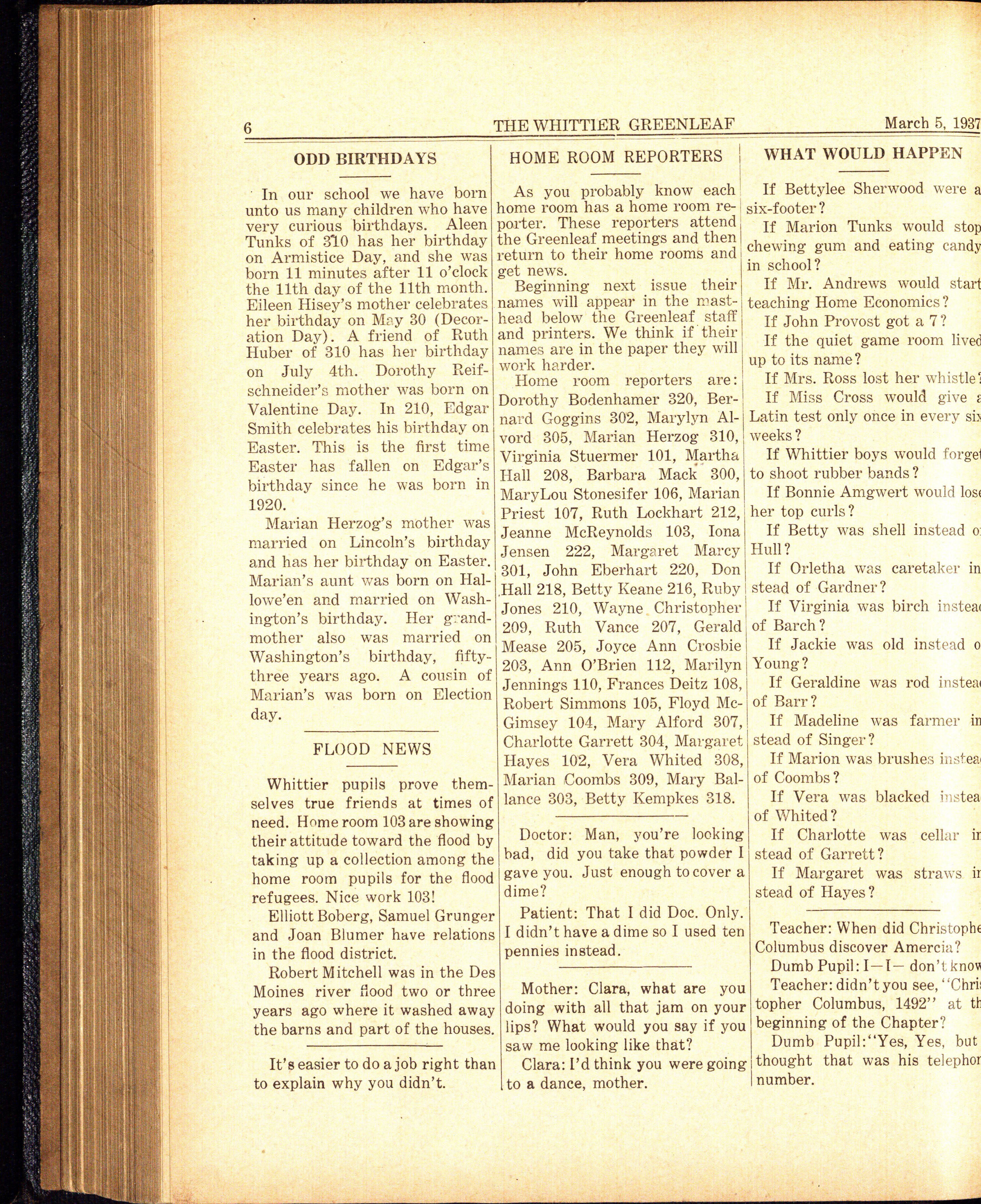 This semester's Greenleaf assembly which was held Friday the 19th, was one of the m ost novel of Whittier's assembl i es. It was in form of a birthday party. This surprise party was given for Greenleaf (represent- ed by Bud Deeds). There was a birthday cake holding fourteen candles, for Greenleaf's fourteenth birthday. His godmother, Betty Hull, wished him well. Greenleaf received a paddling from the Boy. He also added two for good luck. Ouch! We wonder if it hurt . A package was presented to Greenleaf. Besides containing a present for him it had a prize 7A Class for the home room having the · 309 highest number of subscriptions