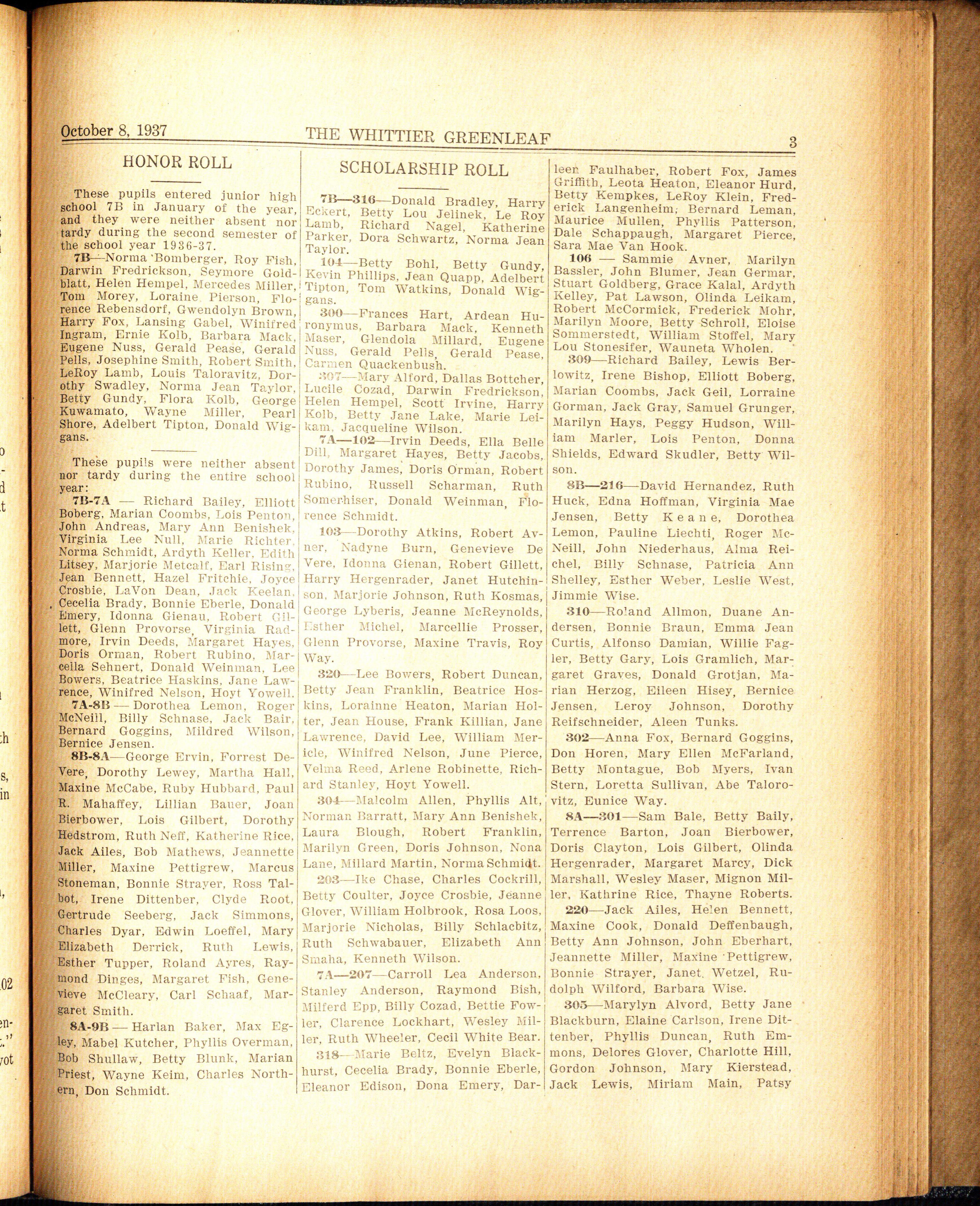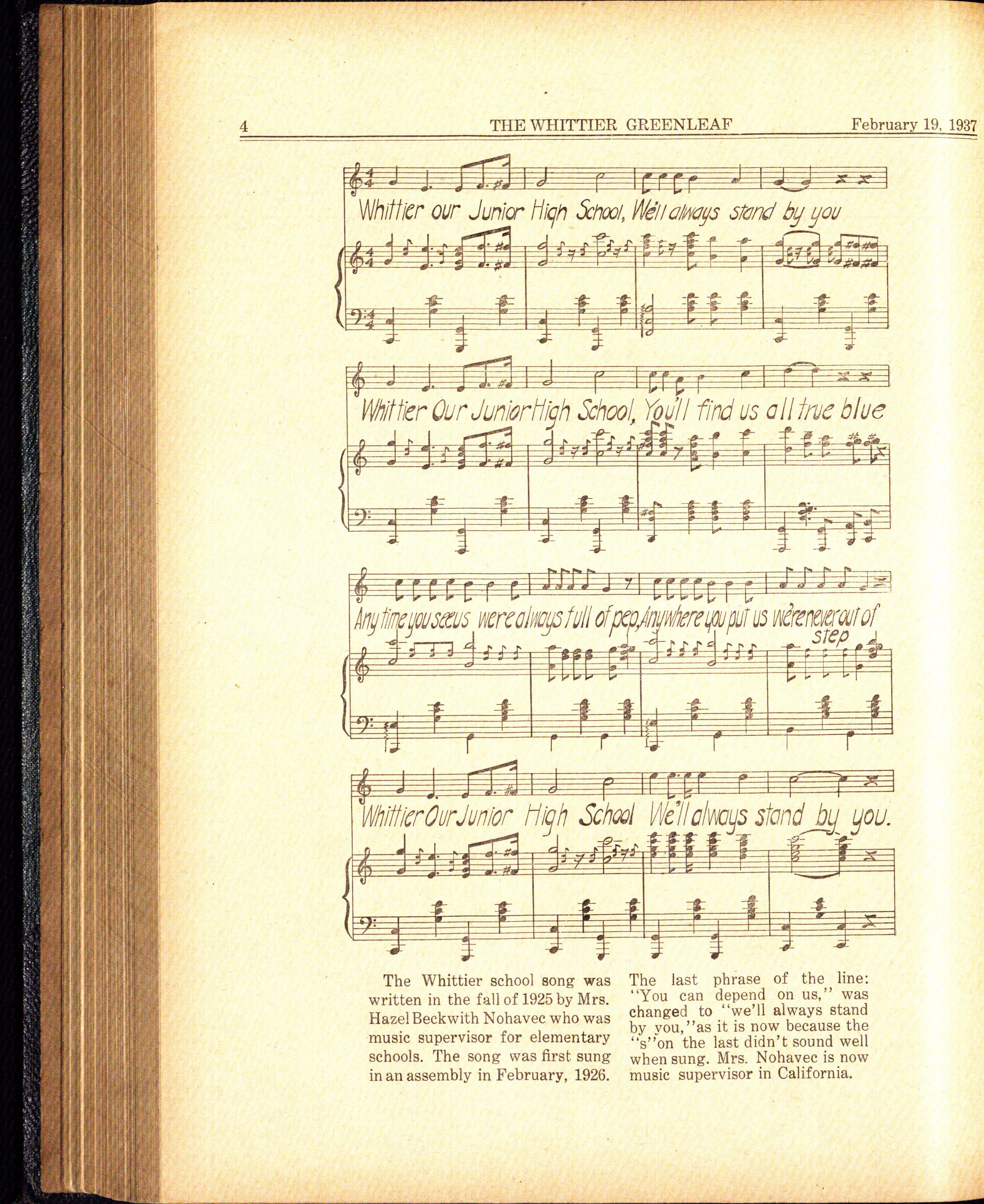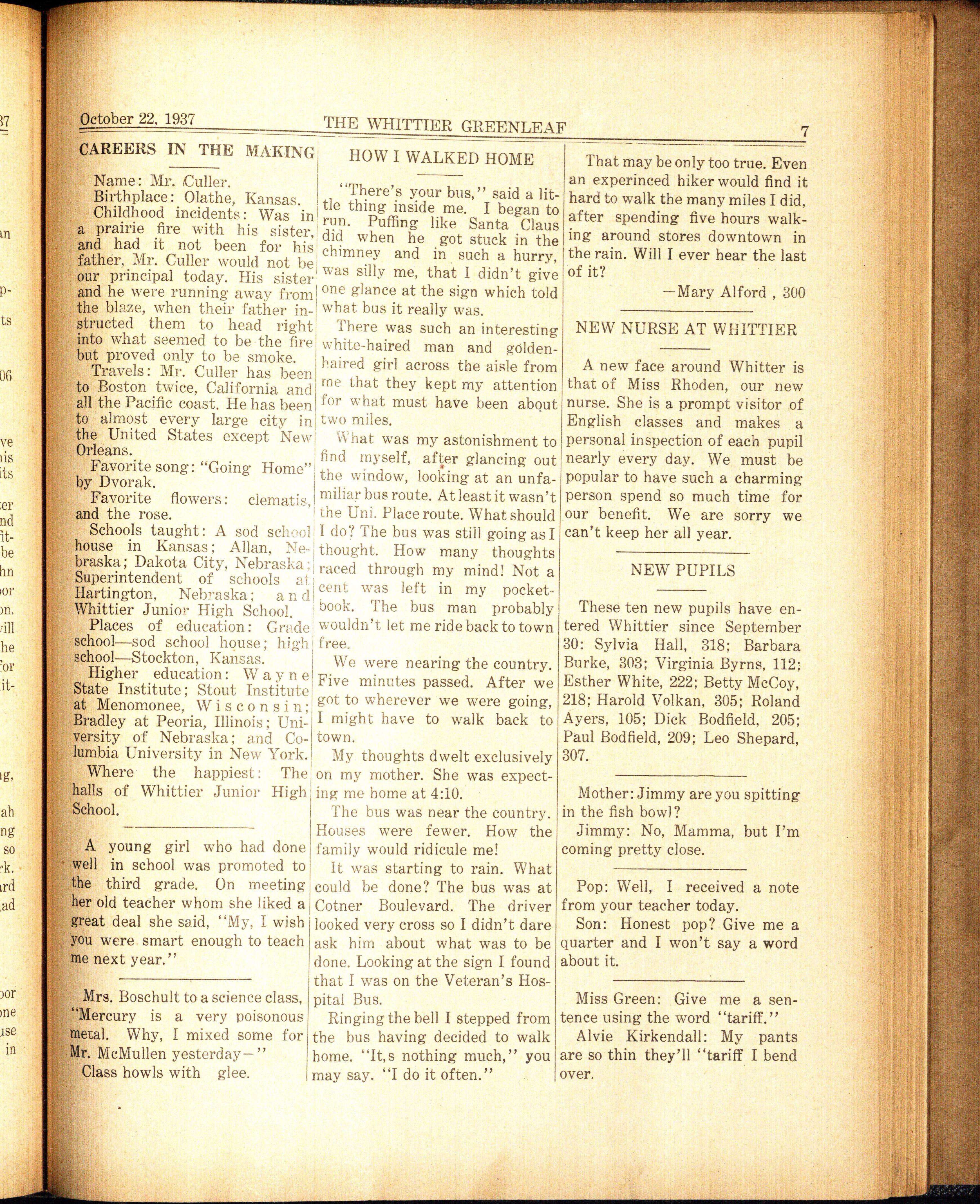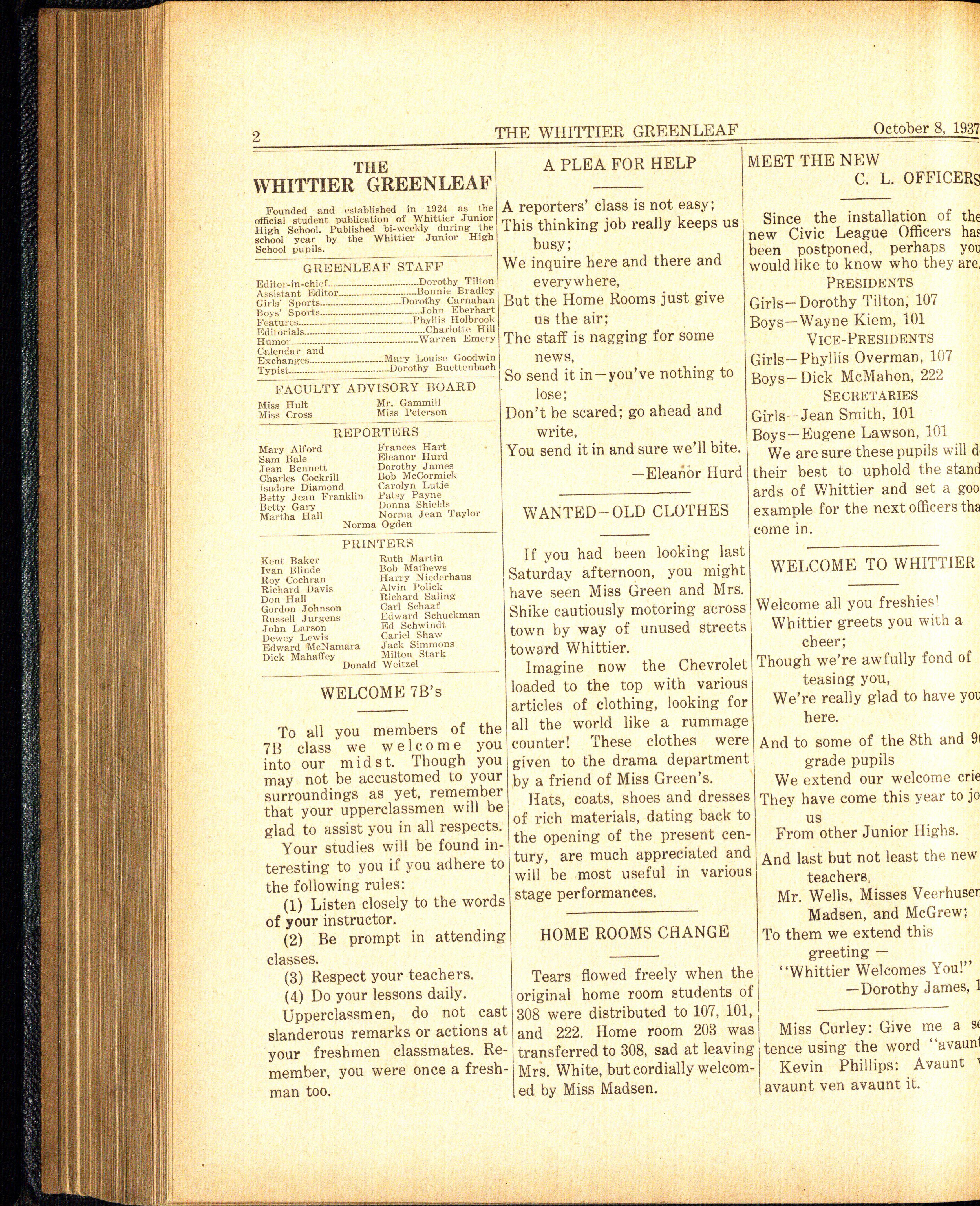 To the incoming 7B's and other newcomers, the teachers and pupils of Whittier extend their heartiest greetings. We hope that you will soon feel at home within our portals and wish you luck and happiness on your journey over the road of knowledge.