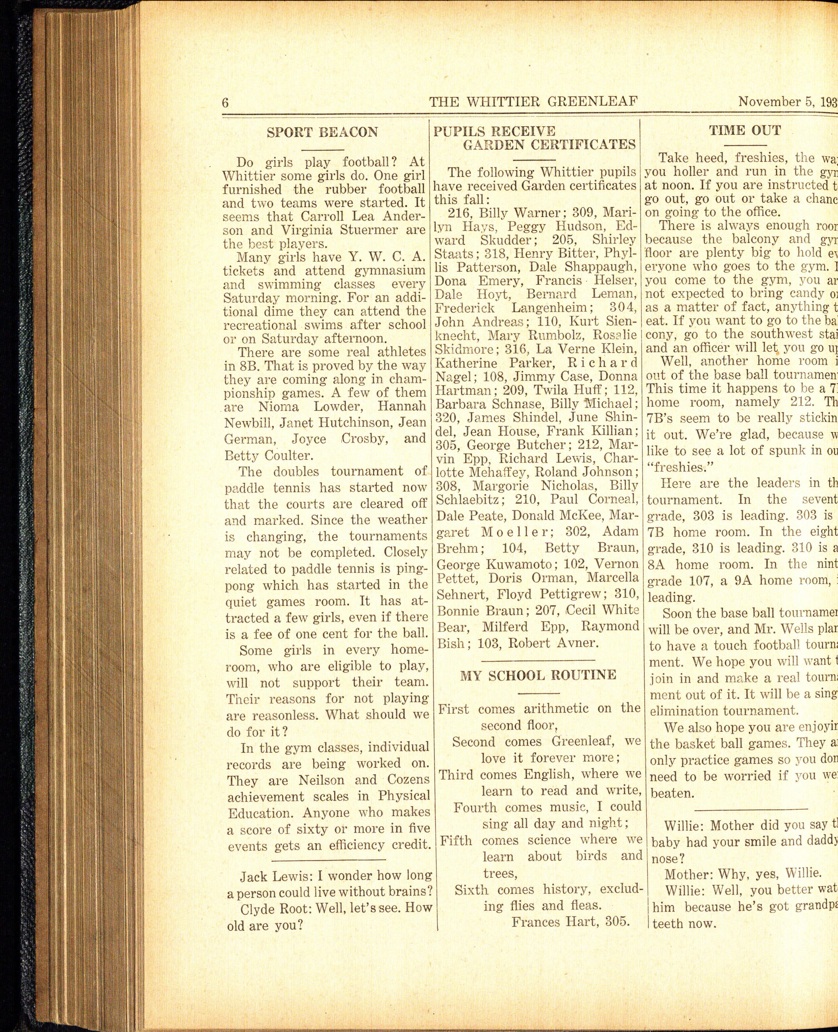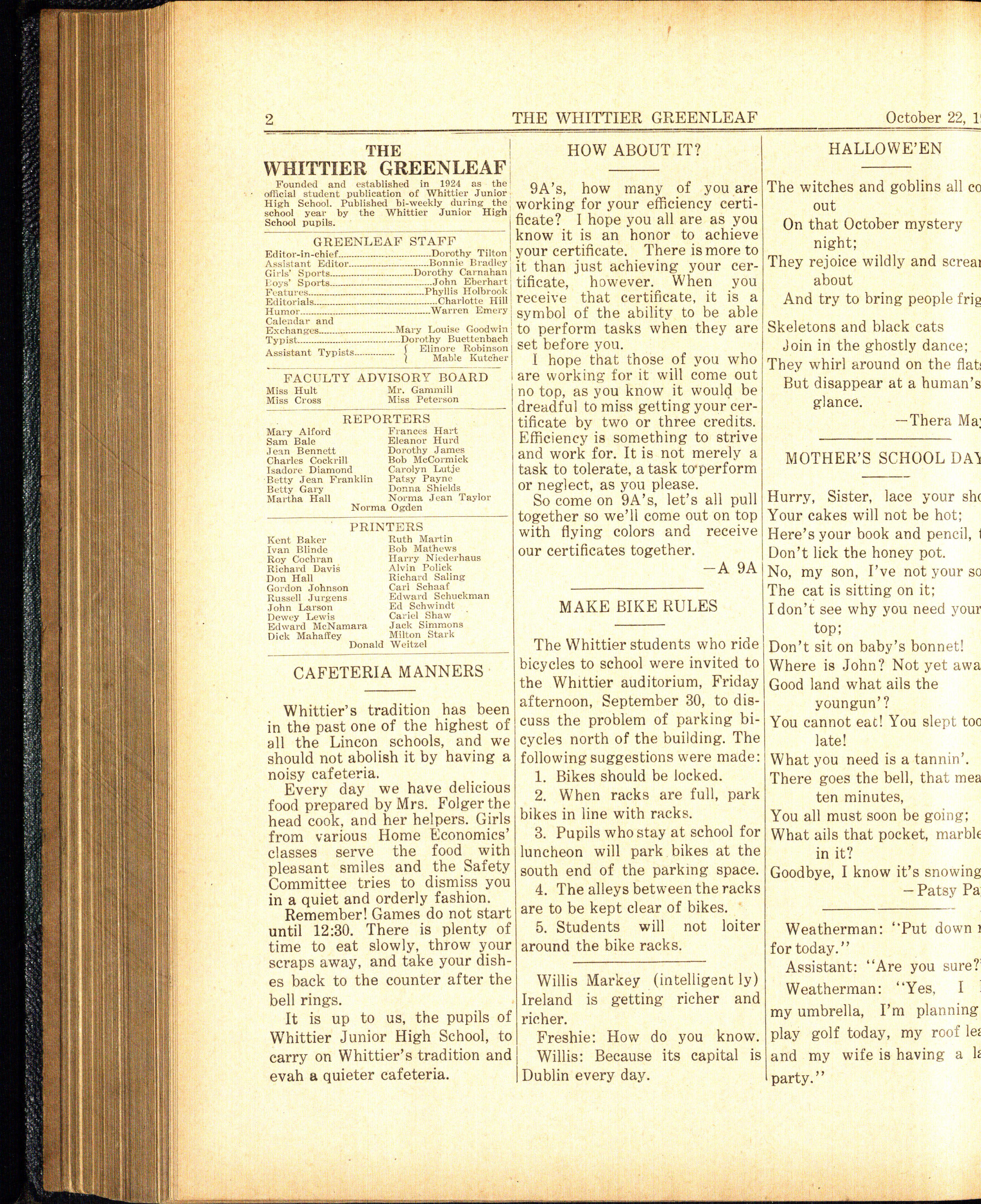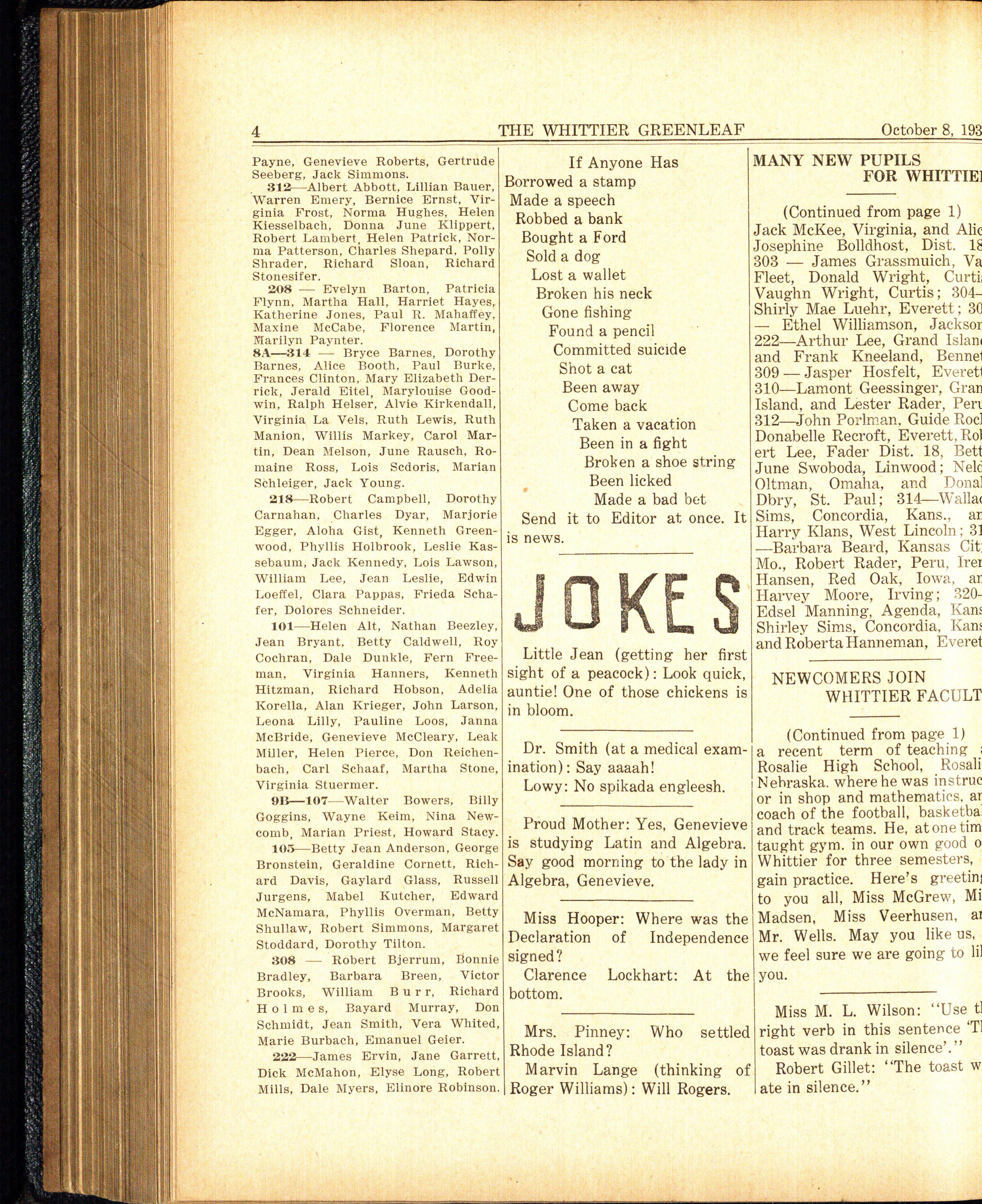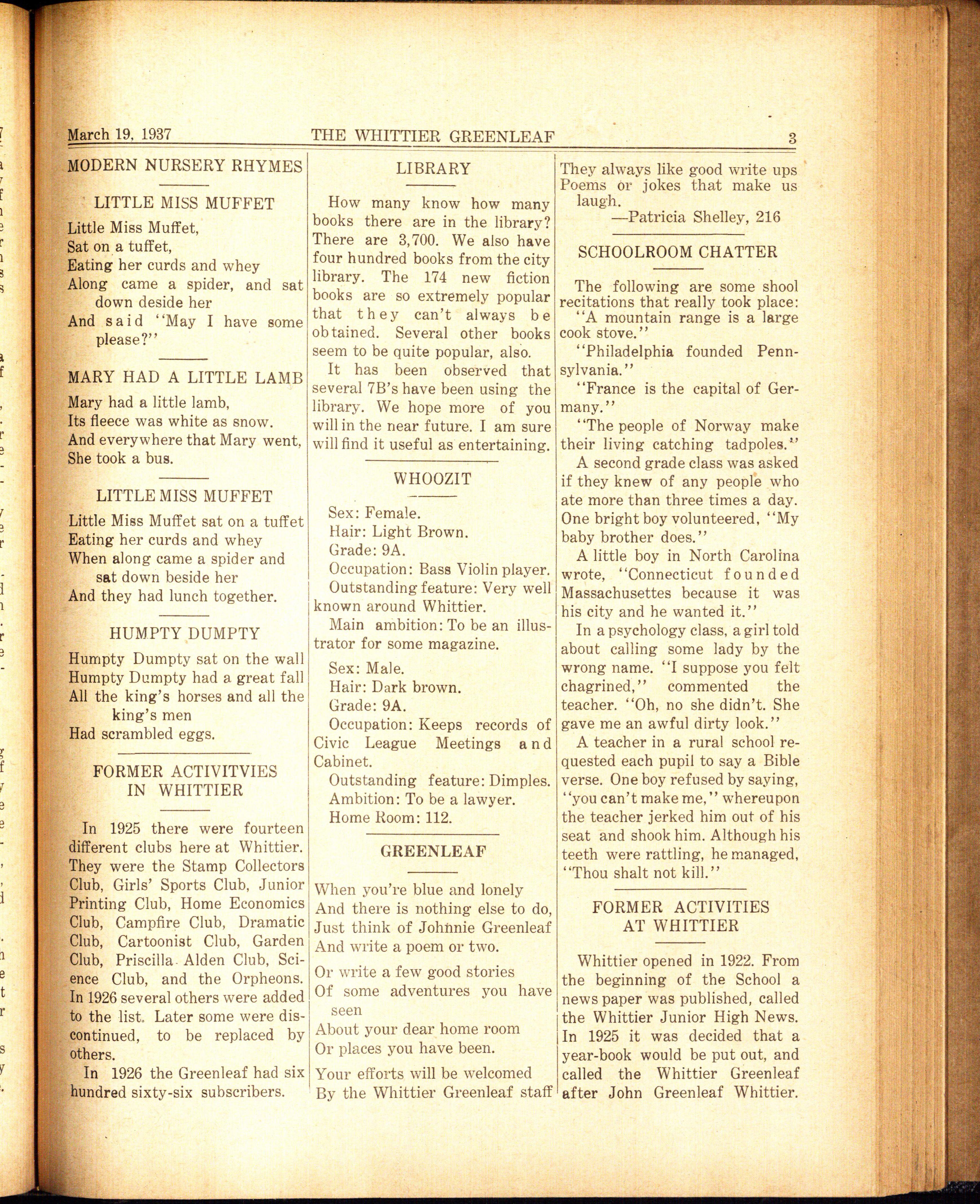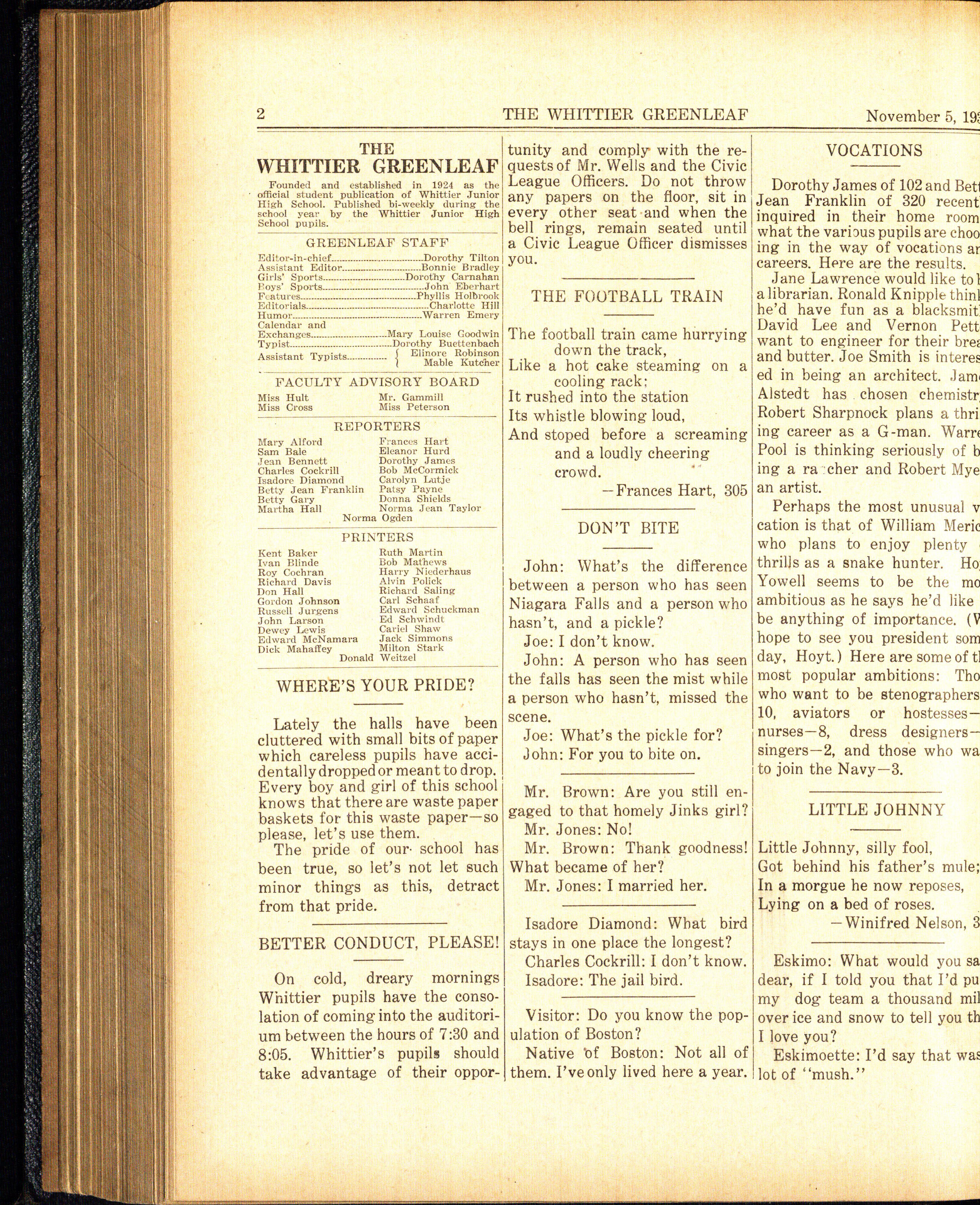 To the incoming 7B's and other newcomers, the teachers and pupils of Whittier extend their heartiest greetings. We hope that you will soon feel at home within our portals and wish you luck and happiness on your journey over the road of knowledge.