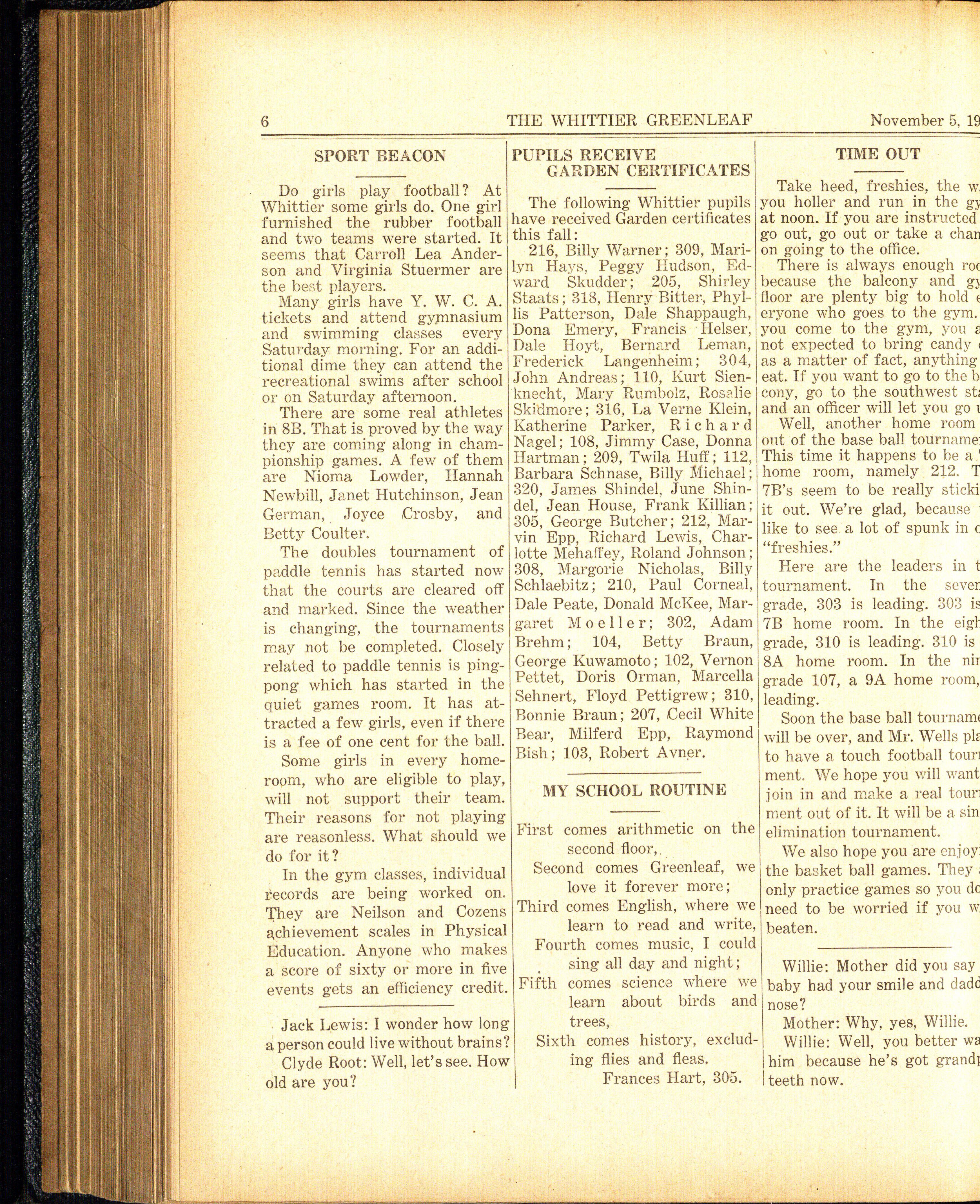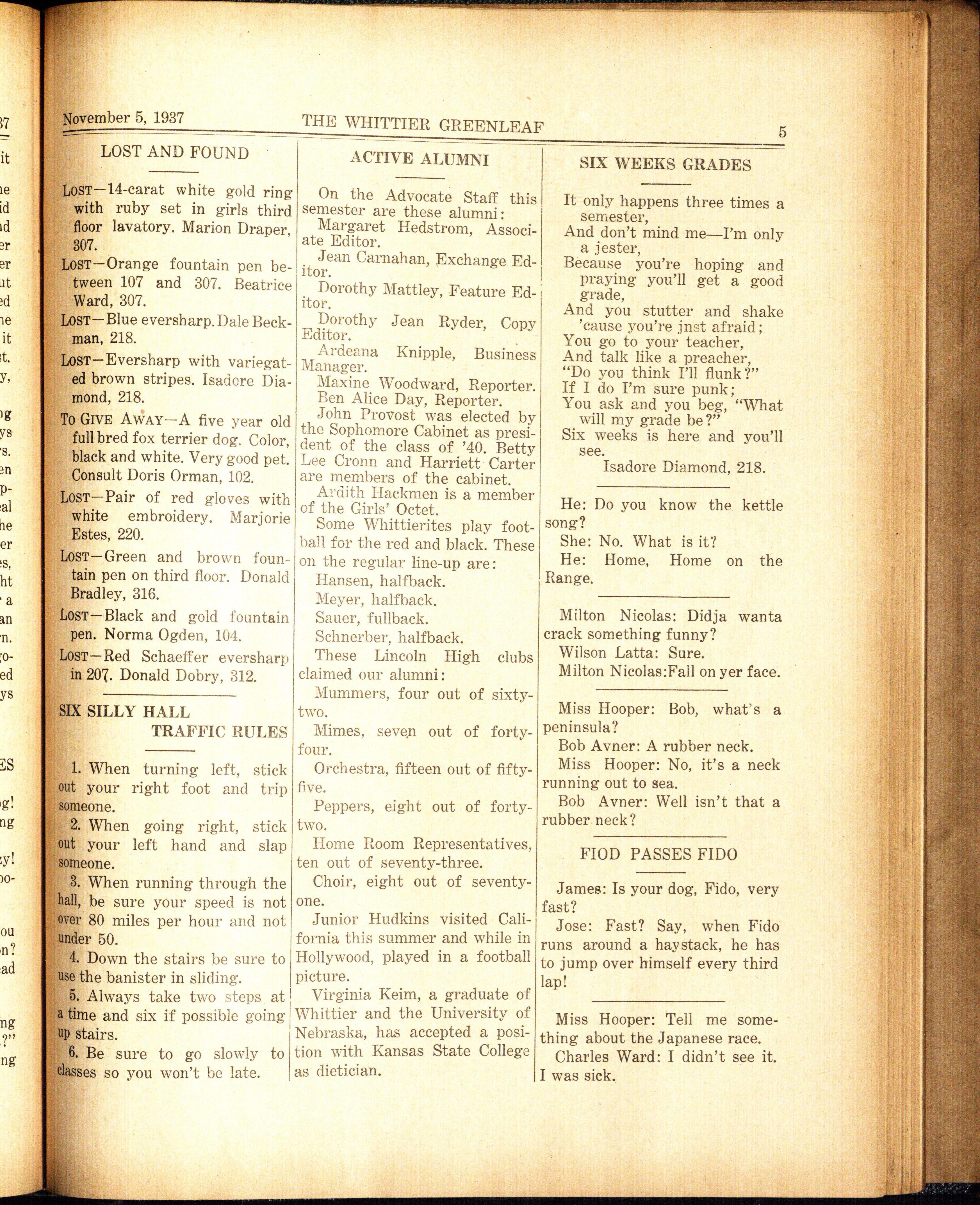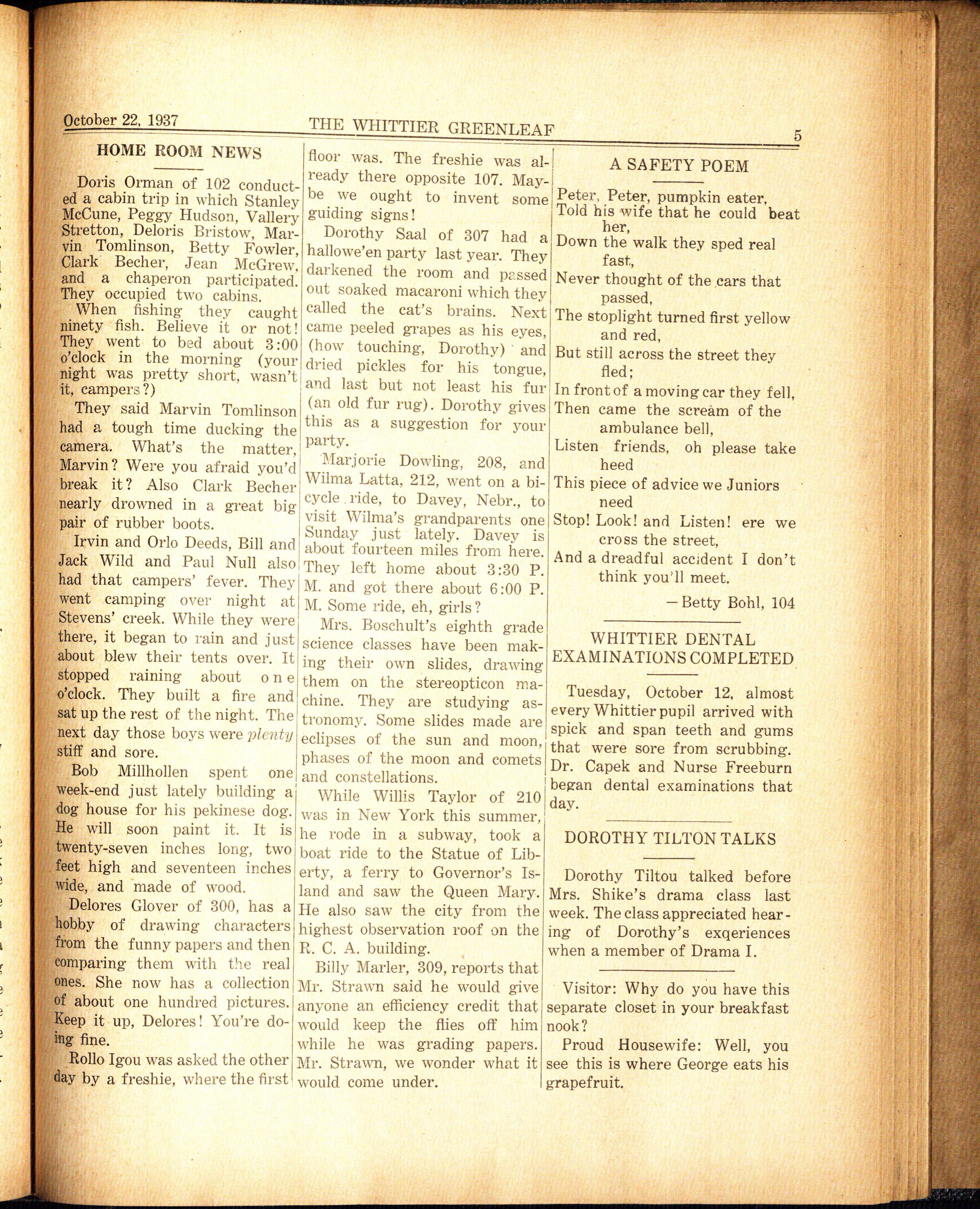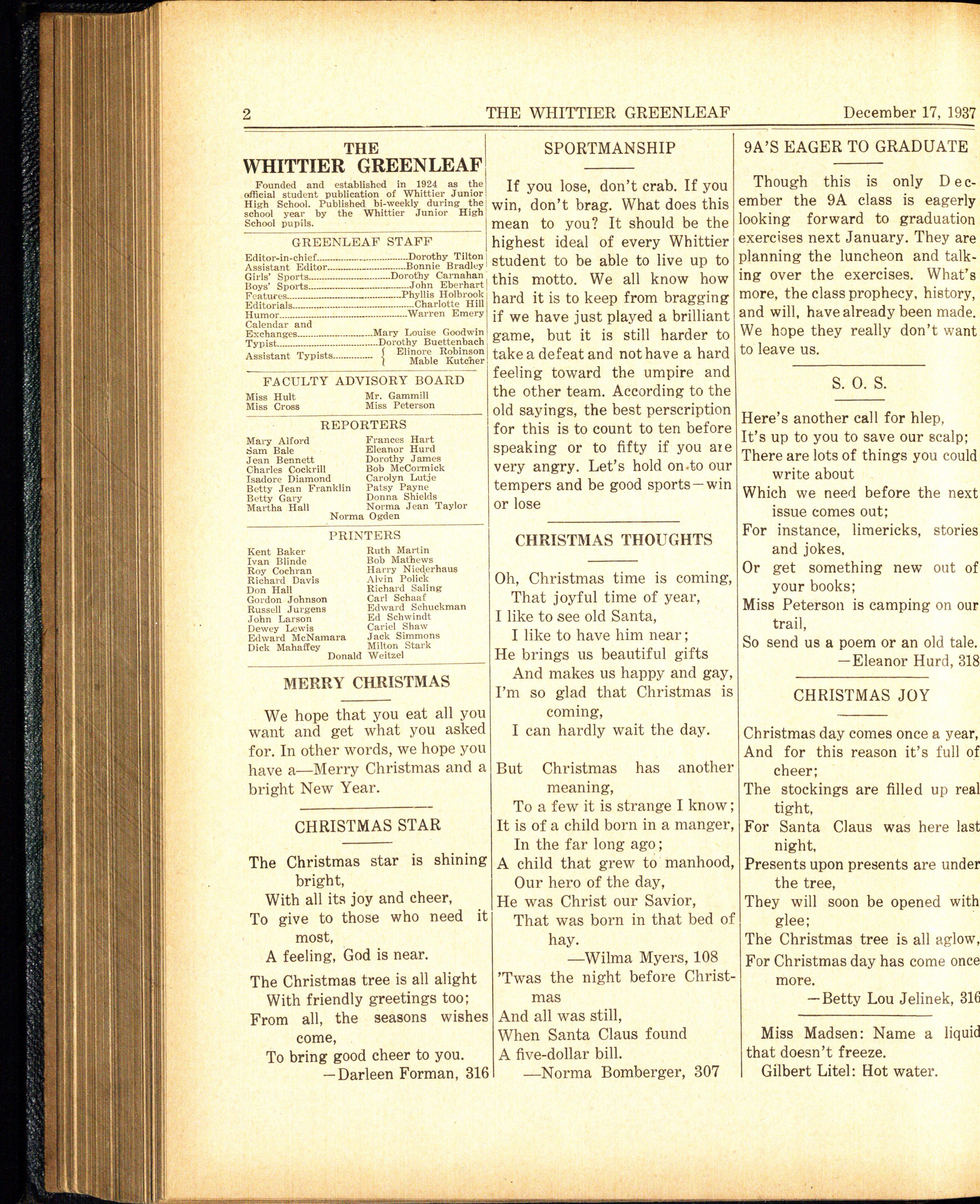 To the incoming 7B's and other newcomers, the teachers and pupils of Whittier extend their heartiest greetings. We hope that you will soon feel at home within our portals and wish you luck and happiness on your journey over the road of knowledge.