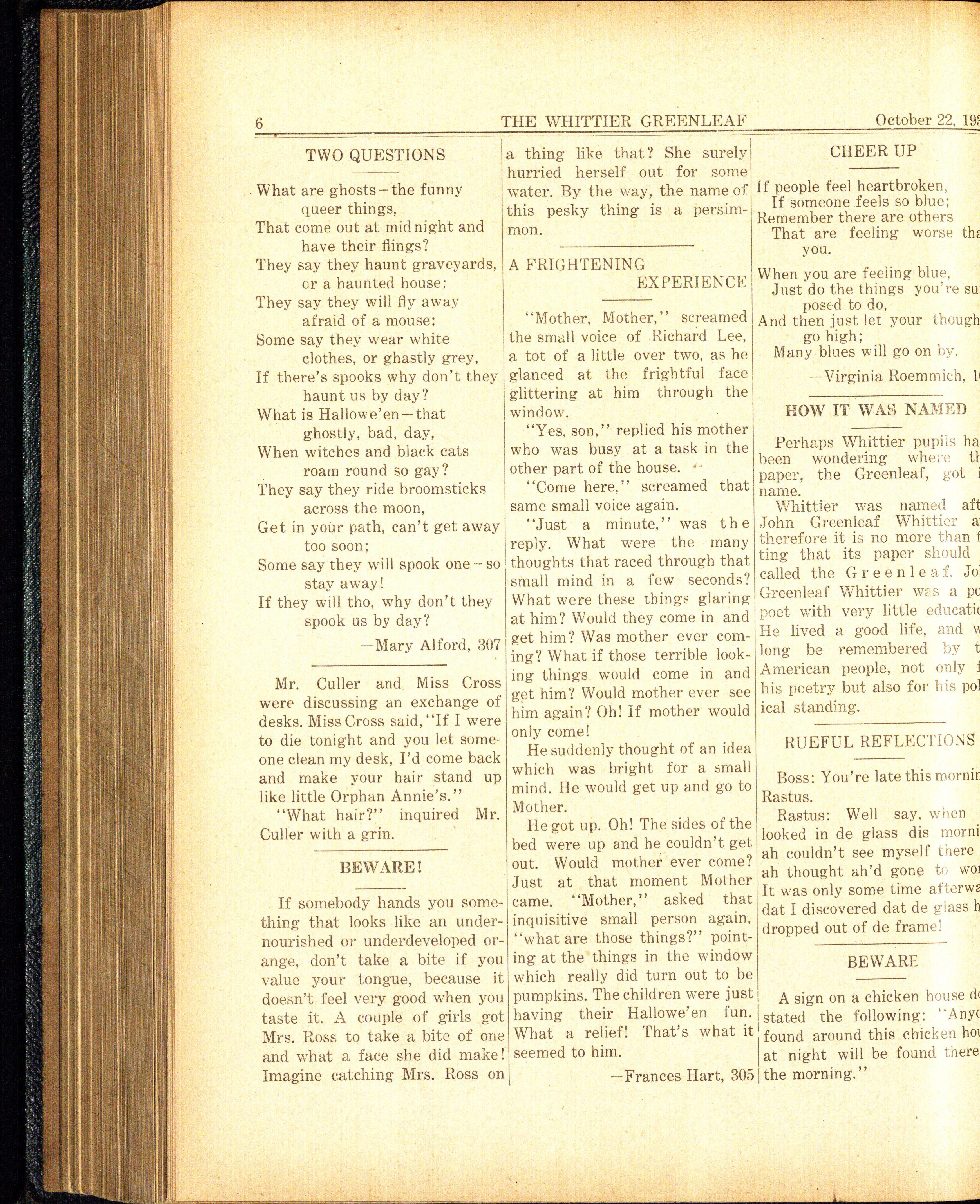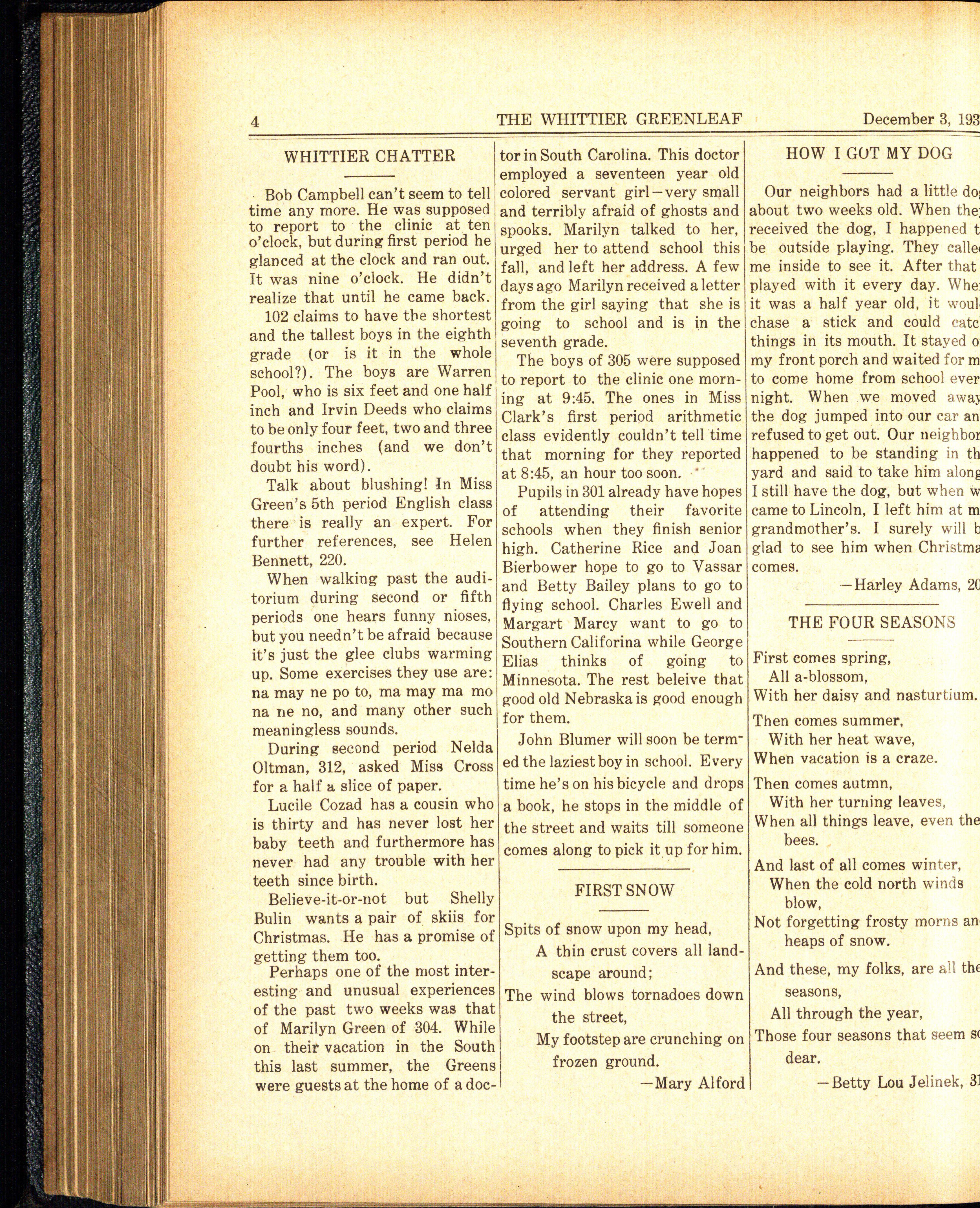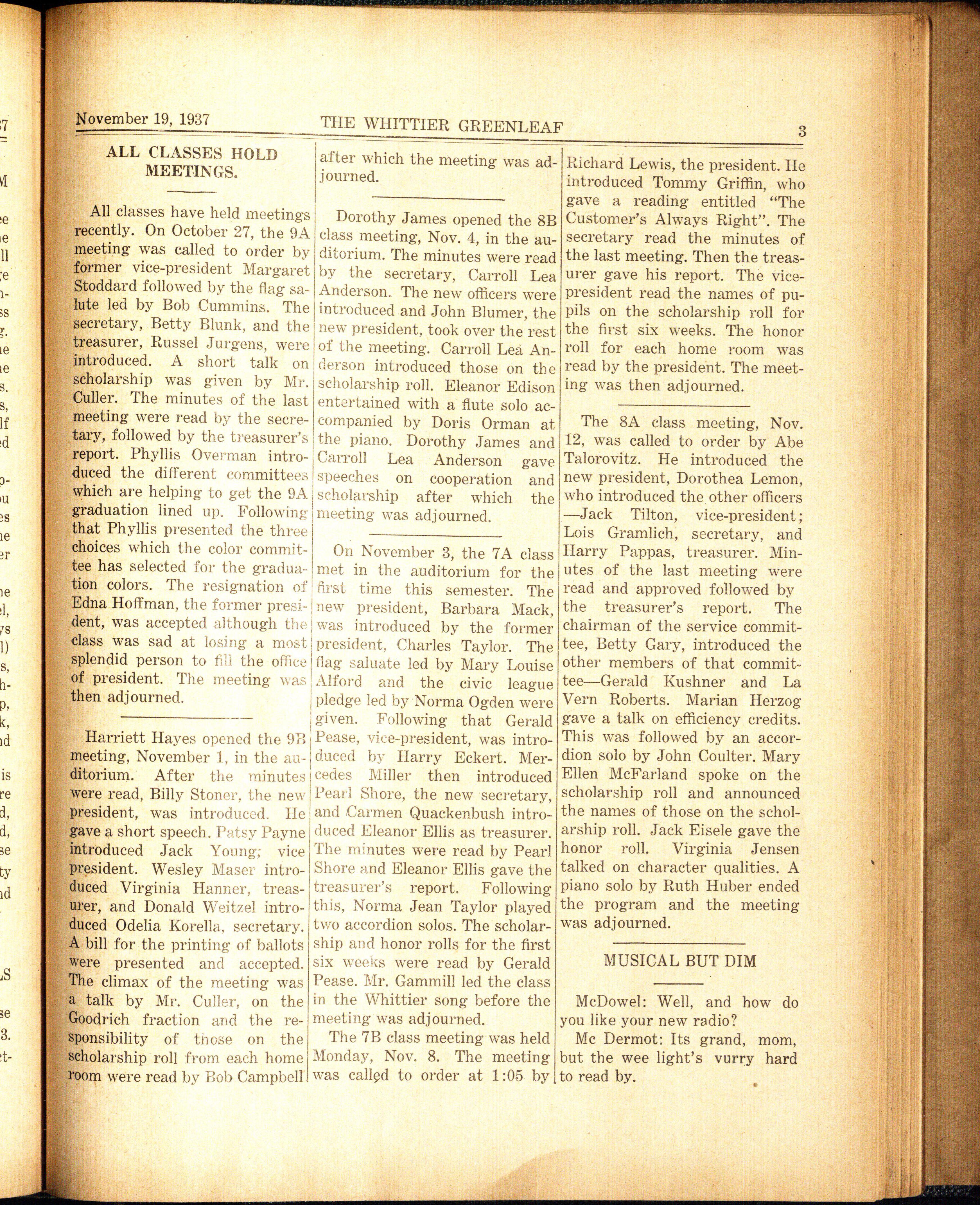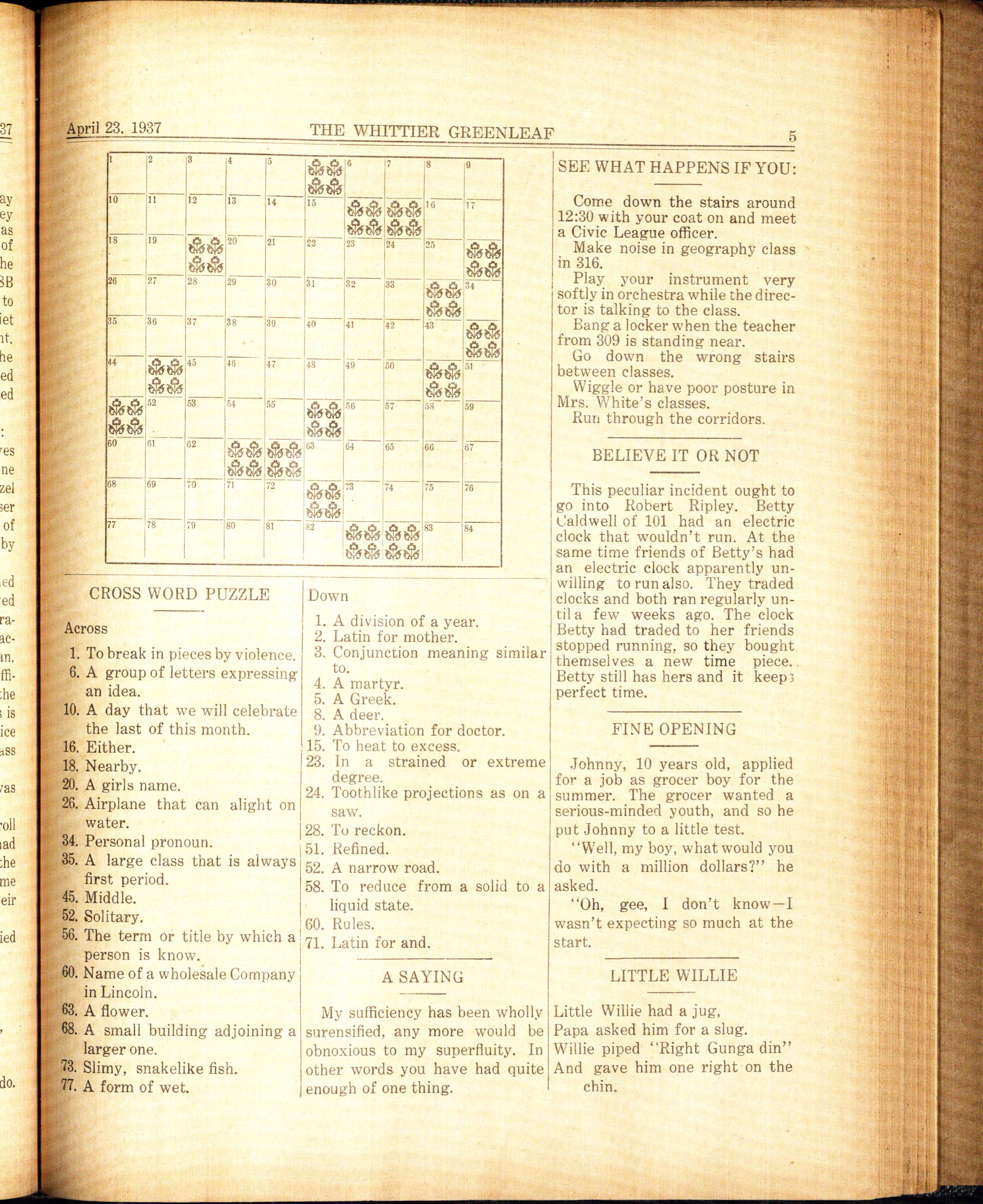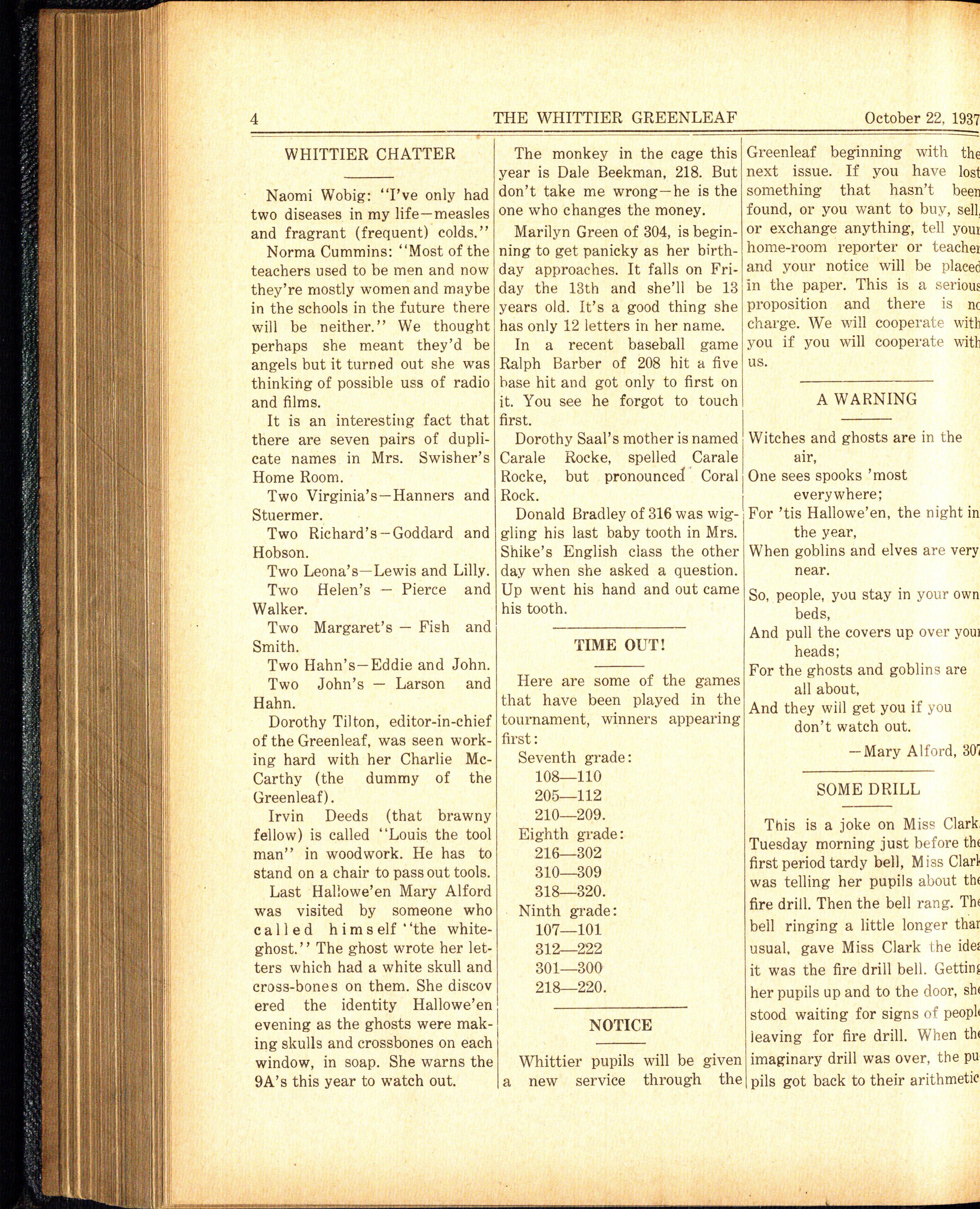 To the incoming 7B's and other newcomers, the teachers and pupils of Whittier extend their heartiest greetings. We hope that you will soon feel at home within our portals and wish you luck and happiness on your journey over the road of knowledge.